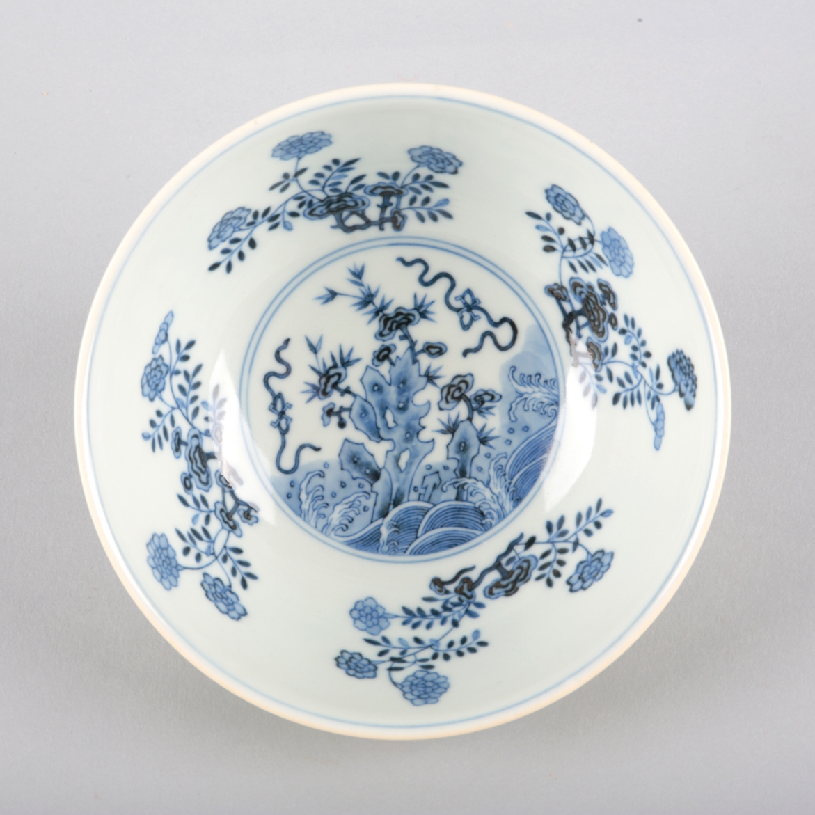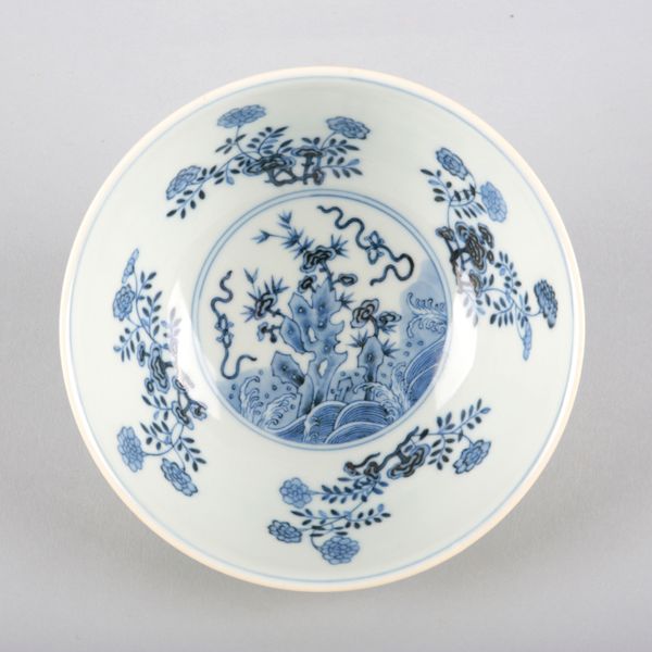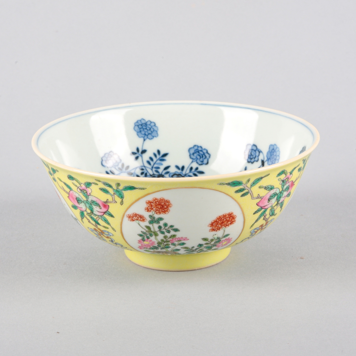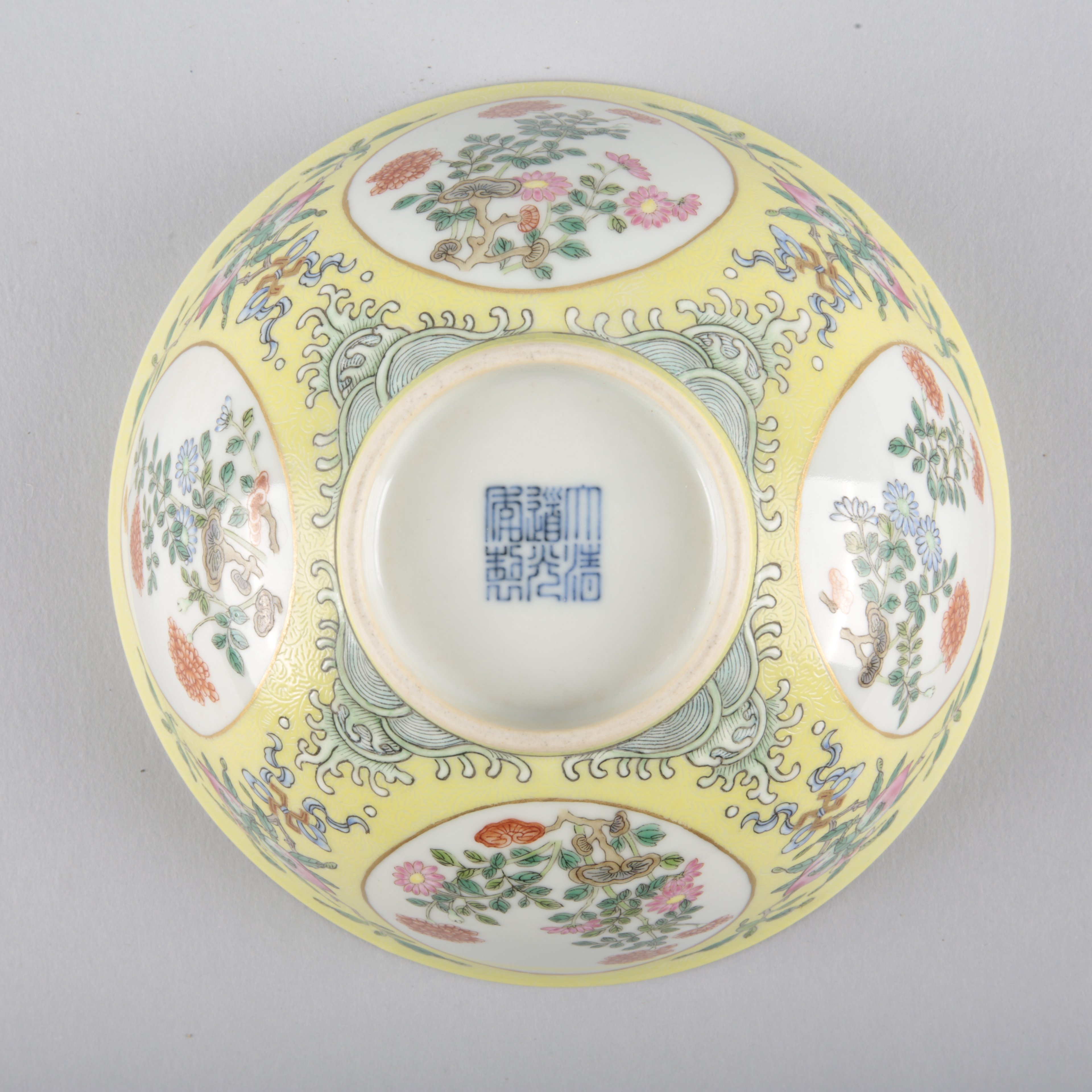 bearing a six character Daoguang seal mark to the base, the yellow ground decorated with four vignettes of blossoming flowers, the interior with a similar scene in blue and white and further sprays of flora, 6.5cm high x 15cm diameter