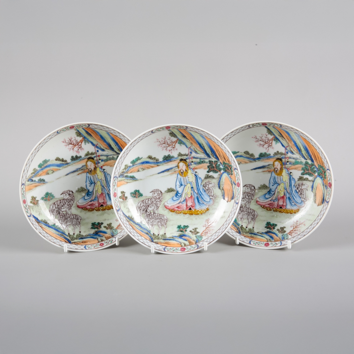 early Qing dynasty or later, decorated with a depiction of Su Wu, seated in a mountainous landscape amongst sheep and rich foliage, 14cm diameter (3)