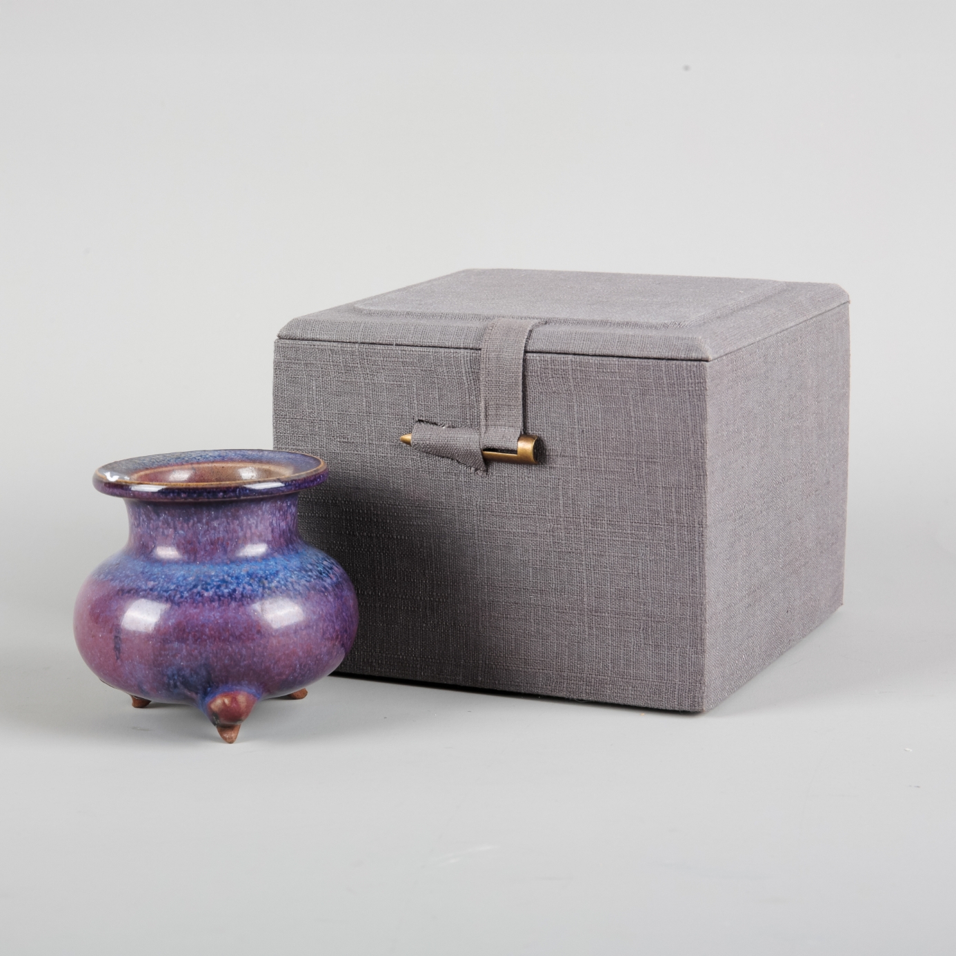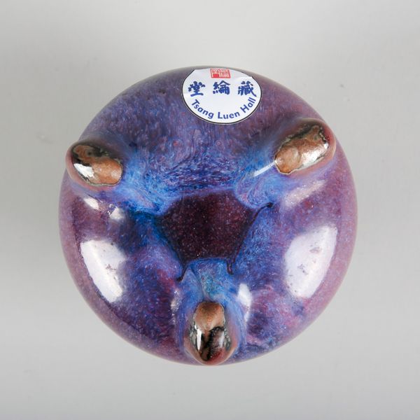 in Northern Song dynasty style, with an everted dished rim and squat globular body with three short cabriole legs, covered in a rich streaked purple on blue glaze, 7cm high x 7.5cm diameter, with an associated fitted box, bearing a collection label to the base 'Tsang Luen Hall'