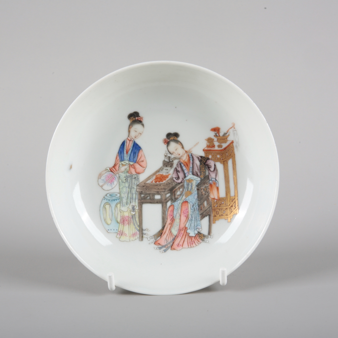 possibly Yongzheng or later, the interior of the bowl decorated with two ladies, one seated and painting, the other holding a fan, 12cm diameter