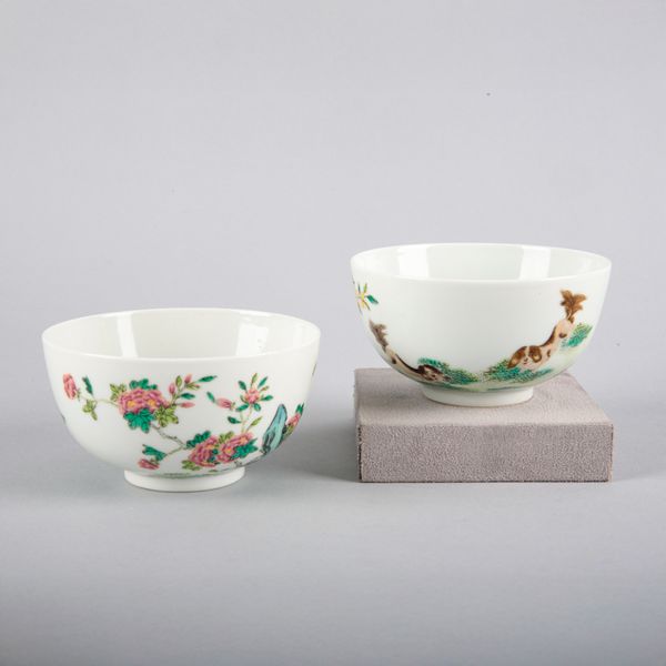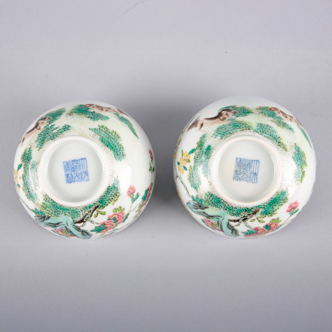 This unuasual and rare pair of bowls appears to be in good overall condition, without major damage or restoration. There is some wear to the decoration apparent. One bowl has a small enamel chip to to a leaf, and a very small rim chip. Small firing imperfections. Otherwise ok.