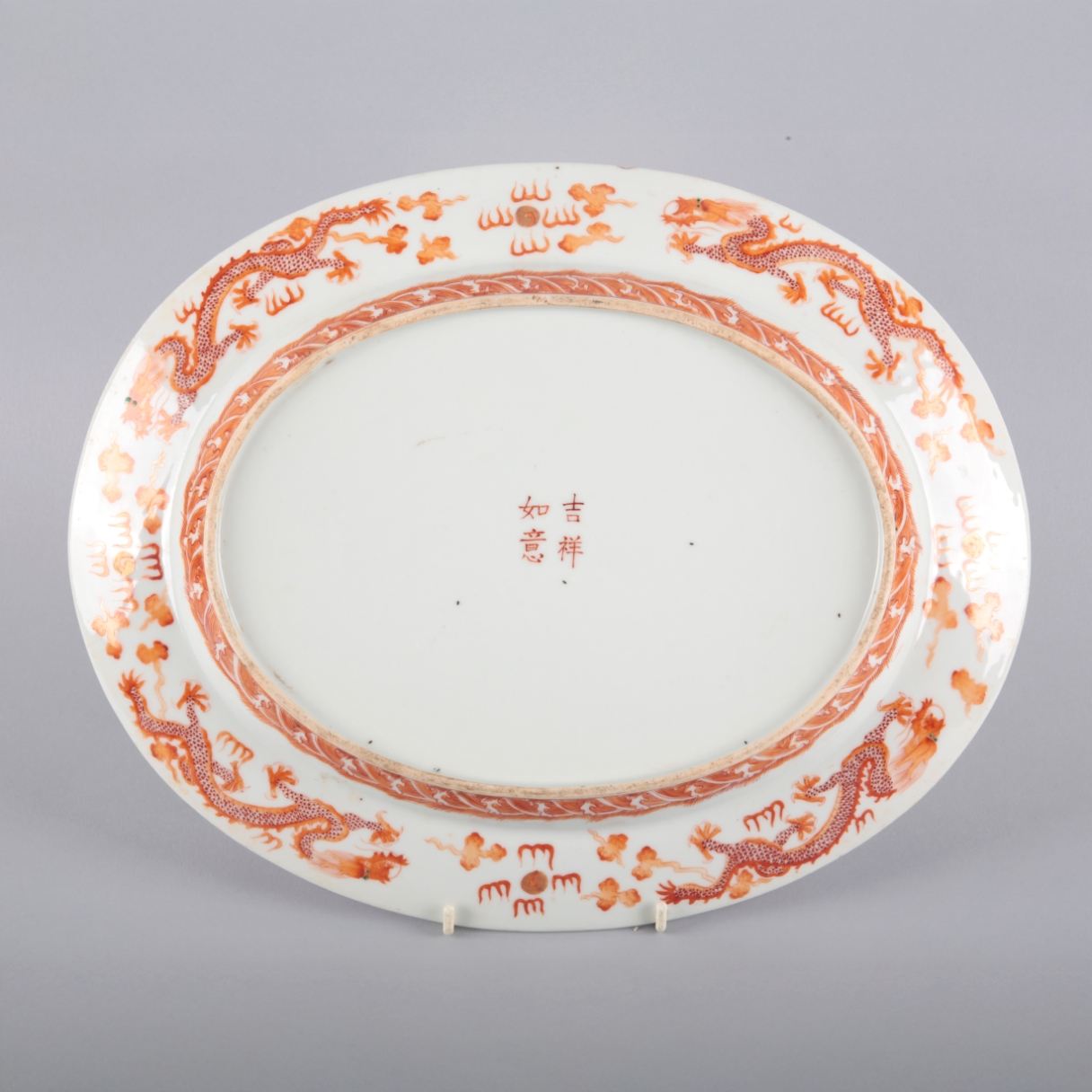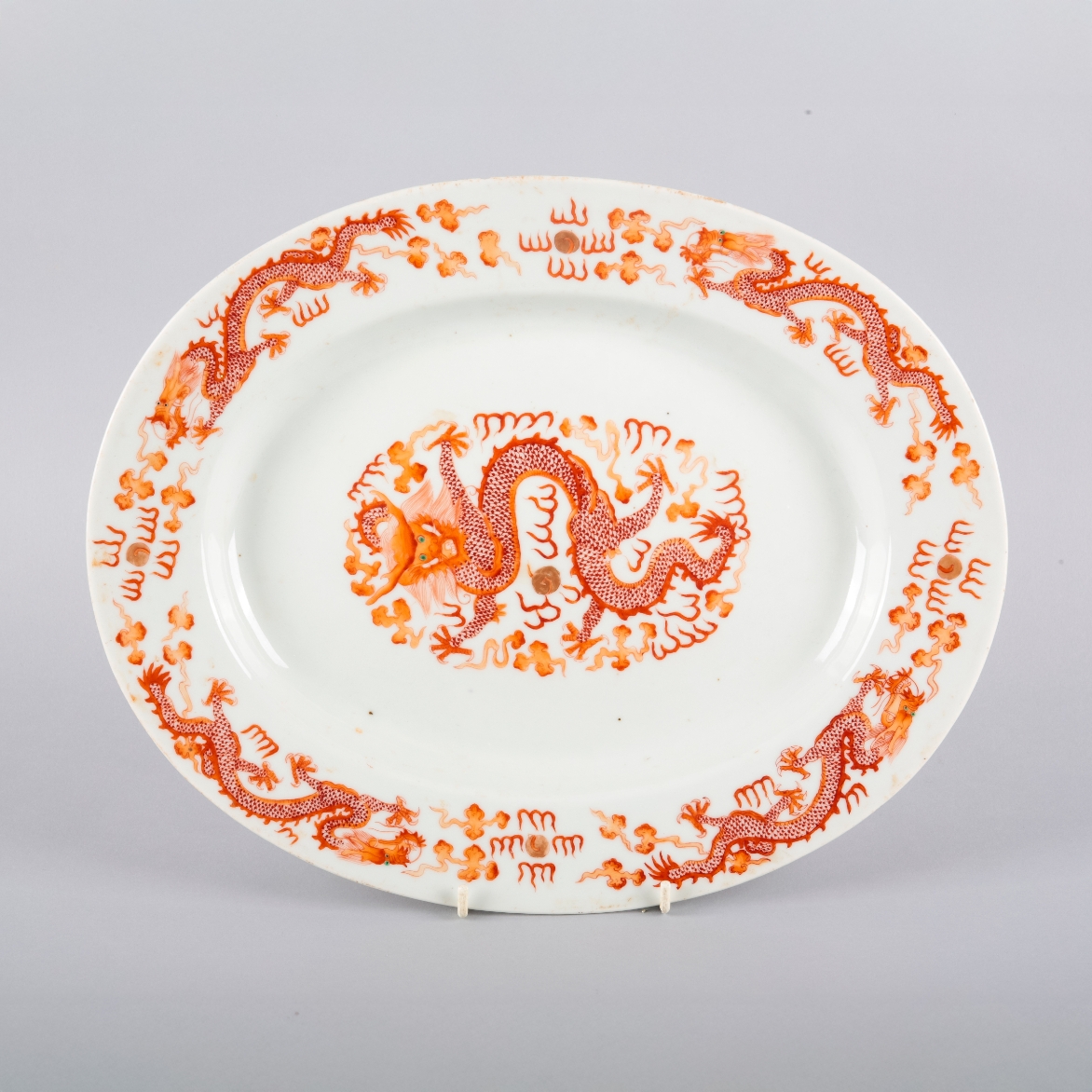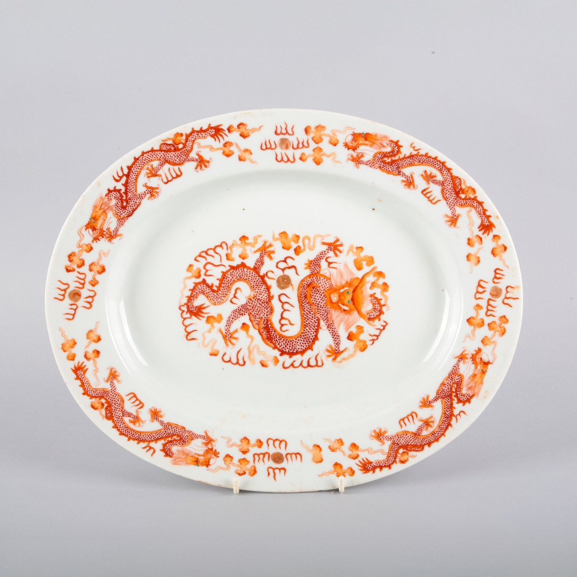 A CHINESE PORCELAIN IRON RED AND GILT 'DRAGON' SERVING PLATTER