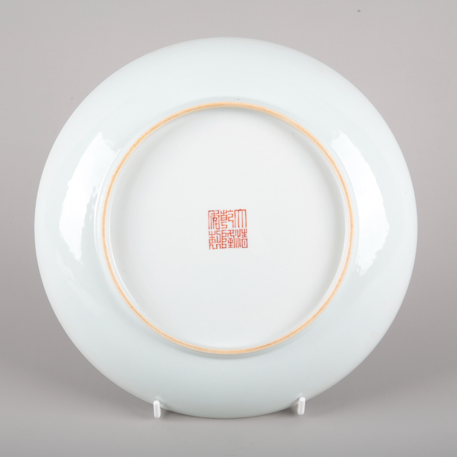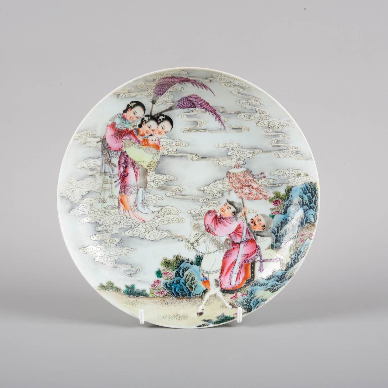 bearing a six character Qianlong seal mark to the base but later, decorated with three immortal women, one holding a baby, appearing from the clouds to two riders on horseback, 21.5cm diameter
