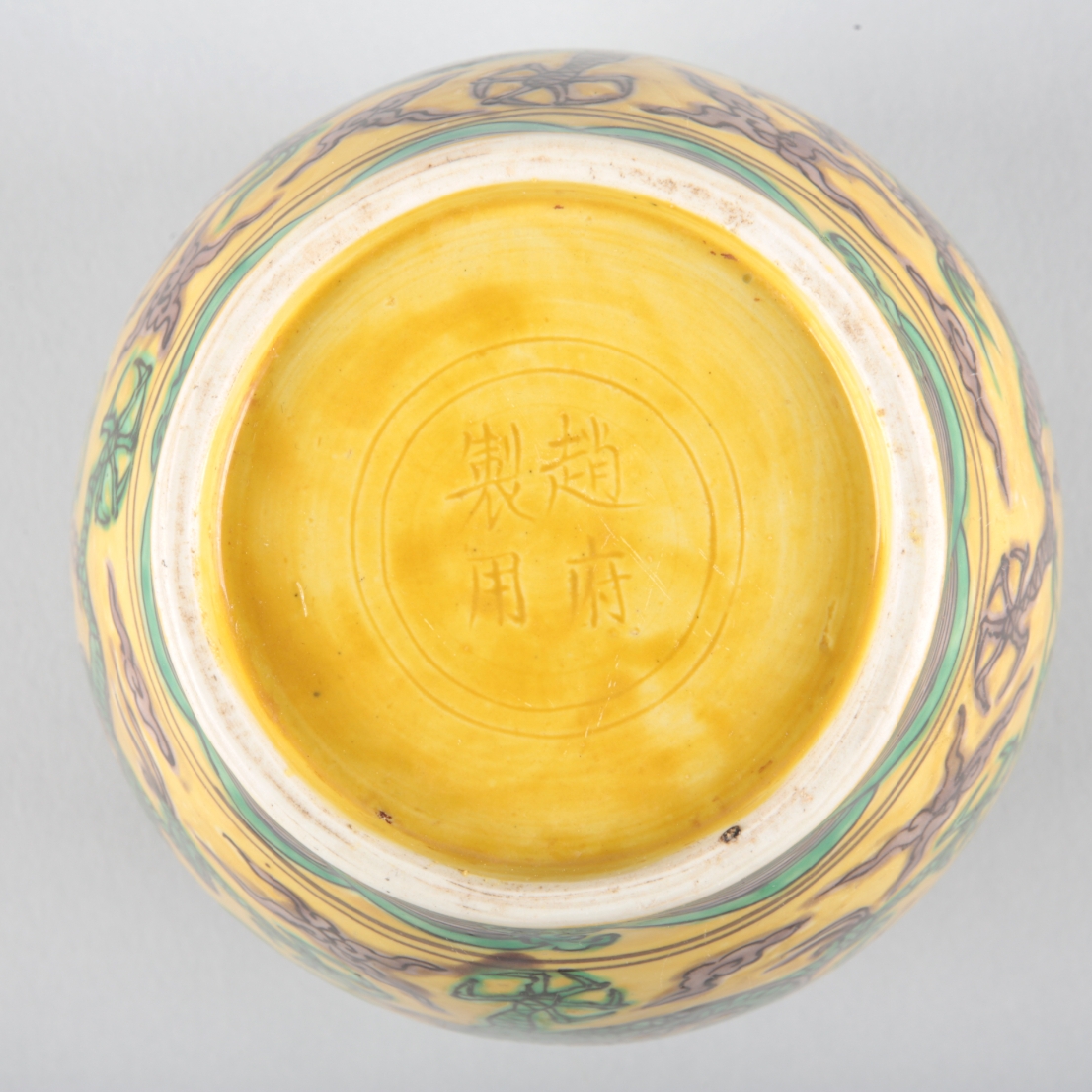 bearing an incised four character mark to the base within double concentric rings, with raised rim and tapered body, the yellow ground decorated with dragons chasing pearls in a cloud filled sky, a band of waves to the base, 13.5cm high