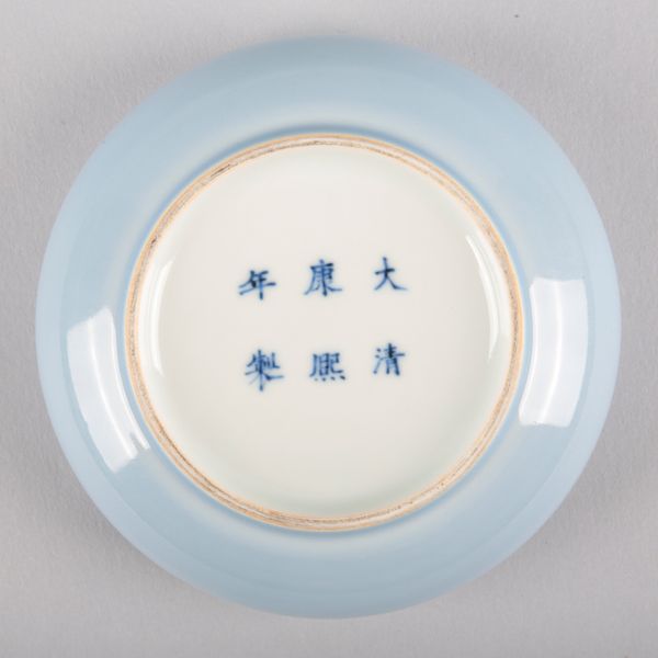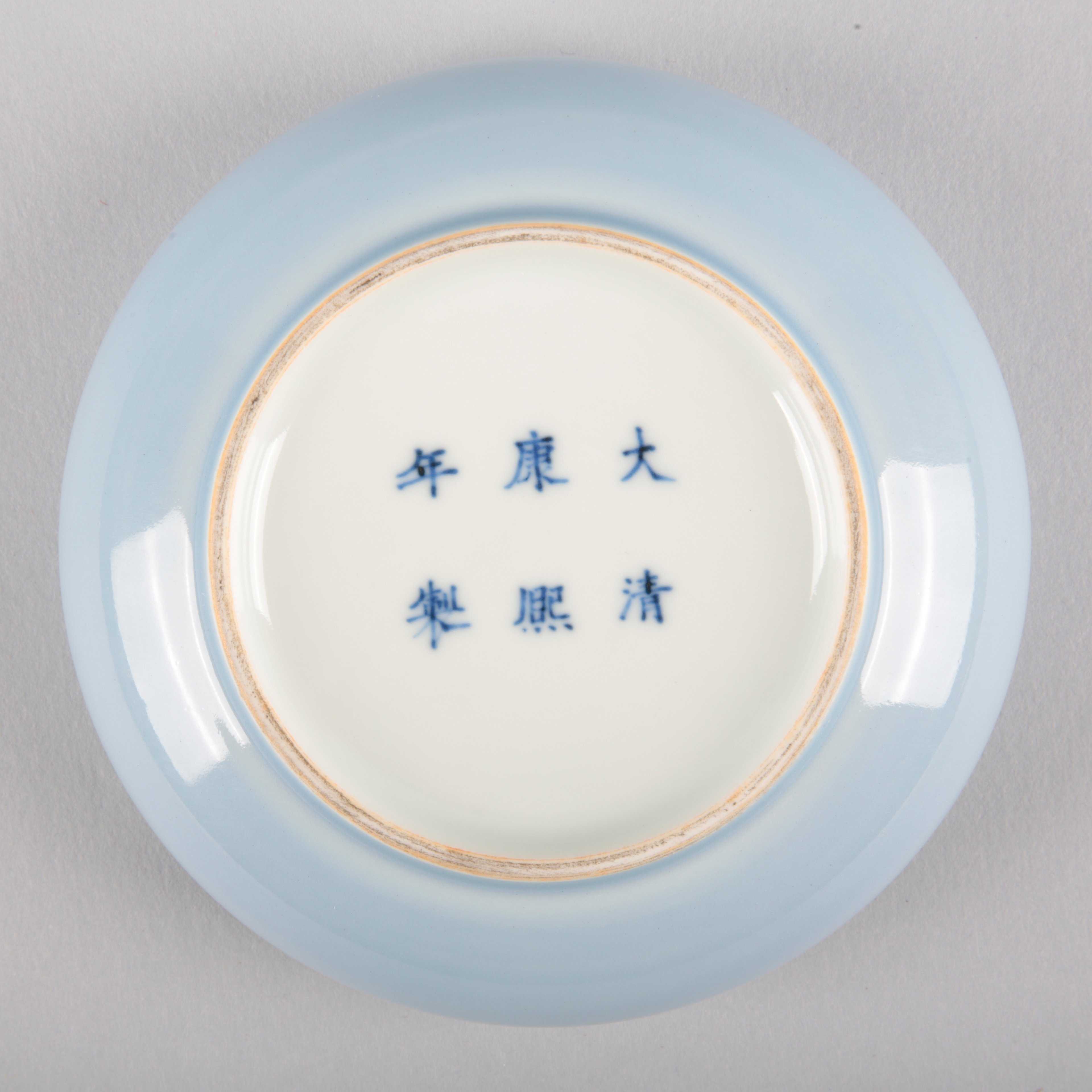 bearing a six character Kangxi mark to the base, with an inverted rim and raised foot, 4cm high x 11.5cm diameter