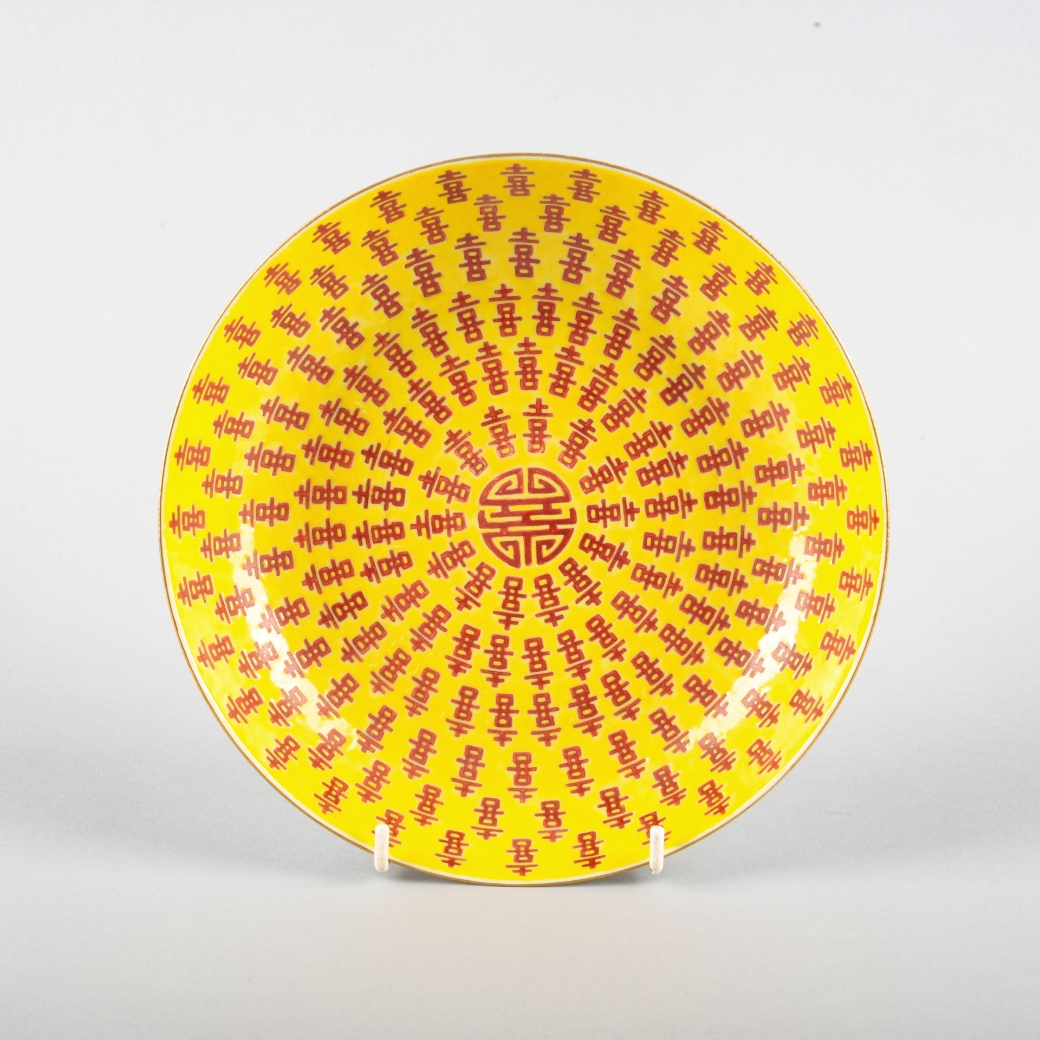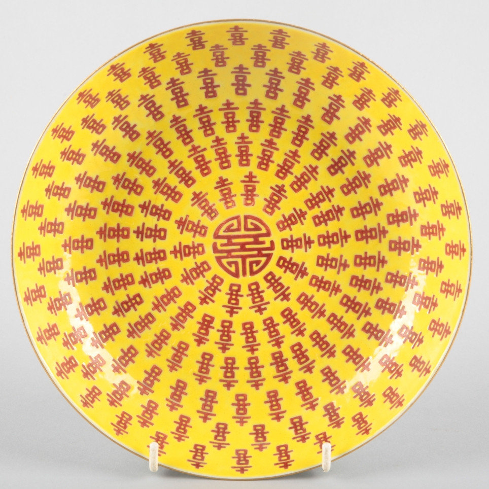 bearing a four character Tongzhi mark to the base, the yellow glazed top decorated with a shou symbol and numerous xi symbols, the exterior decorated with flowers and leafy tendrils, 22.5cm diameter