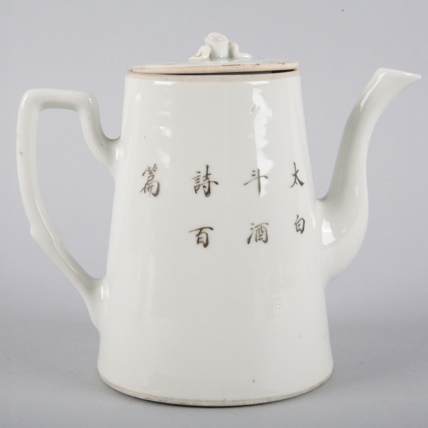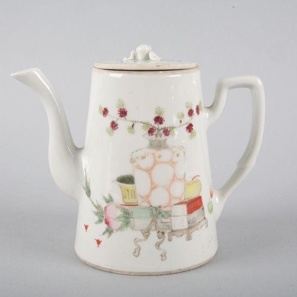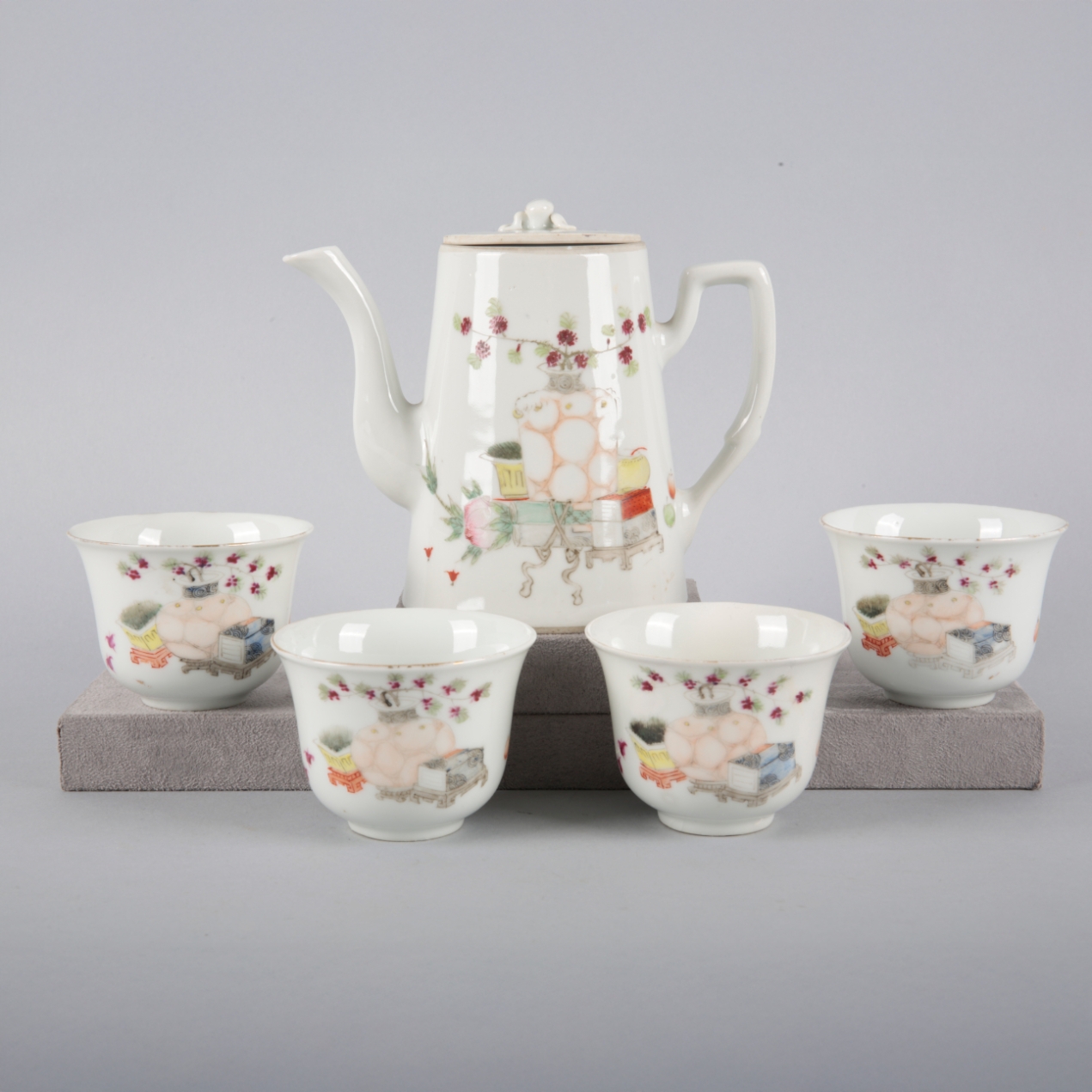 Republic period, comprising a teapot and four teabowls, the teapot bearing a six character mark to the base and inscribed with a passage of Li Bai poetry, decorated throughout with a vase issuing flowers, books, and a jardiniere, the teapot 13cm high, the teabowls 5.5cm high (5)