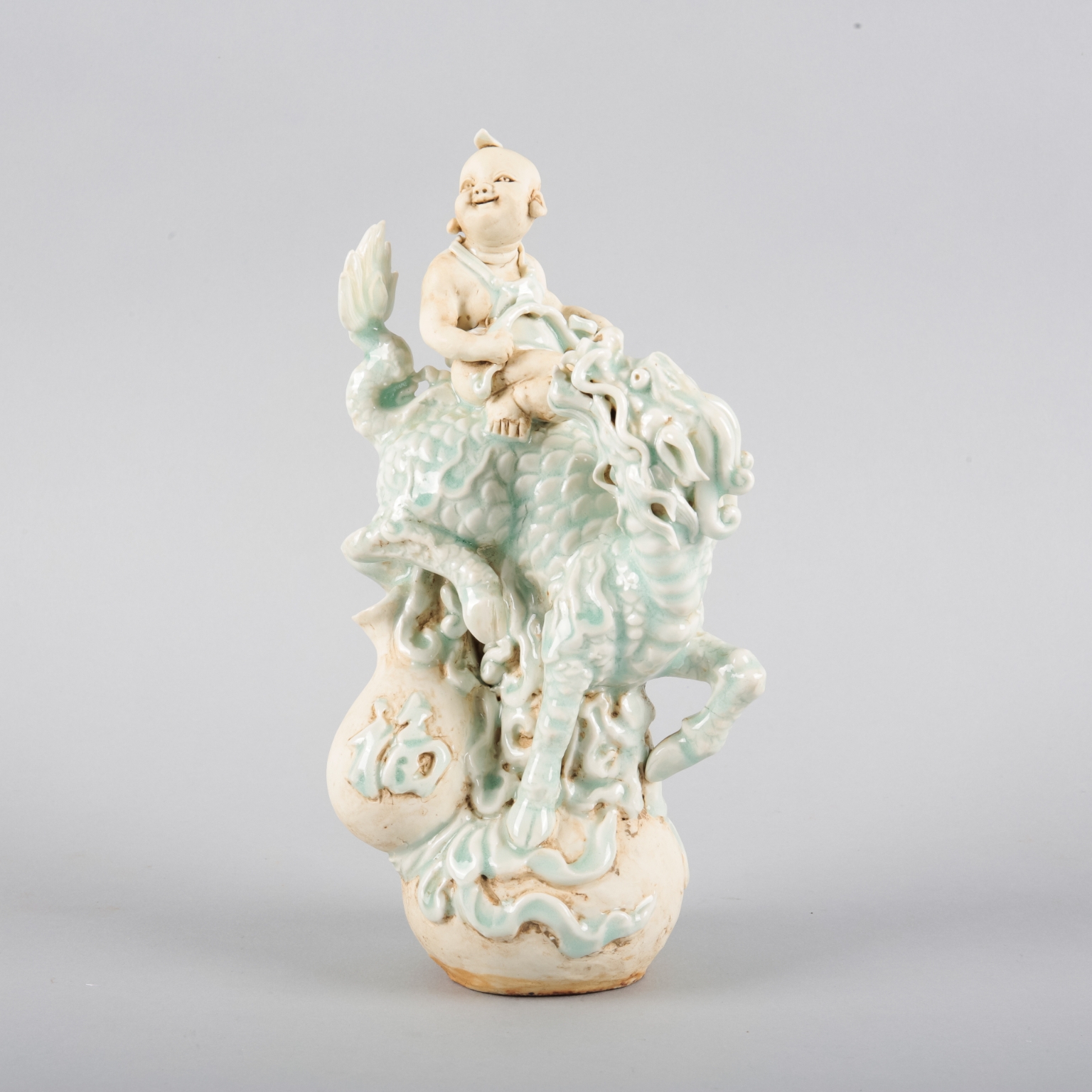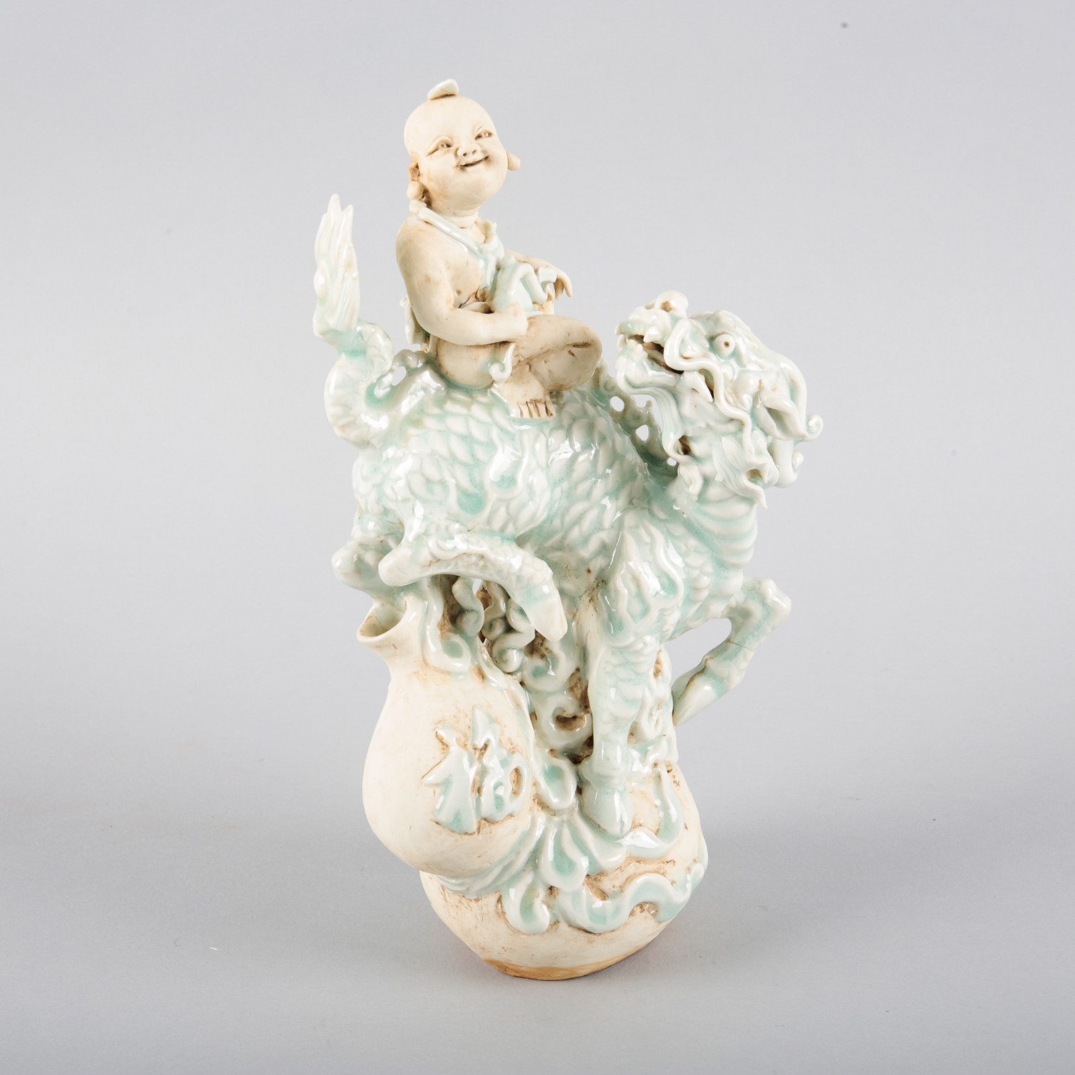 A CHINESE PORCELAIN QINGBAI GROUP OF A BOY RIDING A QILIN