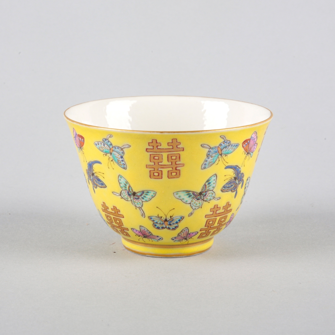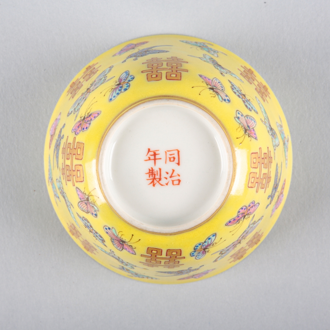 bearing a four character Tongzhi mark to the base, the yellow ground decorated with butterflies and shuangxi symbols, 6cm high x 9cm diameter