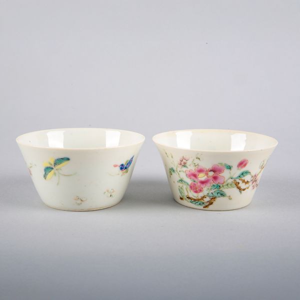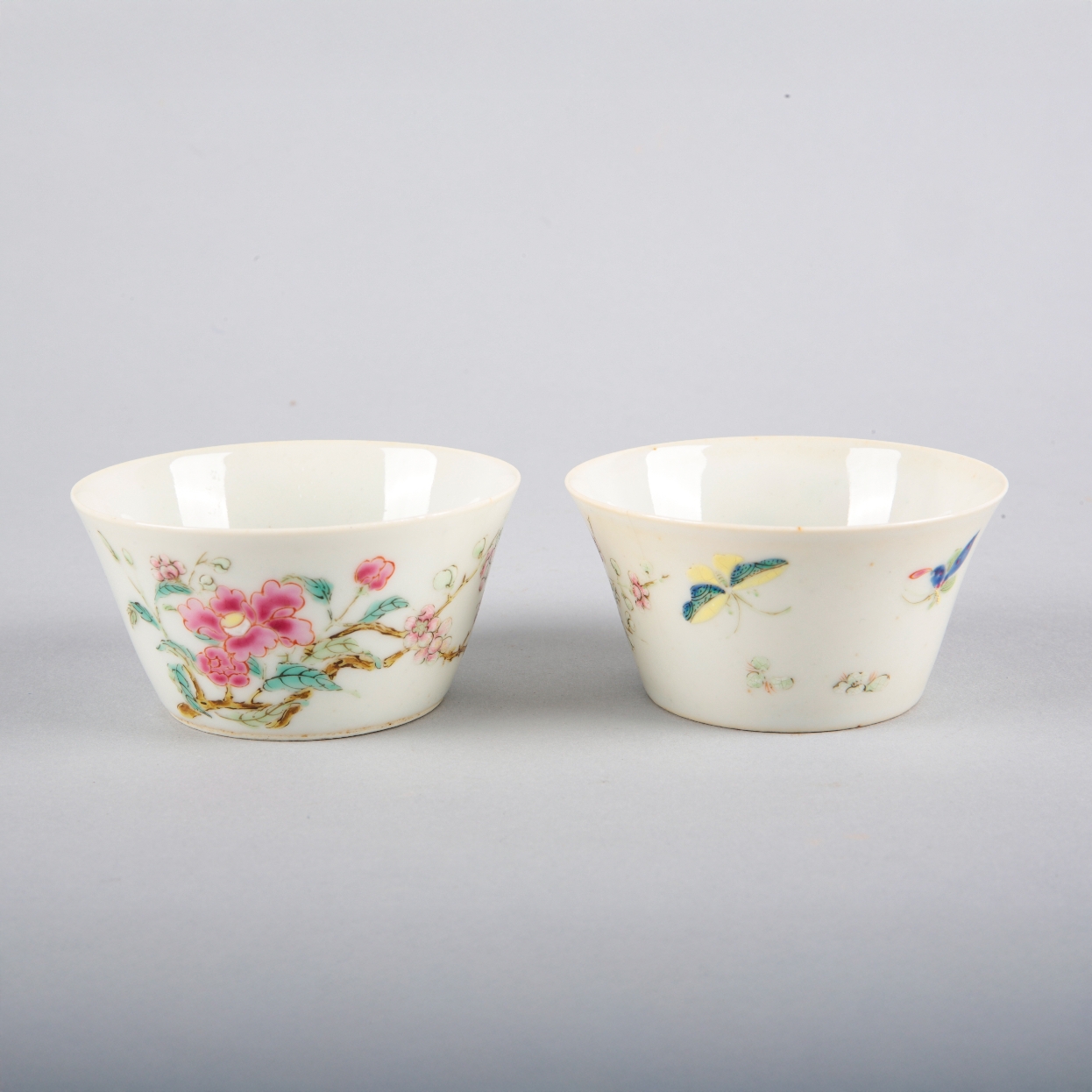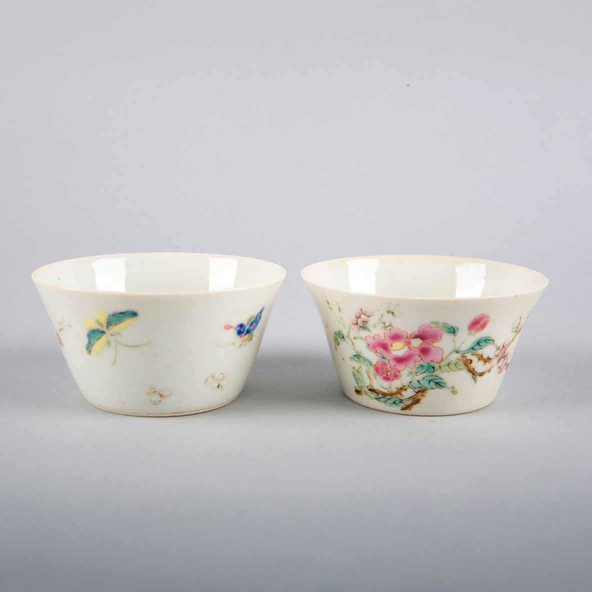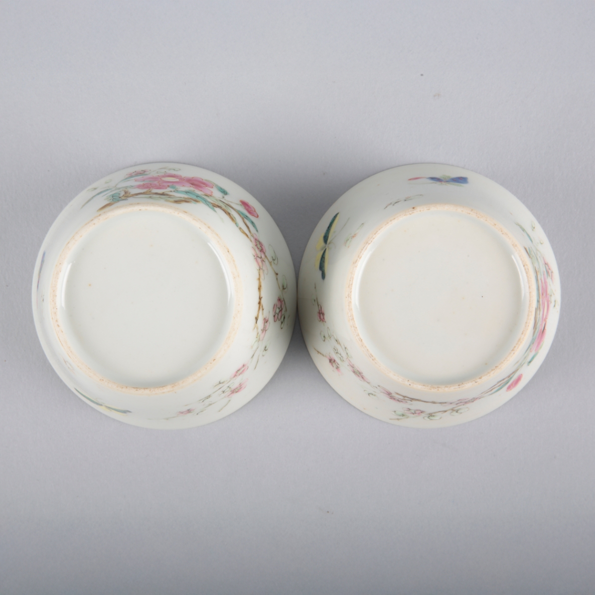probably Yongzheng period, with tapered bowls and subtly everted rims, decorated with butterflies and insects flying amongst blossoming foliage, 4.5cm high x 8.5cm diameter (2)