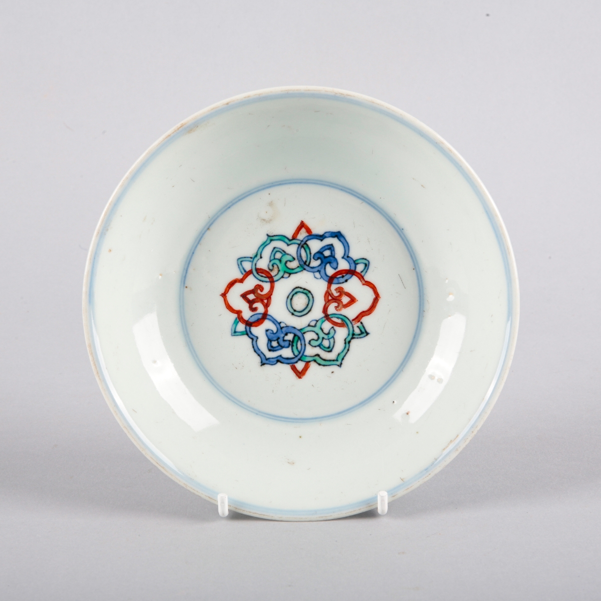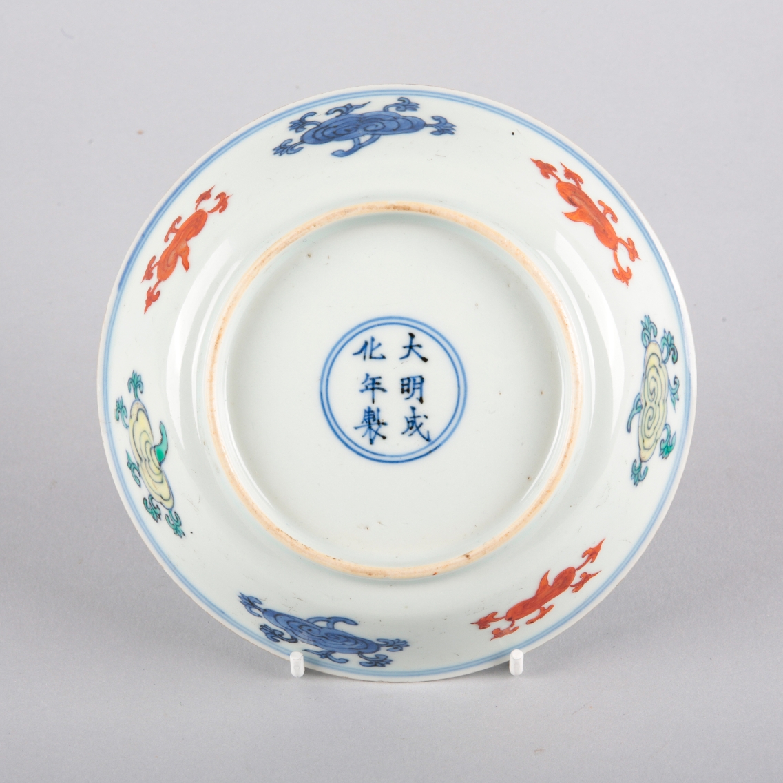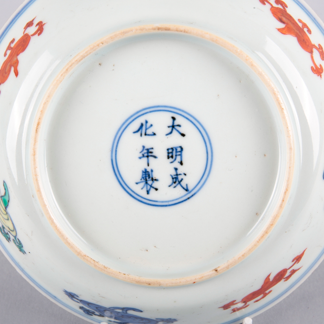 bearing a six character Chenghua mark to the base but probably early Qing dynasty, the interior decorated with a medallion of interlinking ruyi heads, the exterior with seven lingzhi motifs, 3.5cm high x 15cm diameter