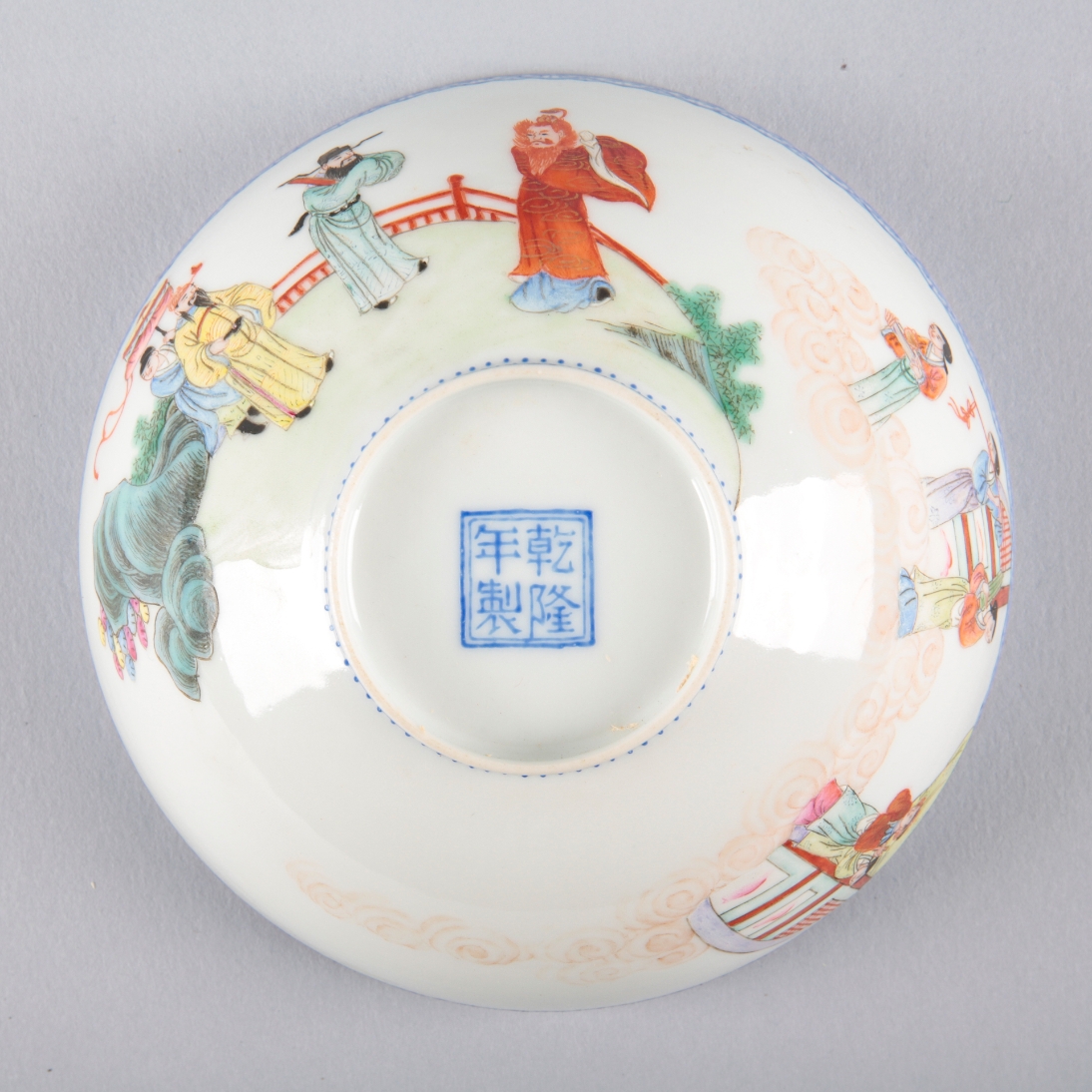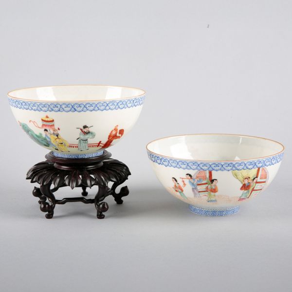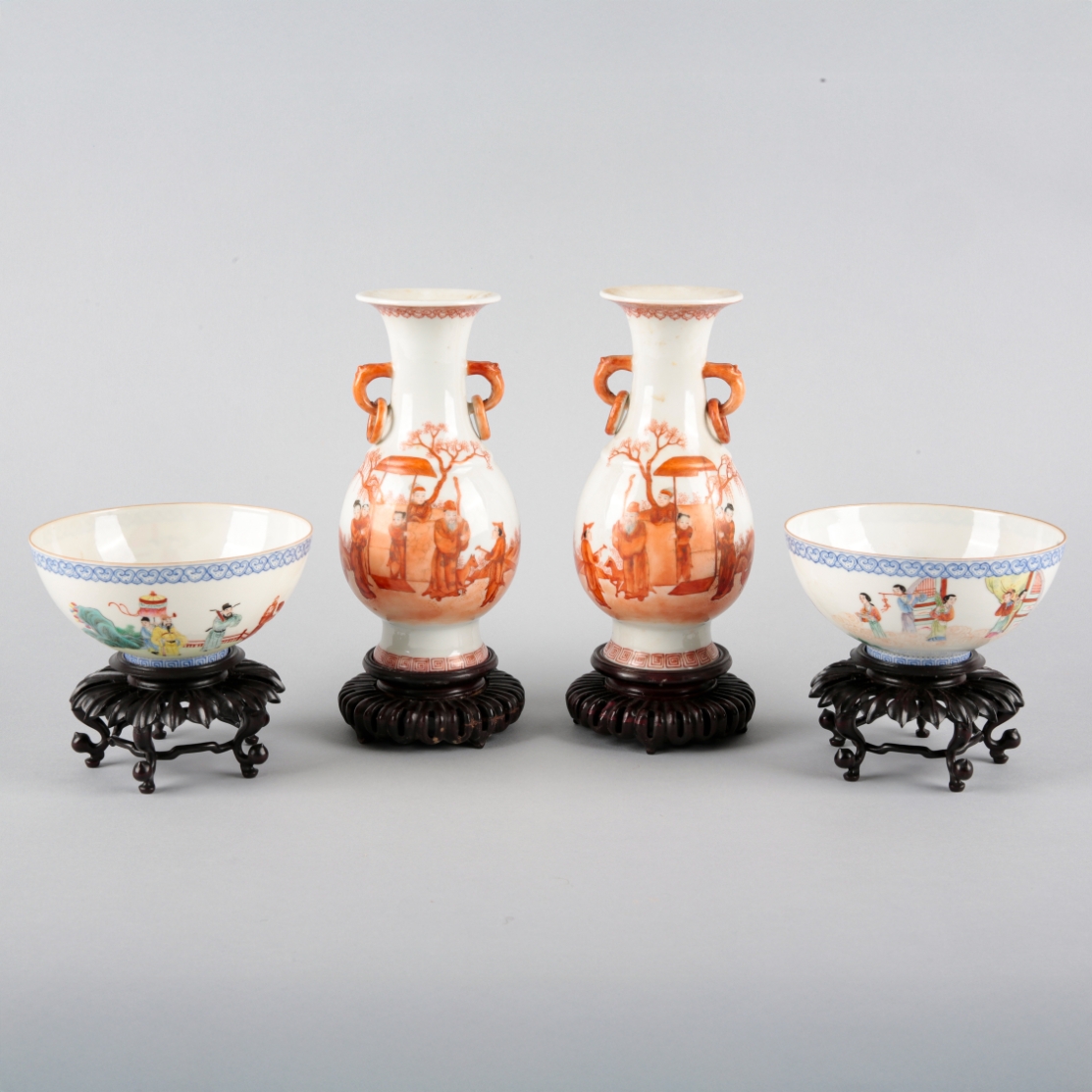 bearing six character Qianlong marks to the base, 20th century, of baluster form with ring handles, decorated with figures in a garden landscape and inscribed, 19cm high, on hardwood stands; together with a pair of Chinese eggshell porcelain bowls on stands, 13cm diameter (4)