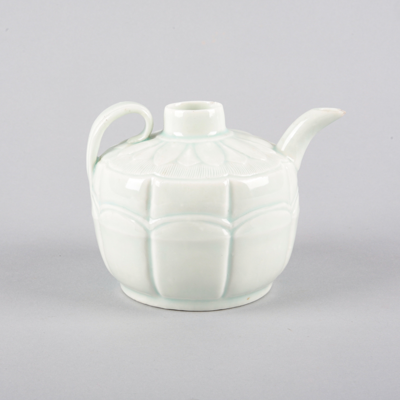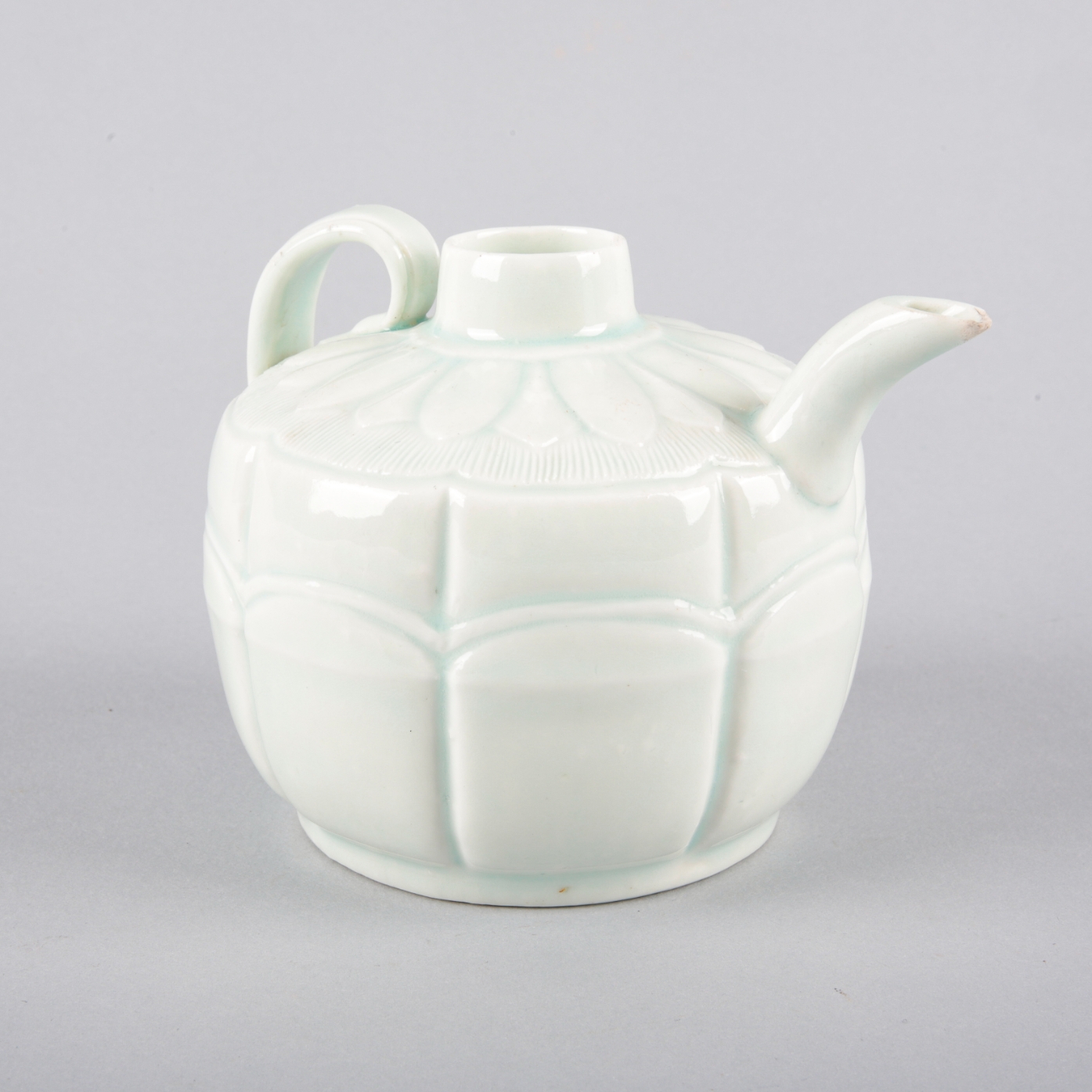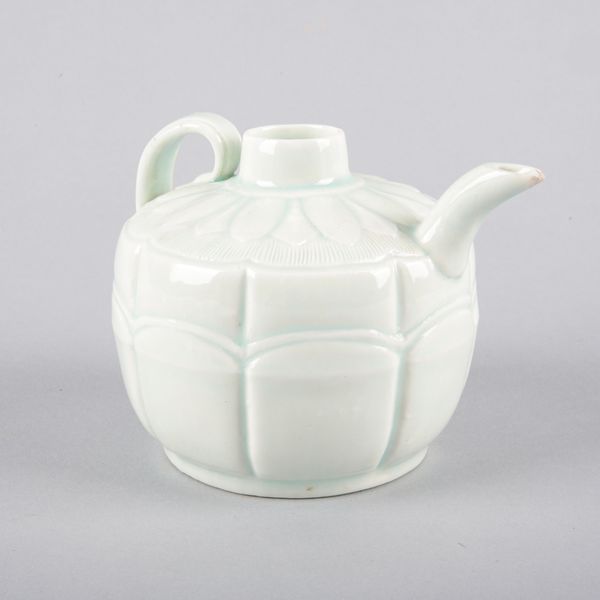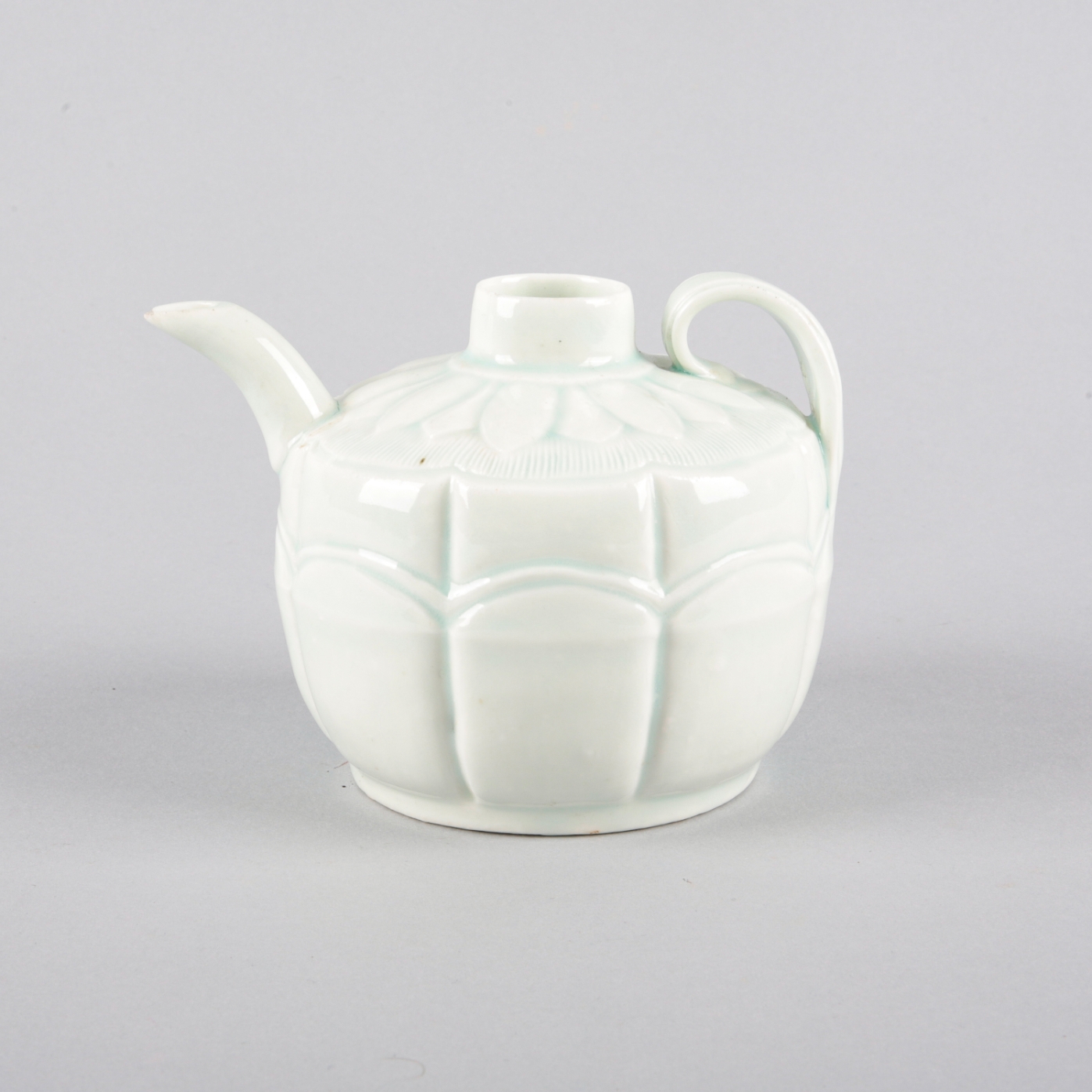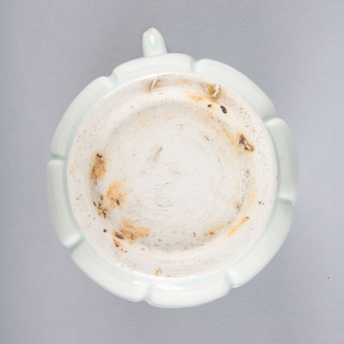 A chip to the spout and to the rim. Crazing and small firing imperfections noted. A few light surface scratches and signs of wear. Glaze thinning to the edges and handle.