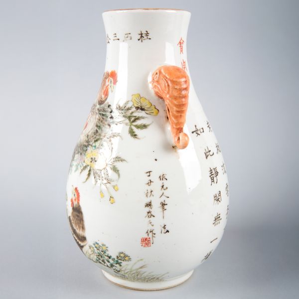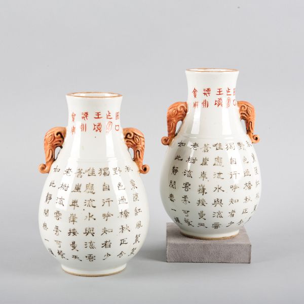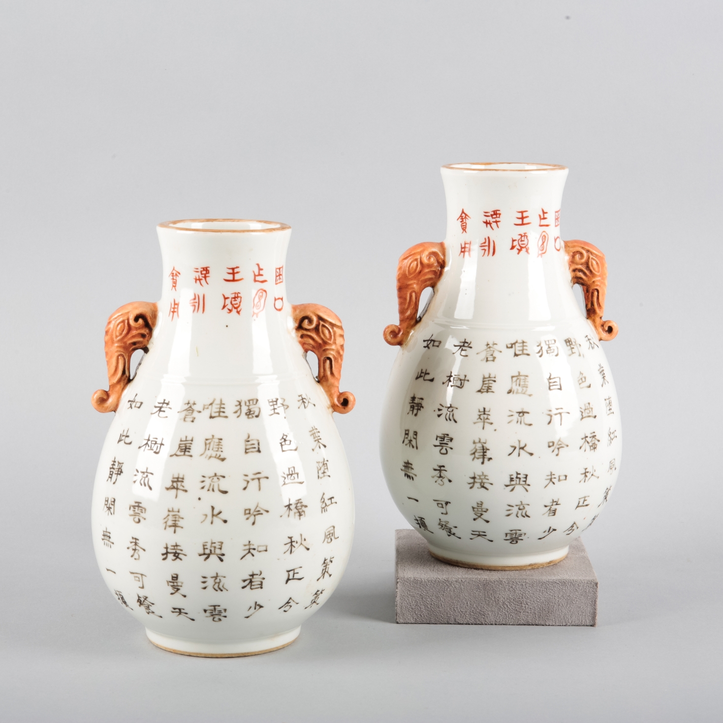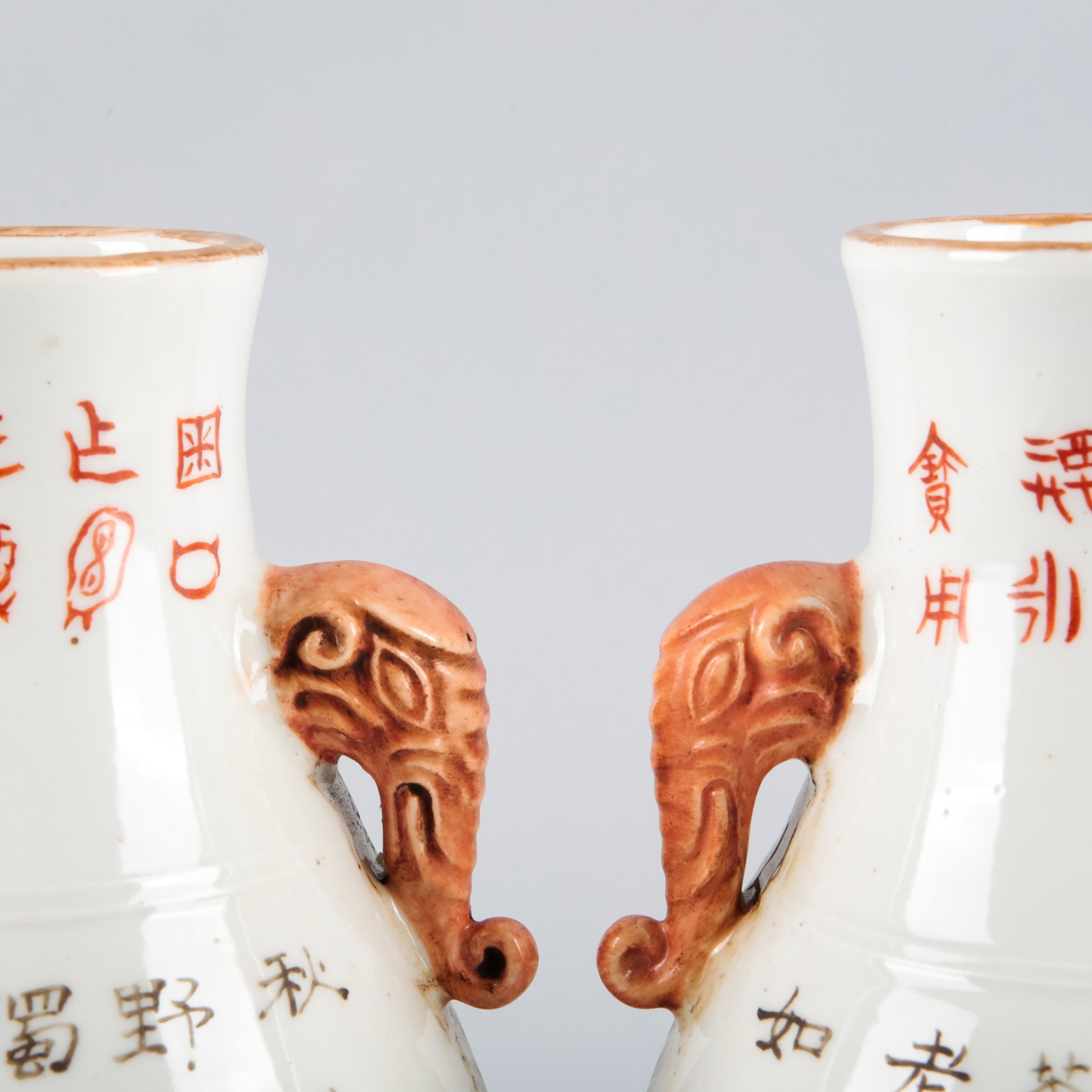 The pair of Chinese porcelain vases appear in good overall condition, with no visible structural cracks or repairs. Firing impurities are present throughout, consistent with period manufacture. Minor discoloration is evident around the handles, and light gilt rubbing is visible along the rims. Additional photos available on request