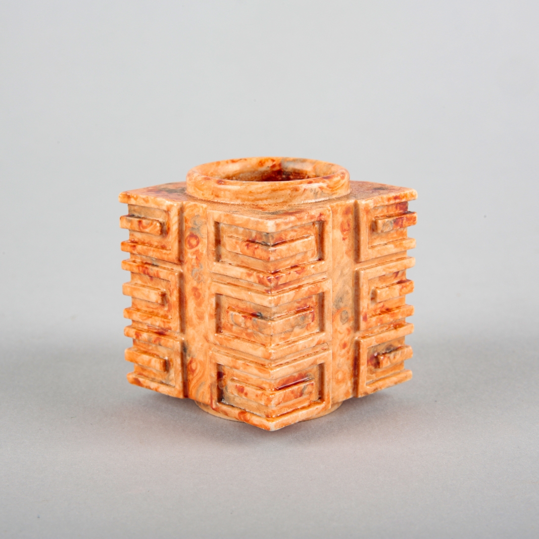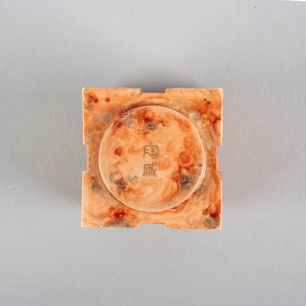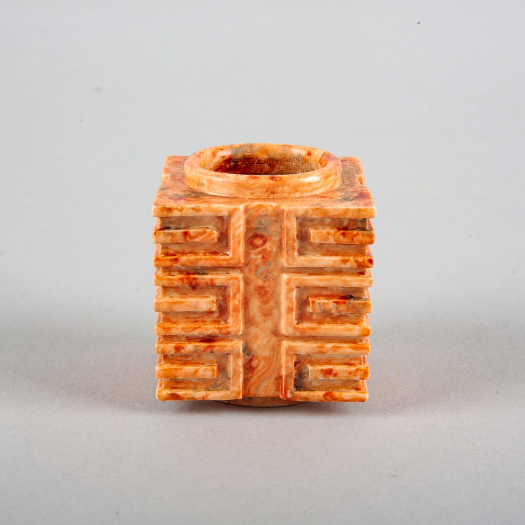 bearing a gilt two character mark to the base, late Qing/20th century, of archaistic form with red marbled glaze, 5cm high x 4.5cm square