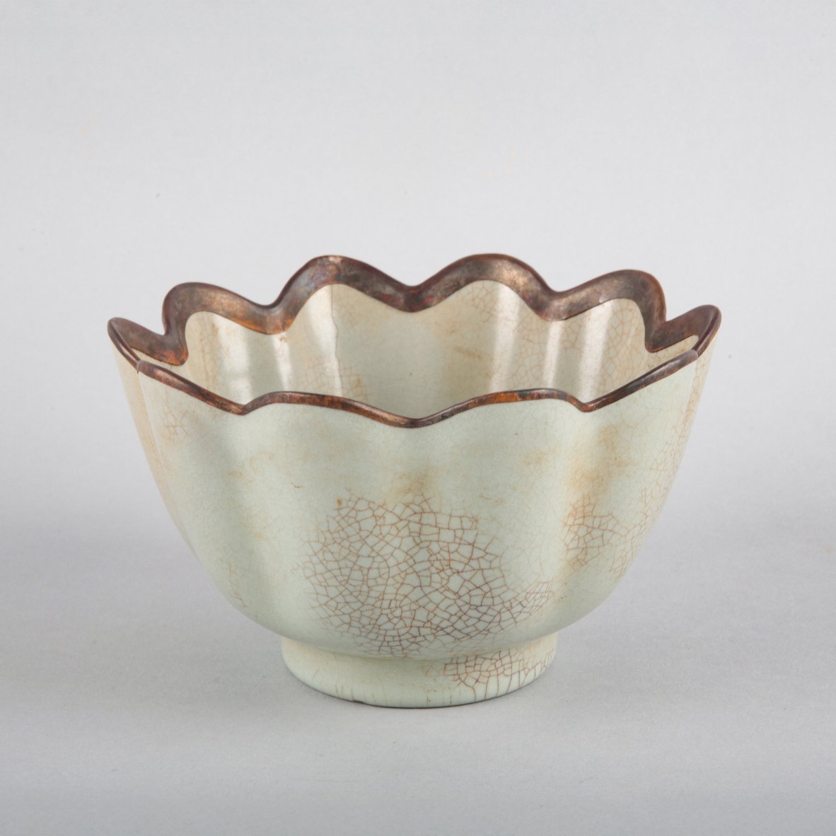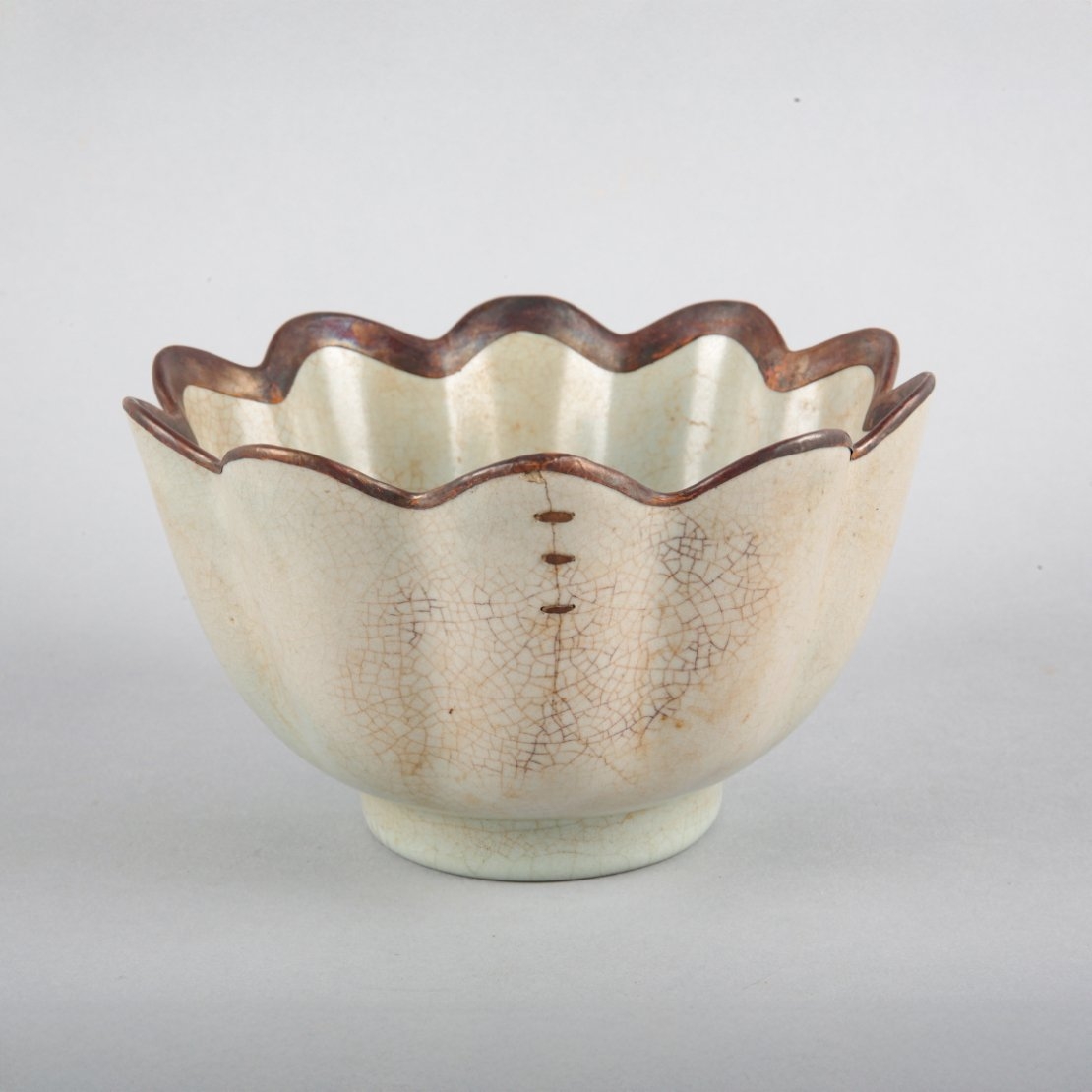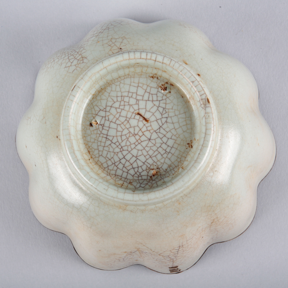 Yuan dynasty or later, of flower shape with ten lobed petals, with a repaired metal rim, 10.5cm high x 17.5cm diameter