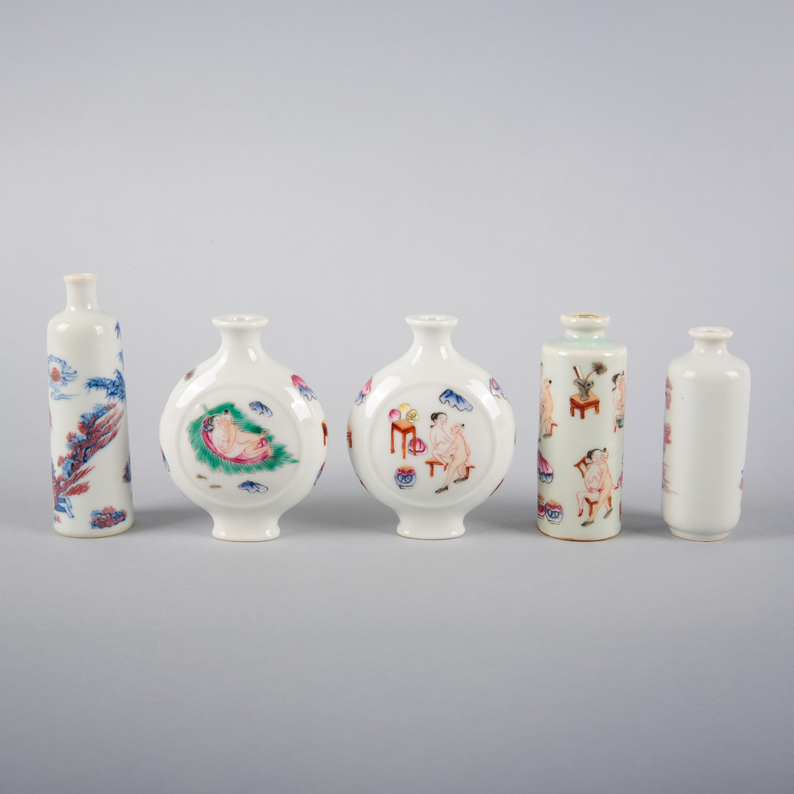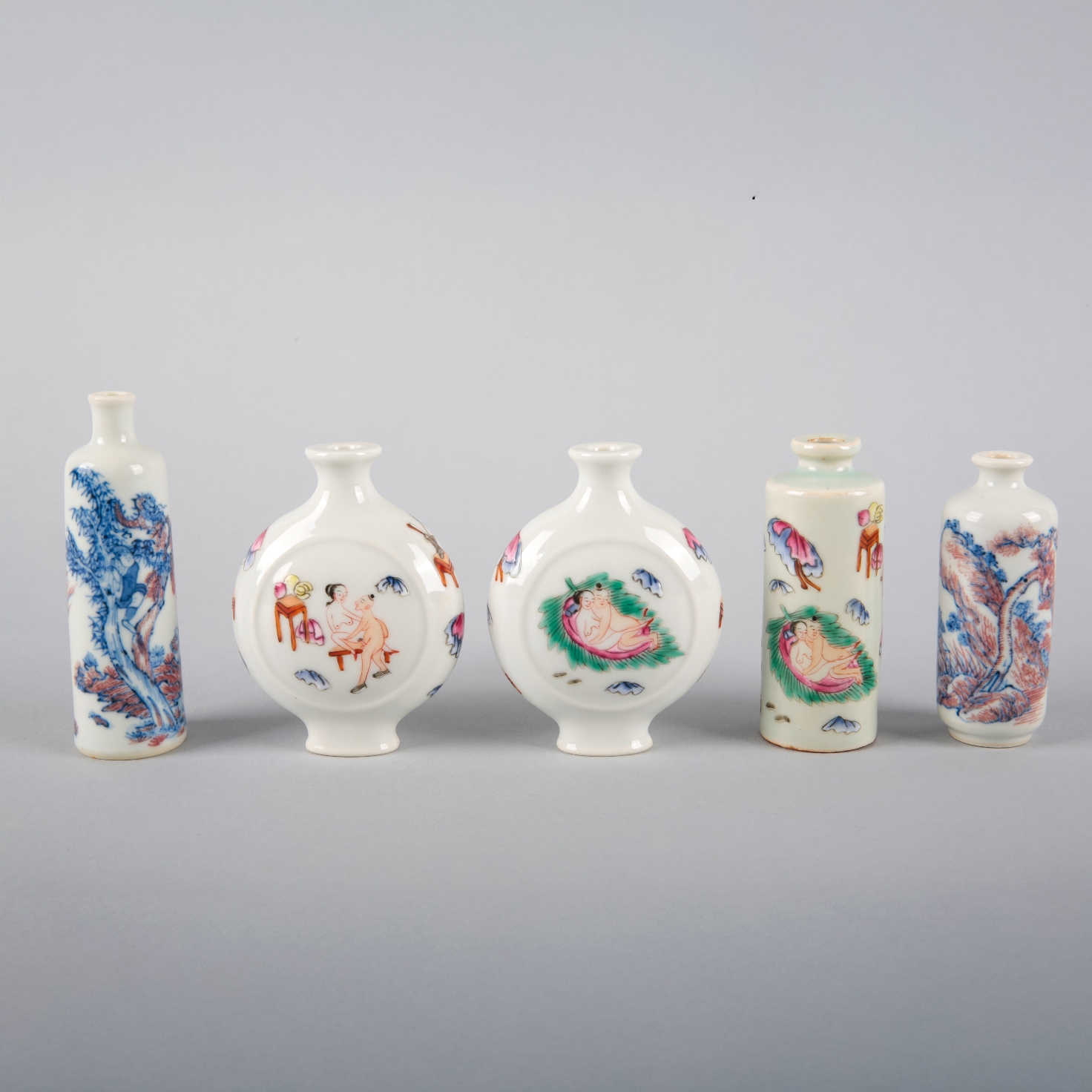 A GROUP OF FIVE CHINESE PORCELAIN SNUFF BOTTLES