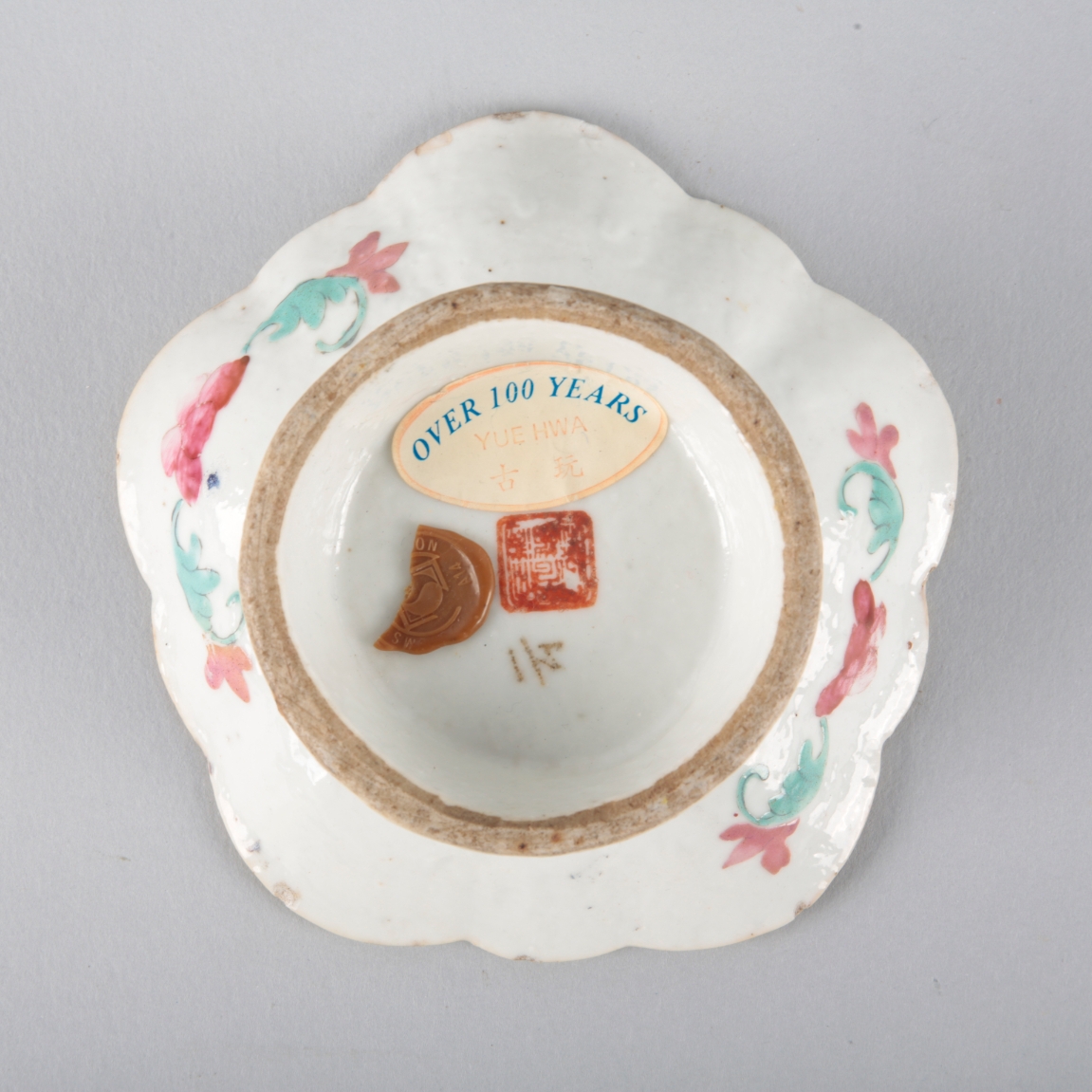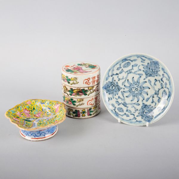 including a famille rose shaped dish, the yellow ground decorated with a chilong, 4cm high x 12cm wide; a blue and white dish decorated with stylised flowers, 14.5cm diameter; and a famille rose stacking box, 10cm high x 8cm diameter (3)