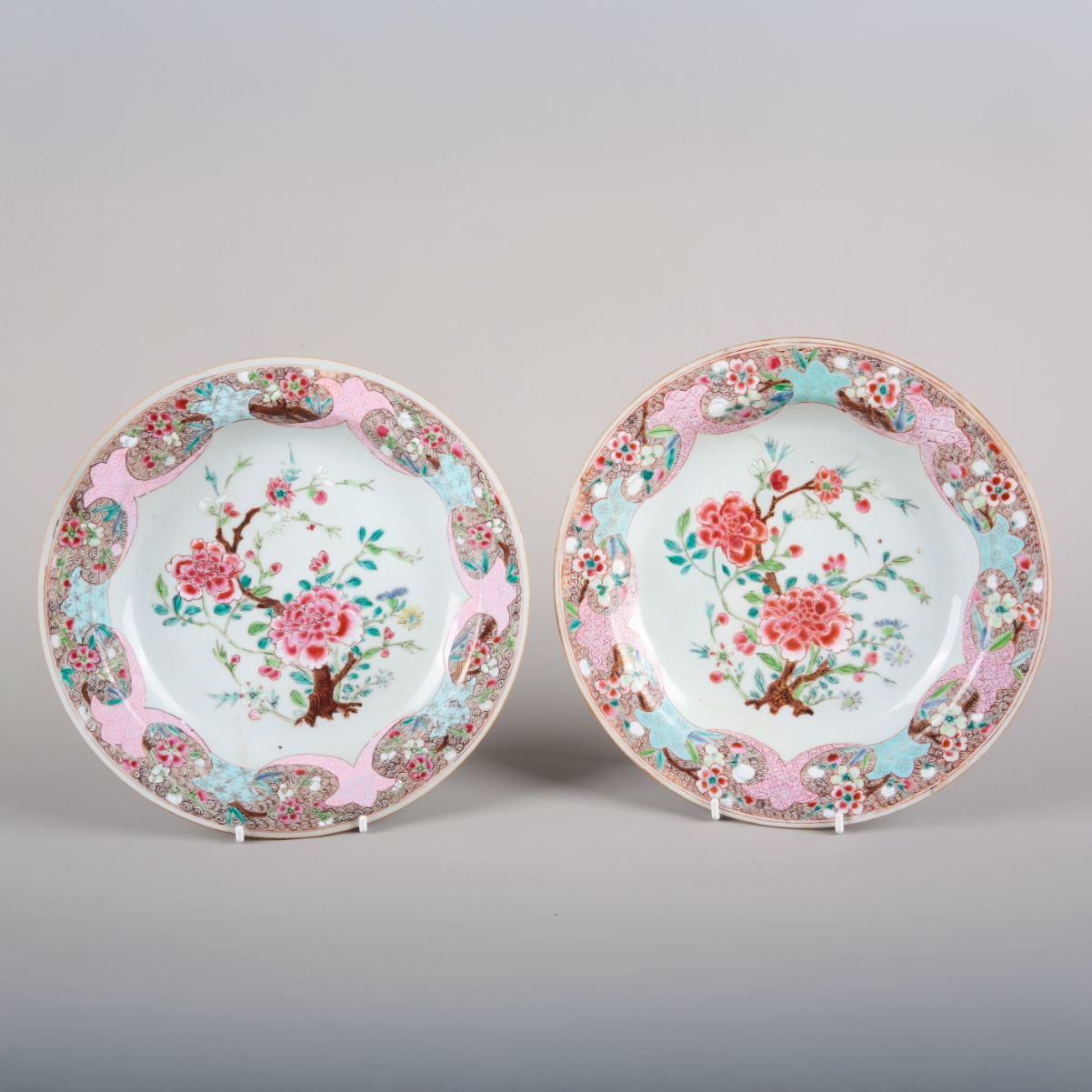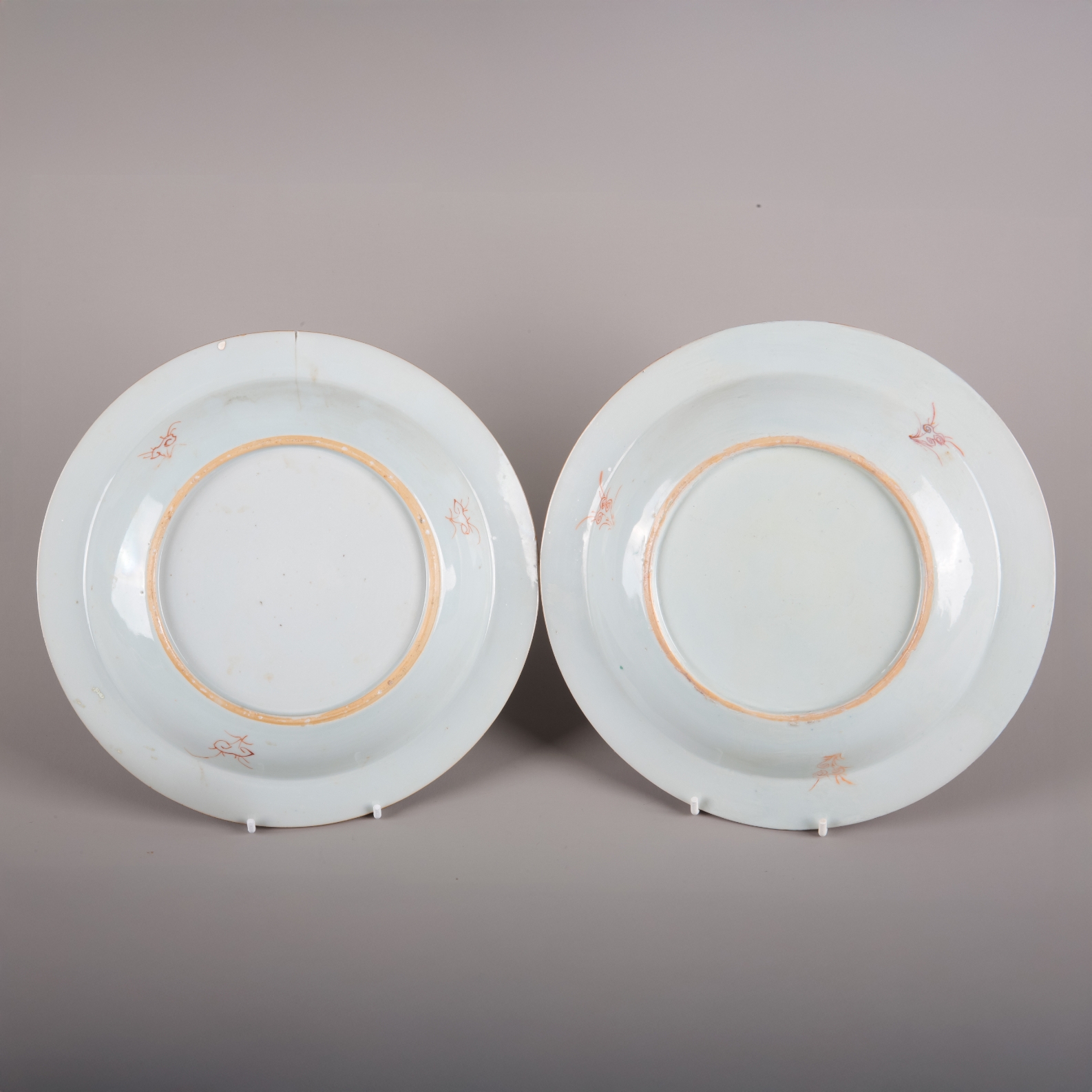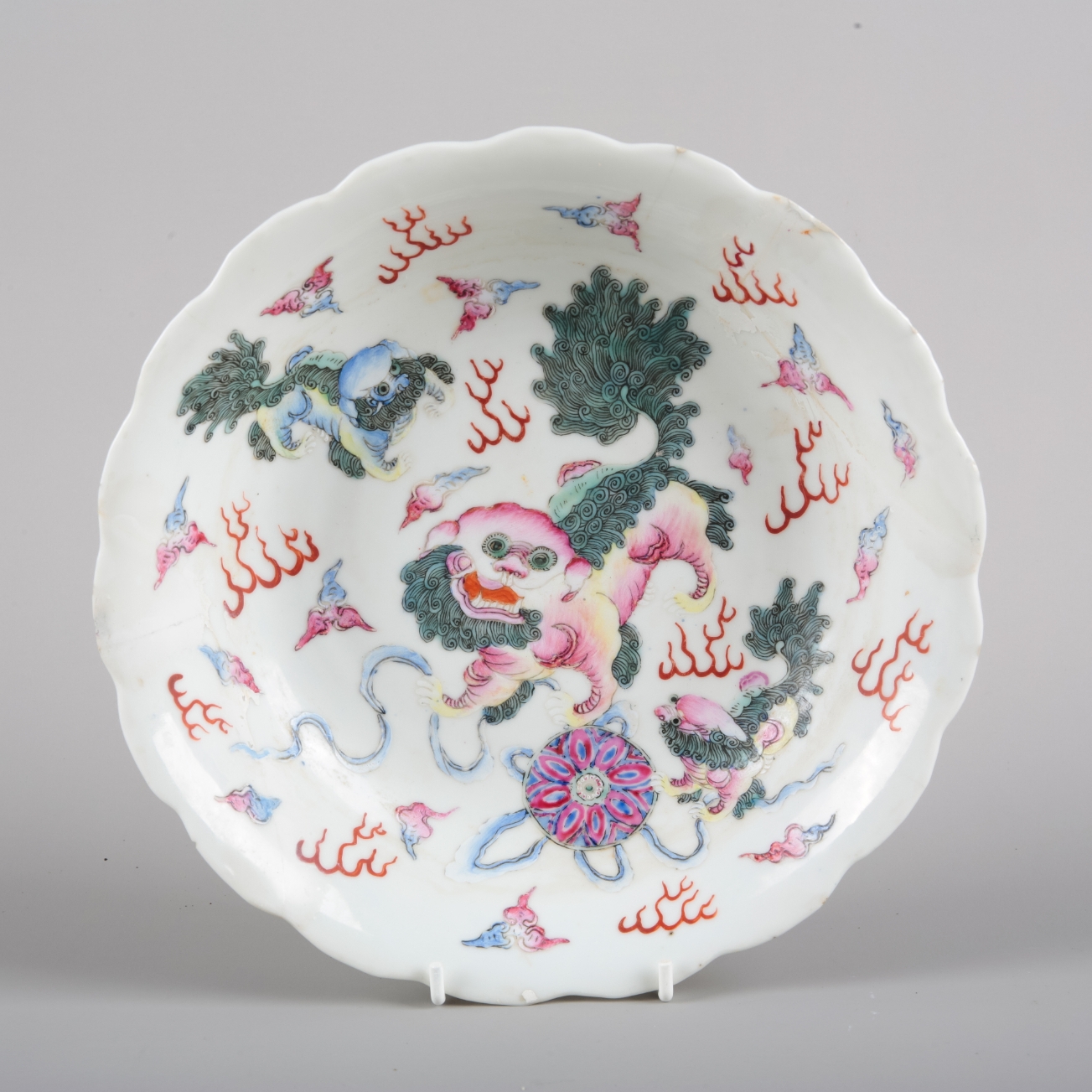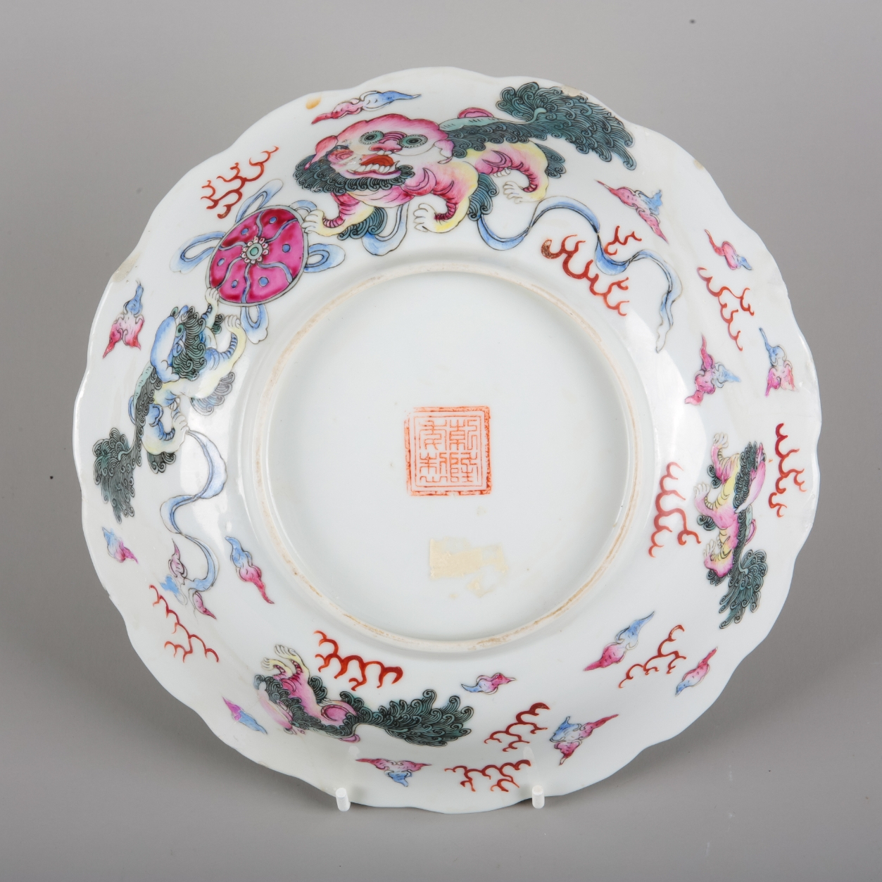 bearing a Qianlong six character seal mark, enamelled with shishis amongst flaming clouds, 22cm diameter; together with two famille rose porcelain plates enamelled with blooming prunus decoration, 23cm diameter (3)