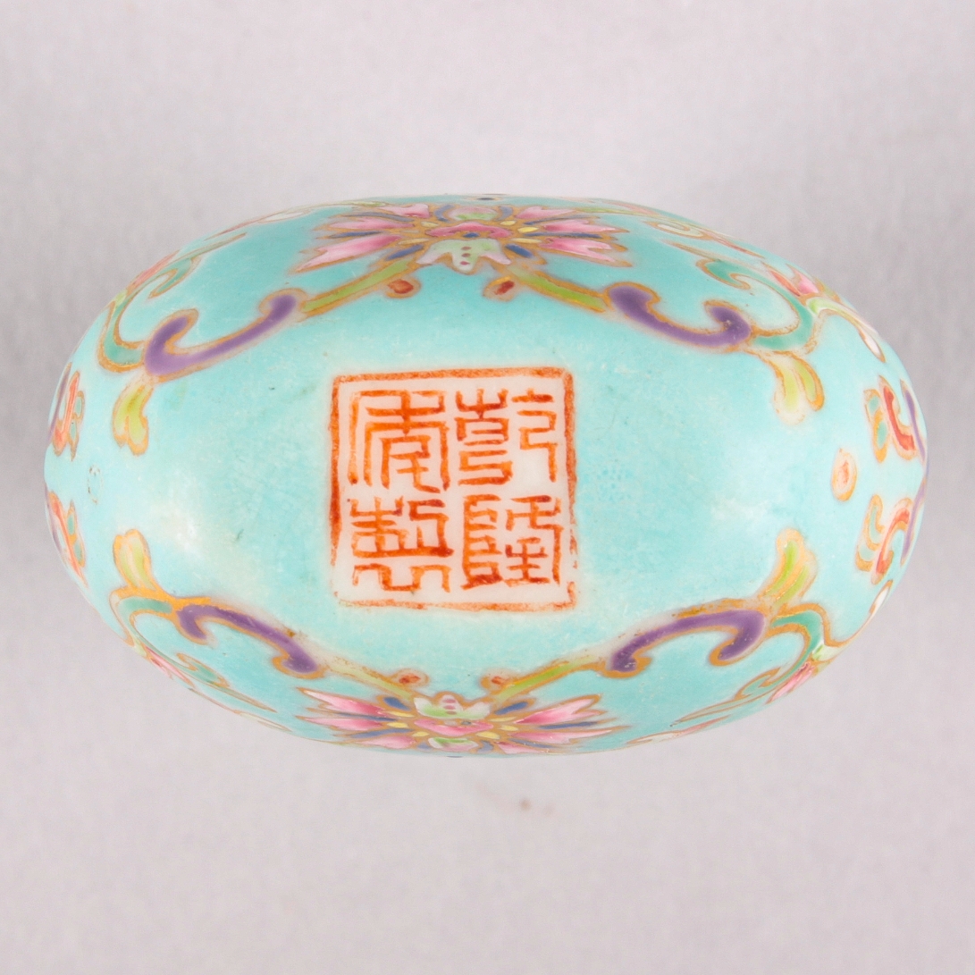 bearing a four character Qianlong seal mark to the base but later, the turquoise ground decorated with Wan and Shou symbols, stylised flora and bats to the collar, 7cm high