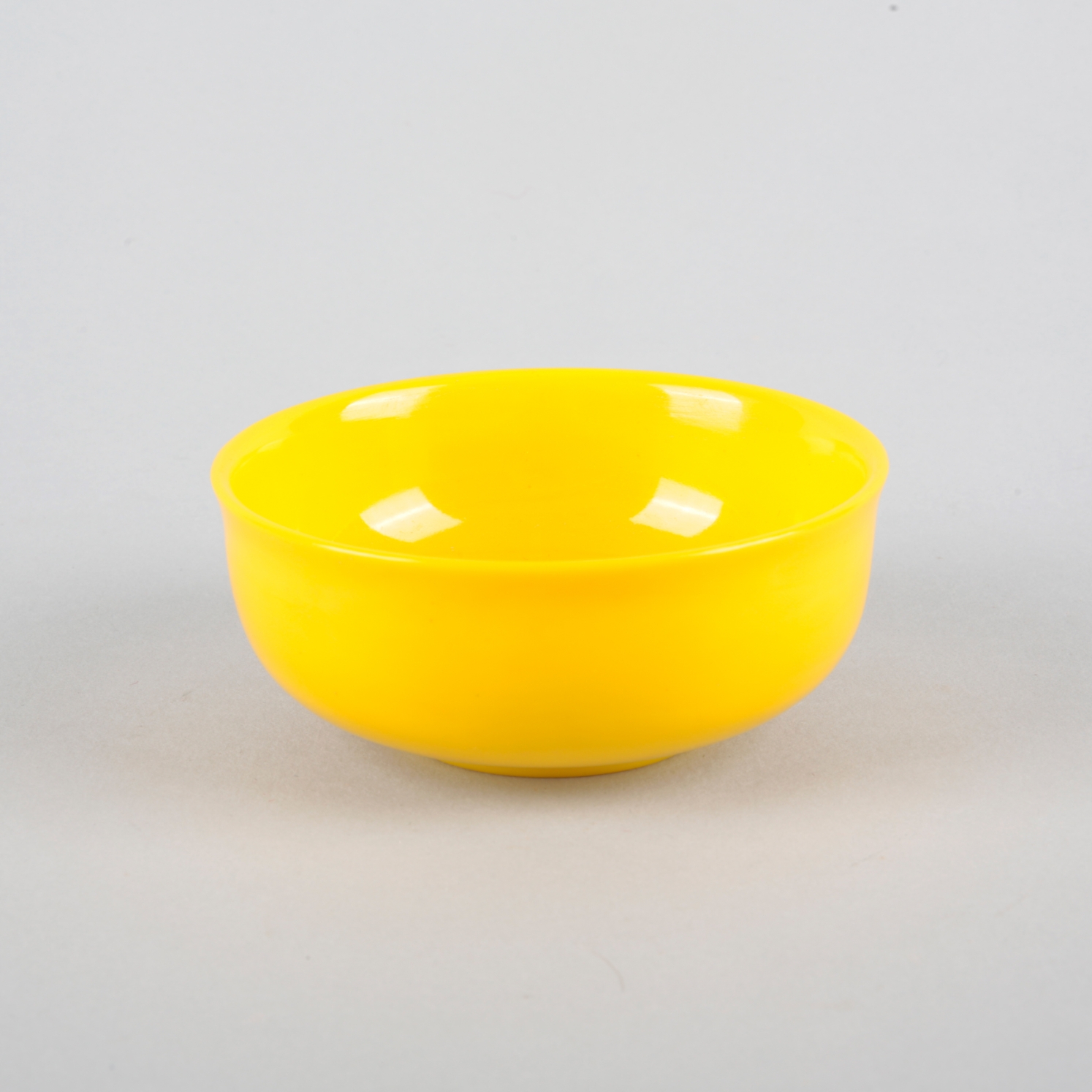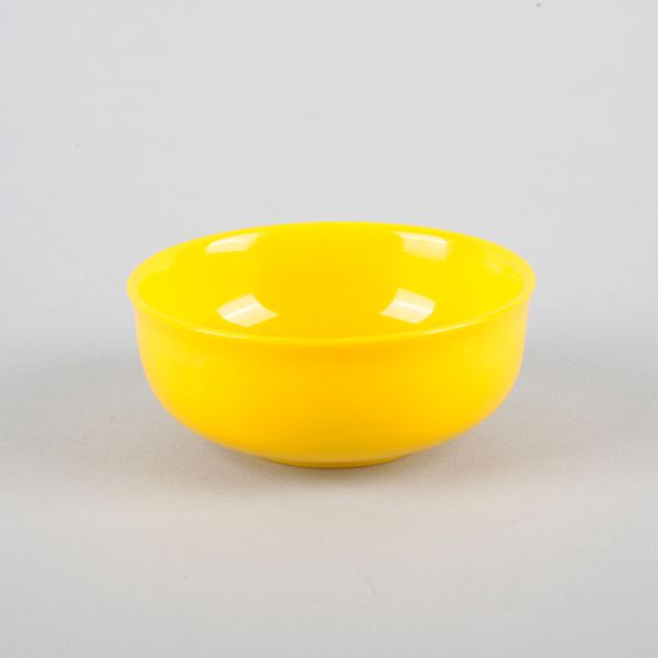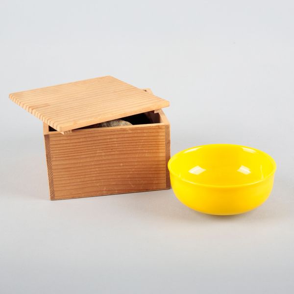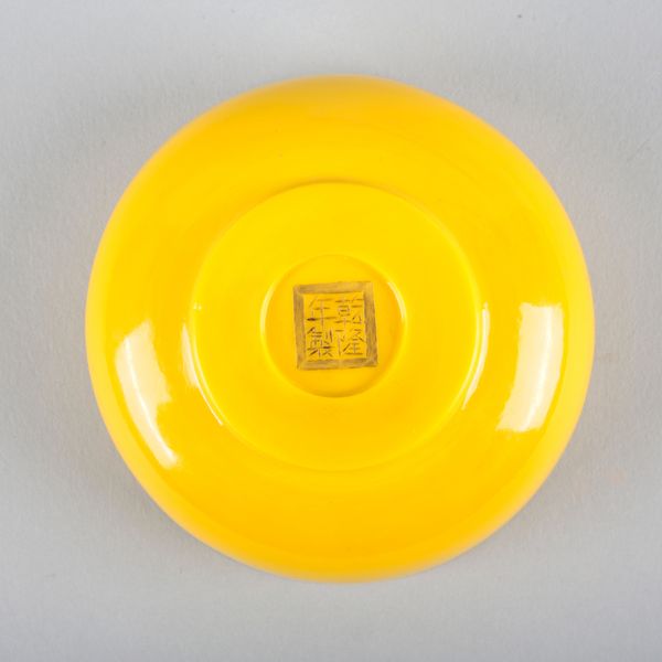 bearing a four character Qianlong seal mark to the base, the shallow bowl with a slightly everted rim and raised turned foot, 4cm high x 10.5cm diameter, in a wooden box
