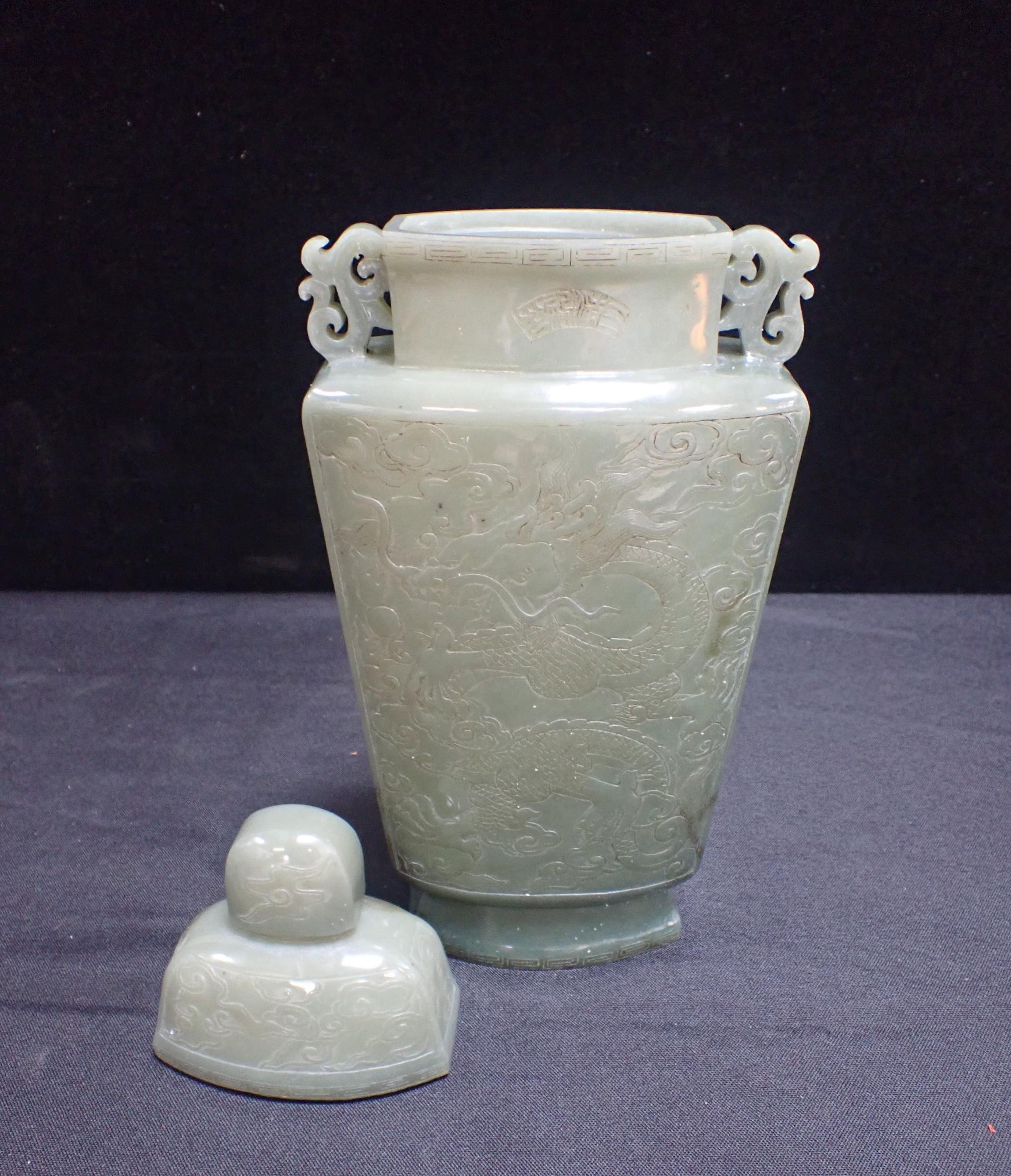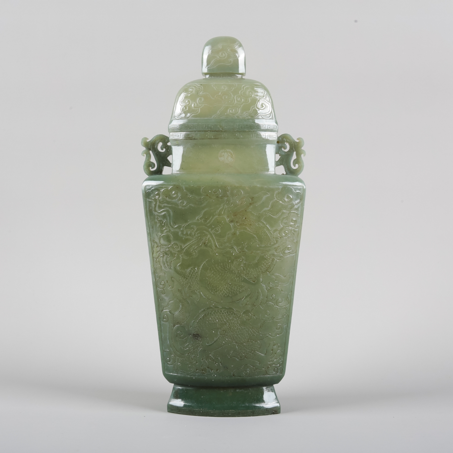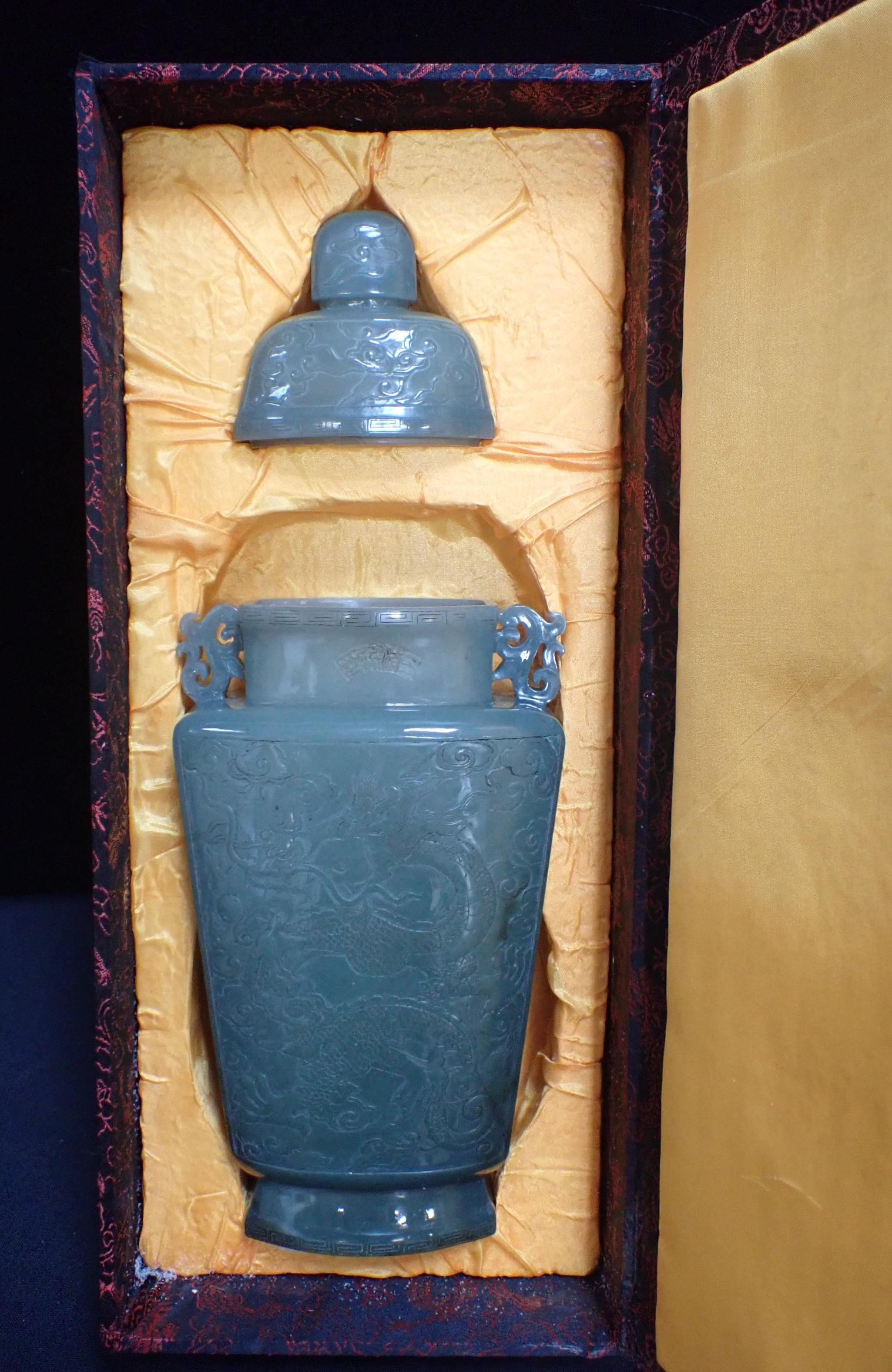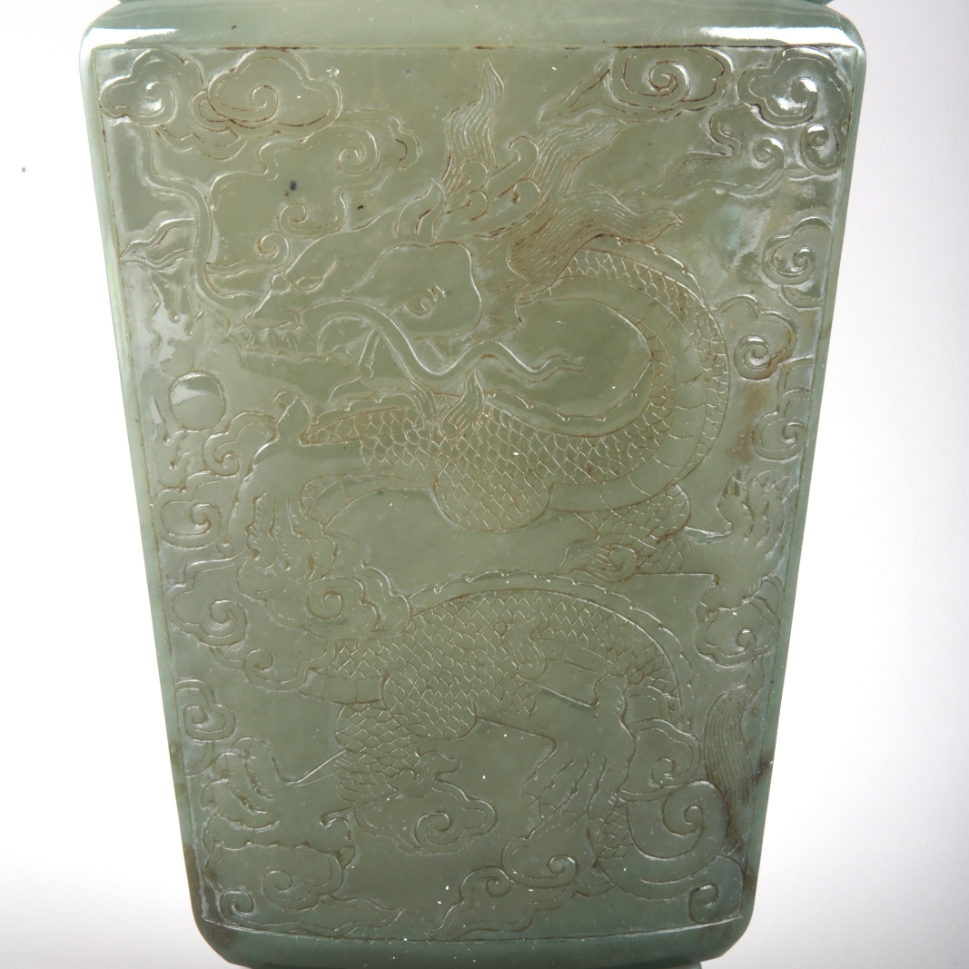 20th century, of tapered rectangular section, with pierced handles to the shoulder, carved in relief with dragons, 31cm high, in a fitted box