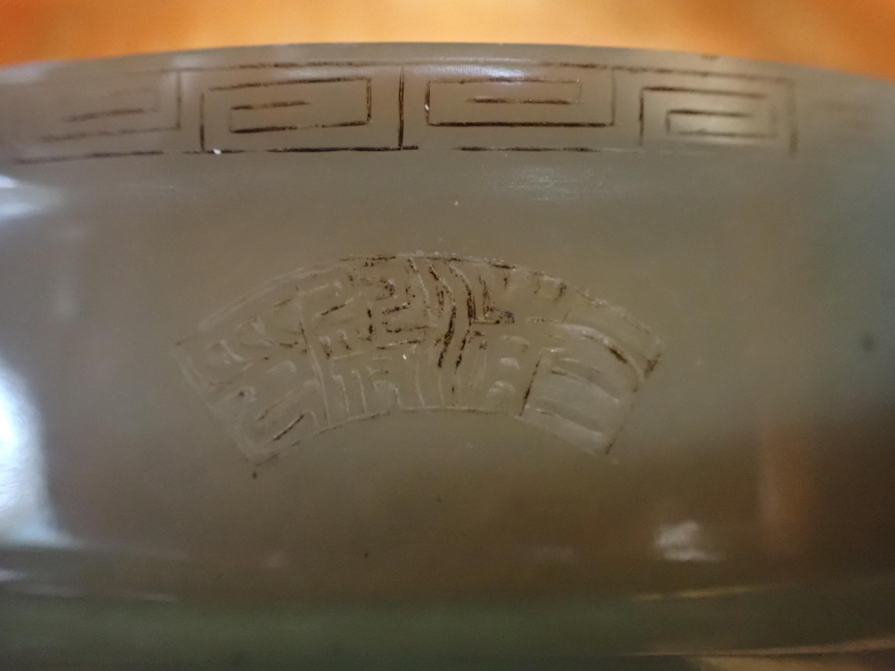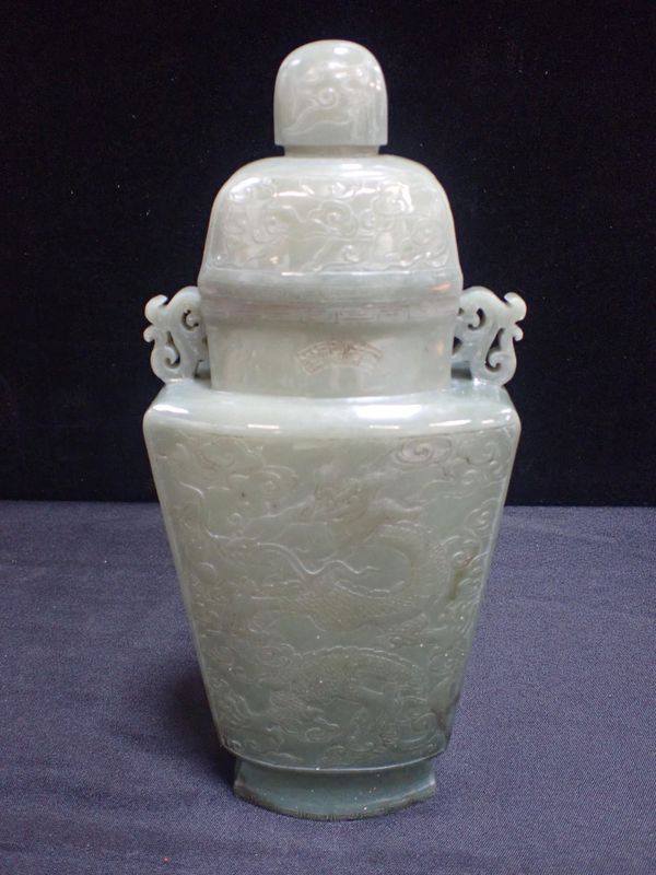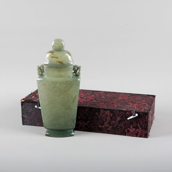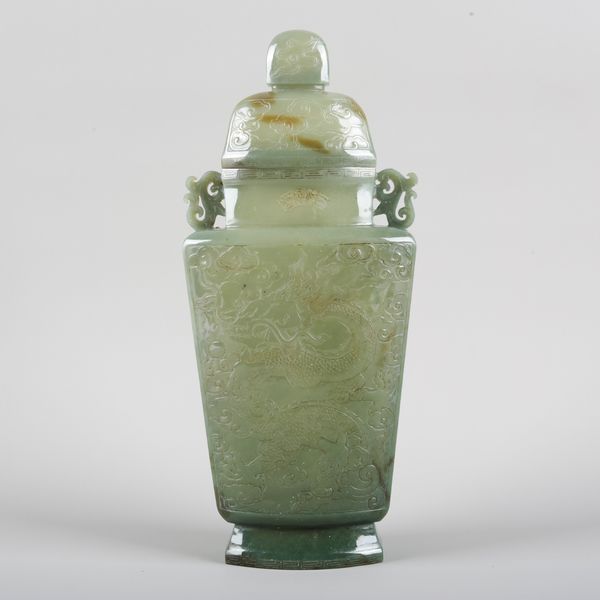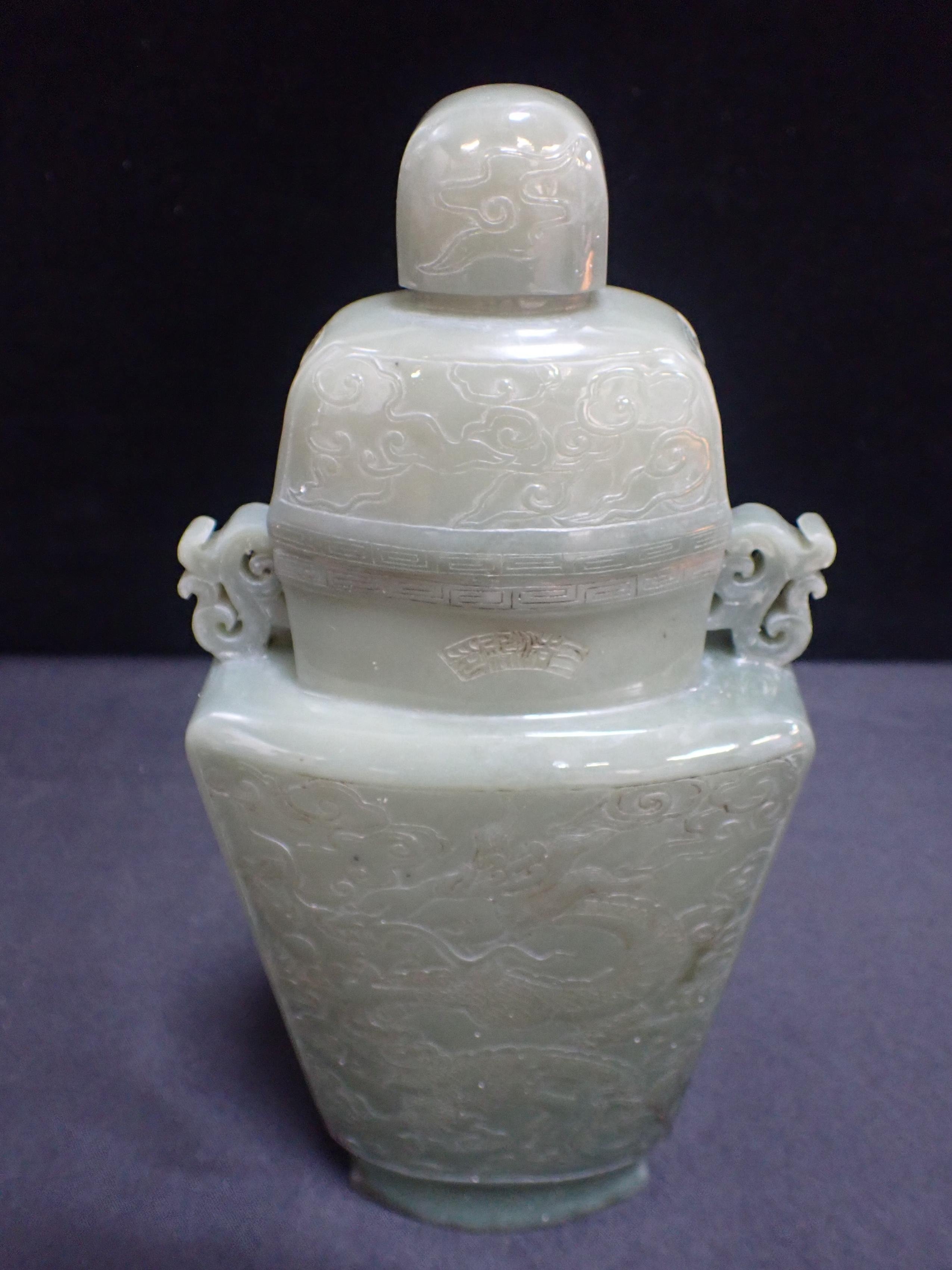 20th century, of tapered rectangular section, with pierced handles to the shoulder, carved in relief with dragons, 31cm high, in a fitted box