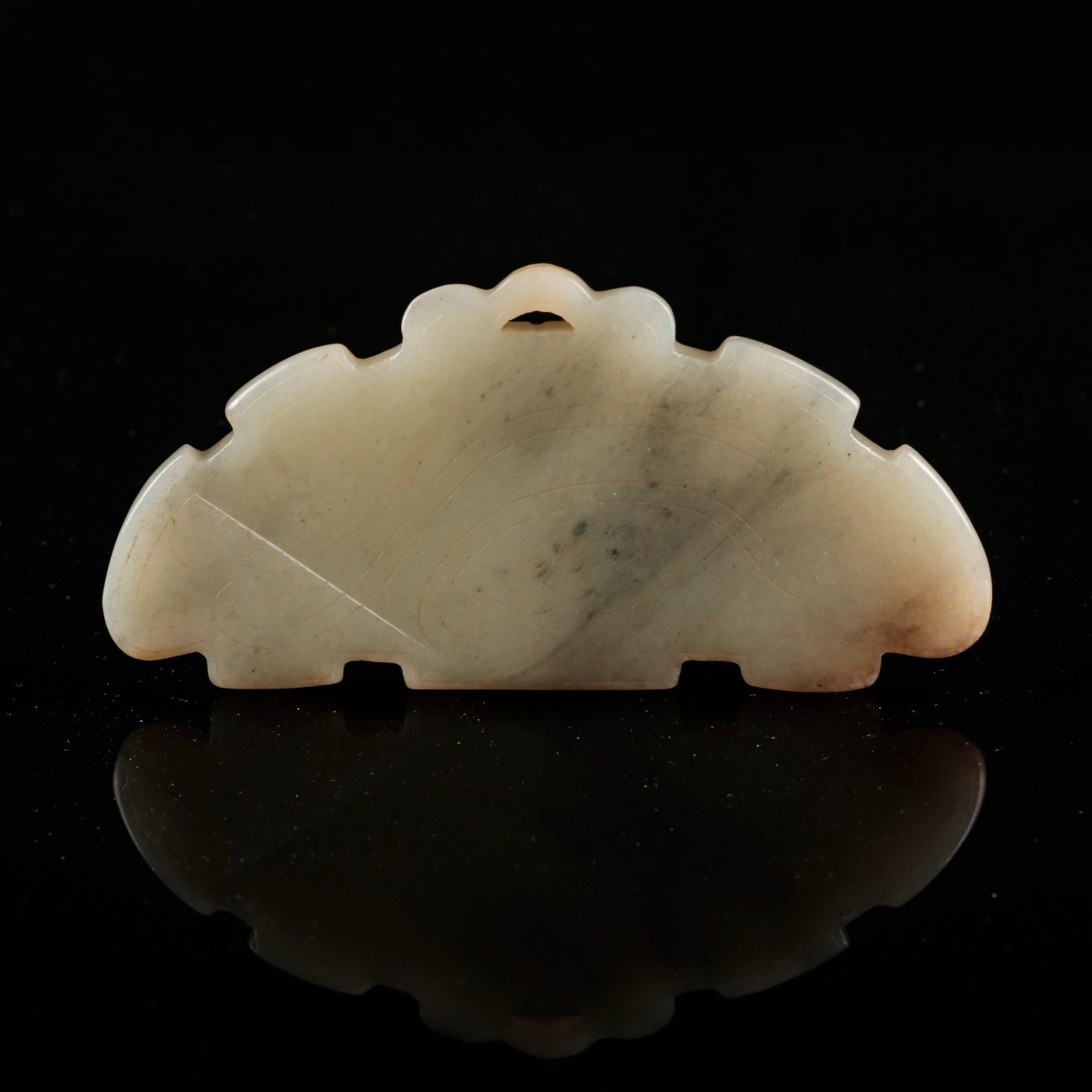 in archaistic form but late Qing dynasty or later, finely incised with a phoenix to one side, with natural russet inclusions, 9cm wide