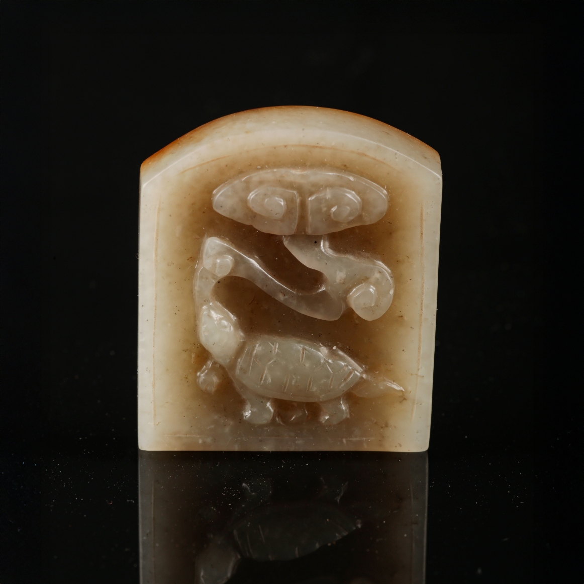 probably Ming dynasty, carved in relief with a turtle holding a lingzhi, four sets of small holes to the reverse, 4.5cm high x 4cm wide