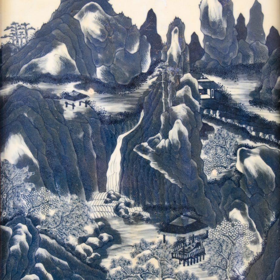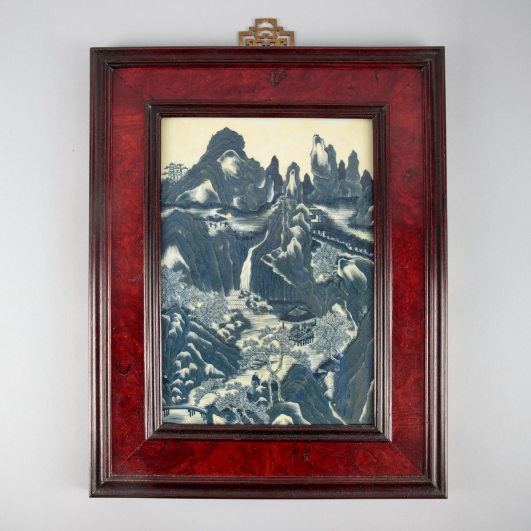 A CHINESE PORCELAIN BLUE AND WHITE PLAQUE