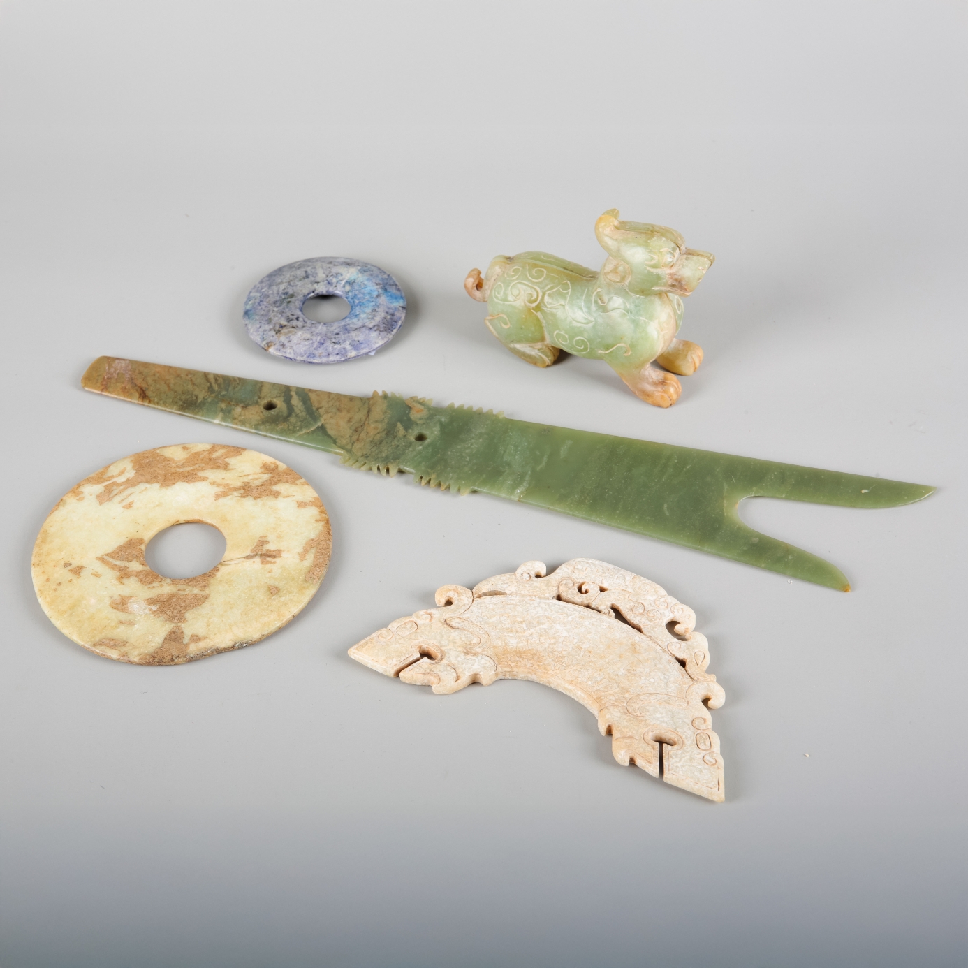 of tapered from with two-pronged end, 36cm long; together with a pierced jade archaistic plaque, 15cm wide; a lapis lazuli bi ring, 7.5cm diameter; a jade bi ring, 12cm diameter; and a carved jade figure of a mythical beast, with a central partition opening to reveal a moulded ancient character, 7cm high x 10cm long (5)