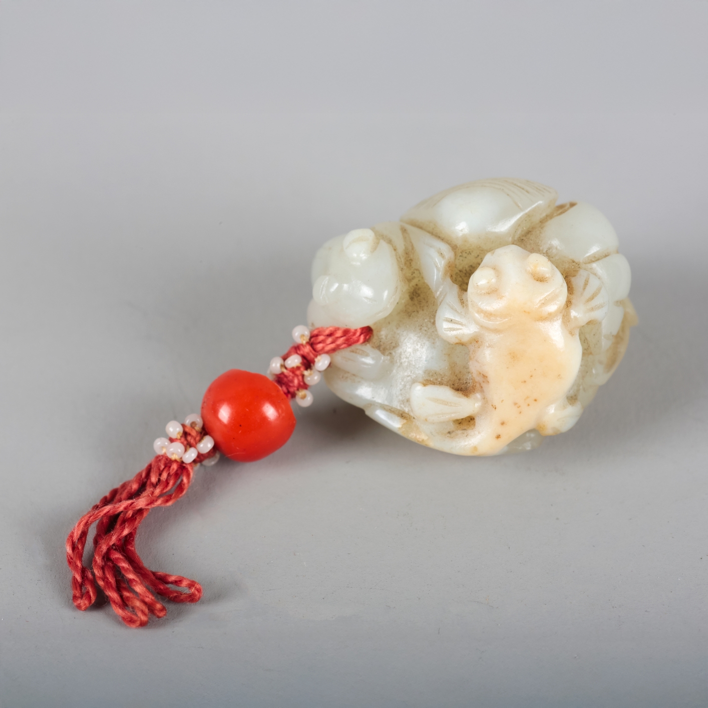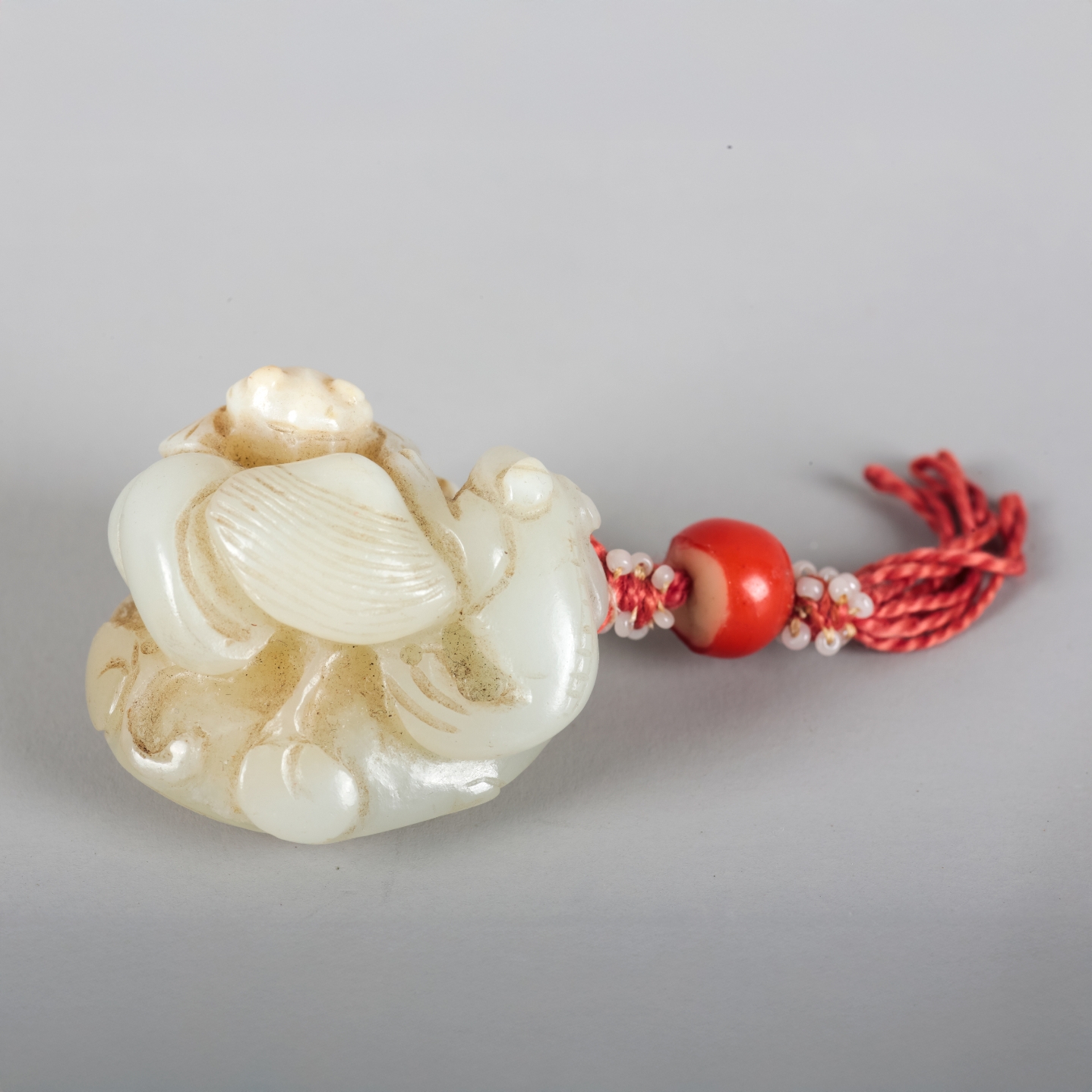The jade appears to be in fair condition, without damages or restoration. Some surface wear and light scratching, consistent with age and use. Build up of dirt/residue to the carving. Natural incluisons.