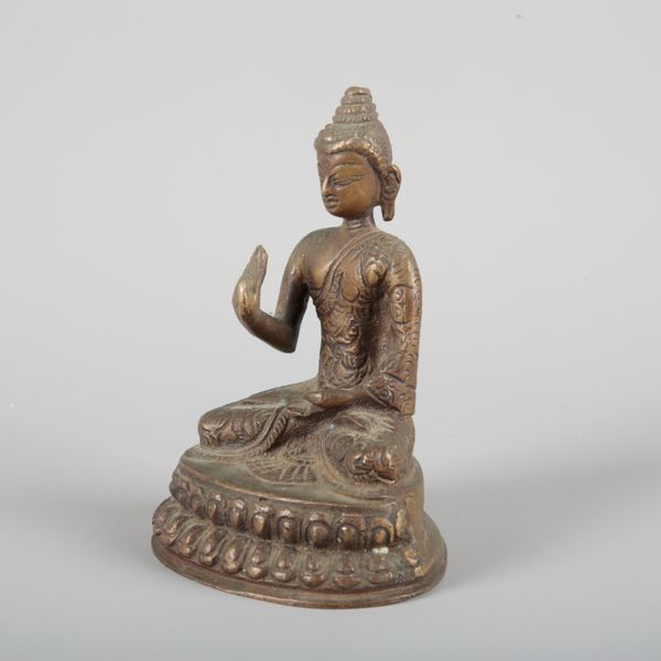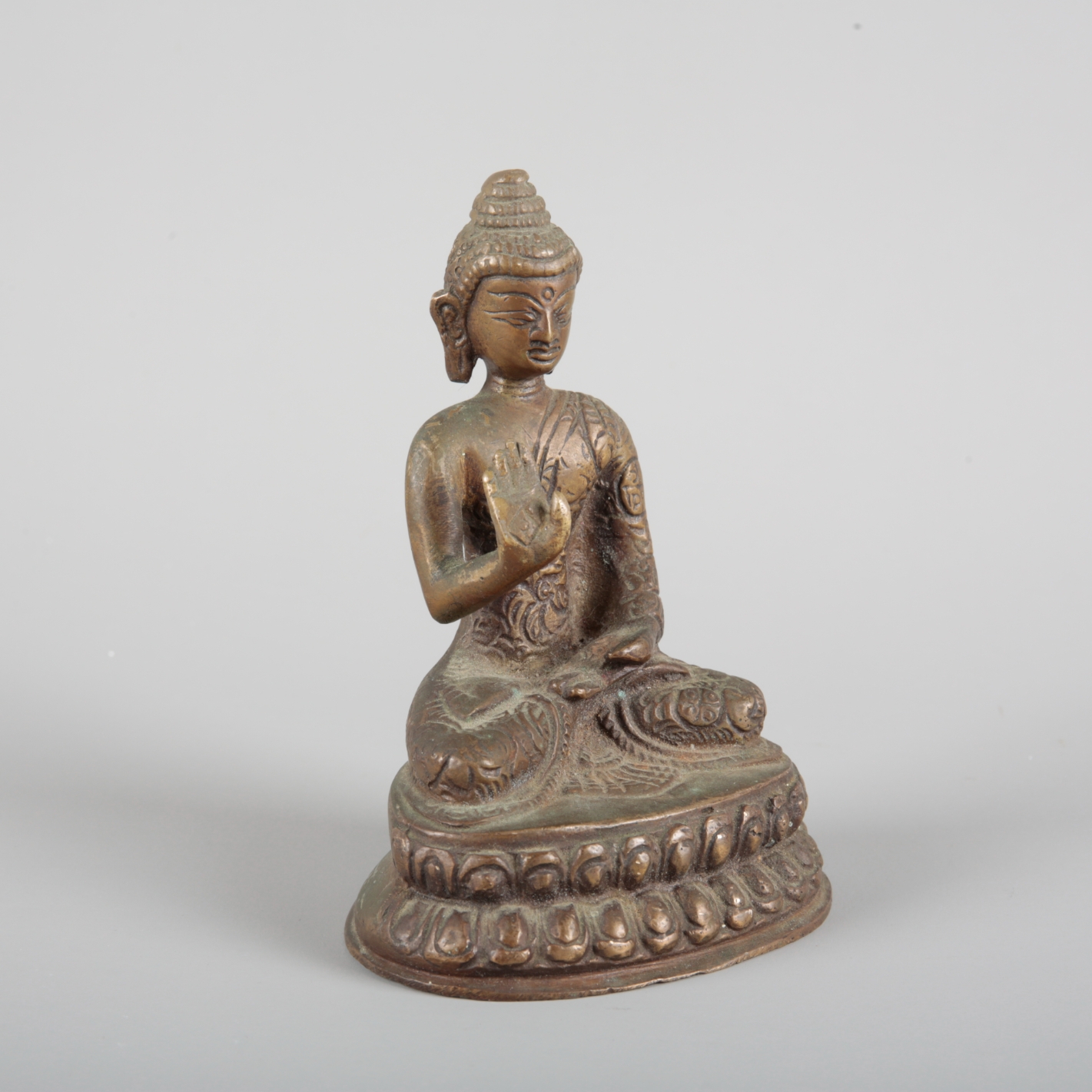 19th/20th century, modelled seated on a double lotus base, the right hand raised in abhaya mudra, 12.5cm high