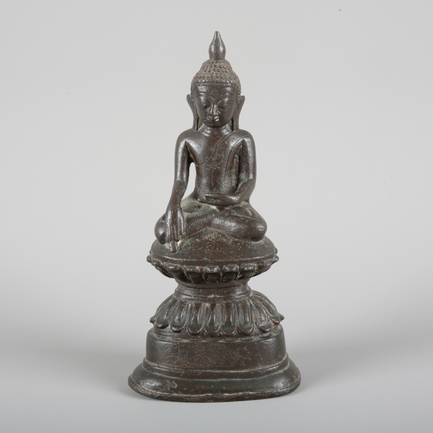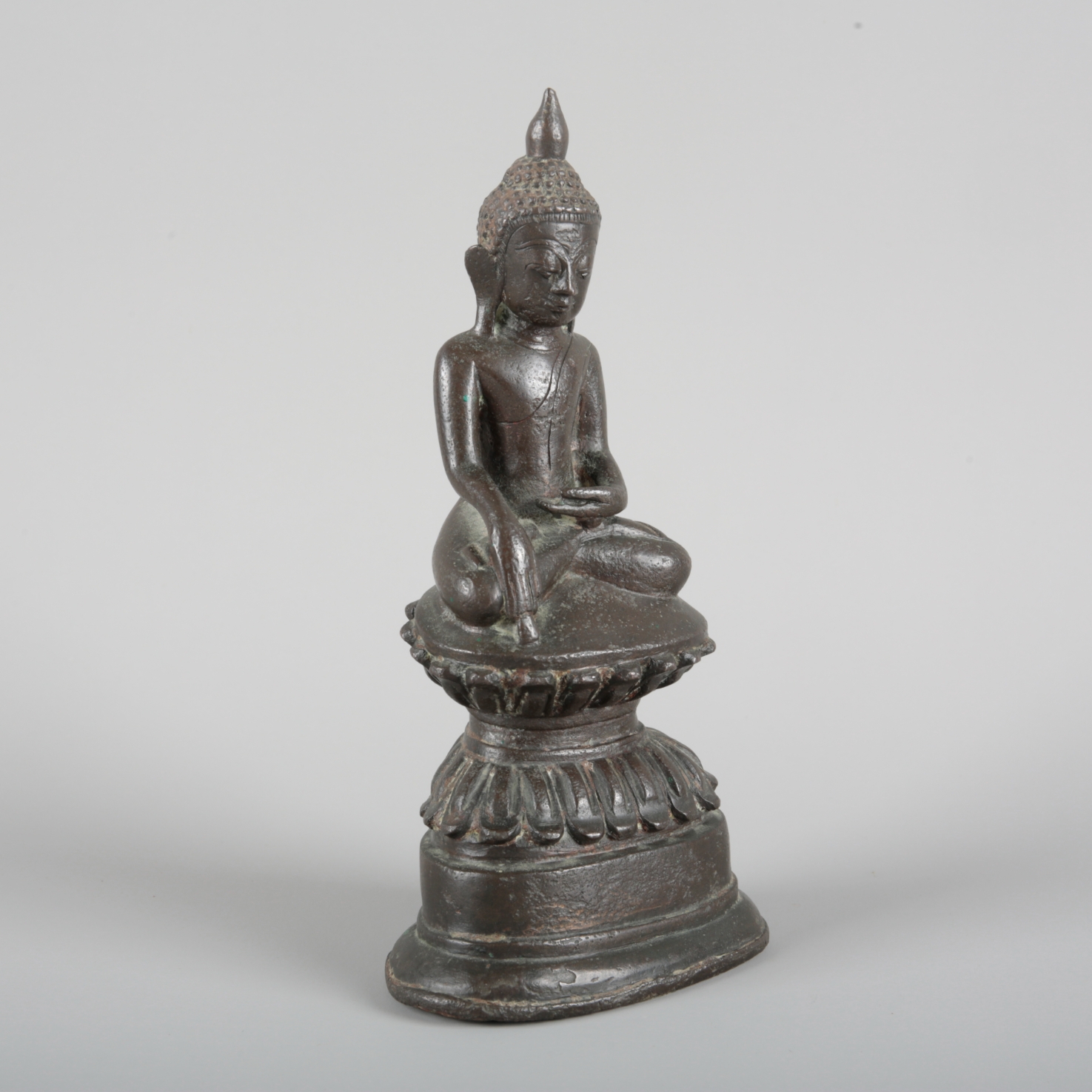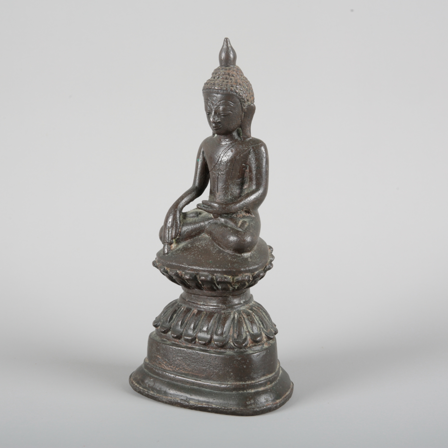 probably late 17th/18th century, modelled seated in lotus position on a double lotus base, the right hand lowered in bhumisparsa mudra, with elongated earlobes, tightly curled hair and ushnisha, 20cm high x 10cm wide