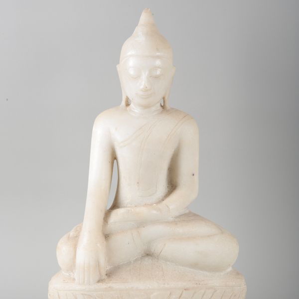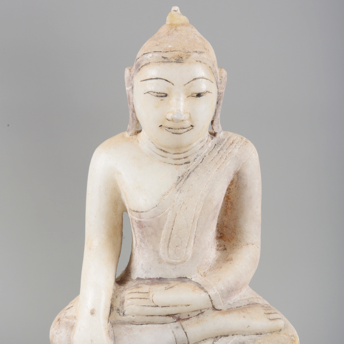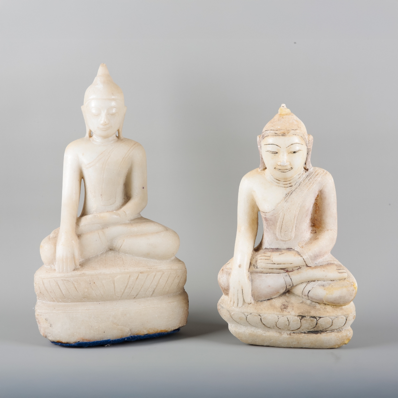 The smaller buddha has damage and restoration, there are large losses and a repair to the base. A large repair to the knee. Some small chips throughout, including to the top of the head. Remnants of old gold paint.
