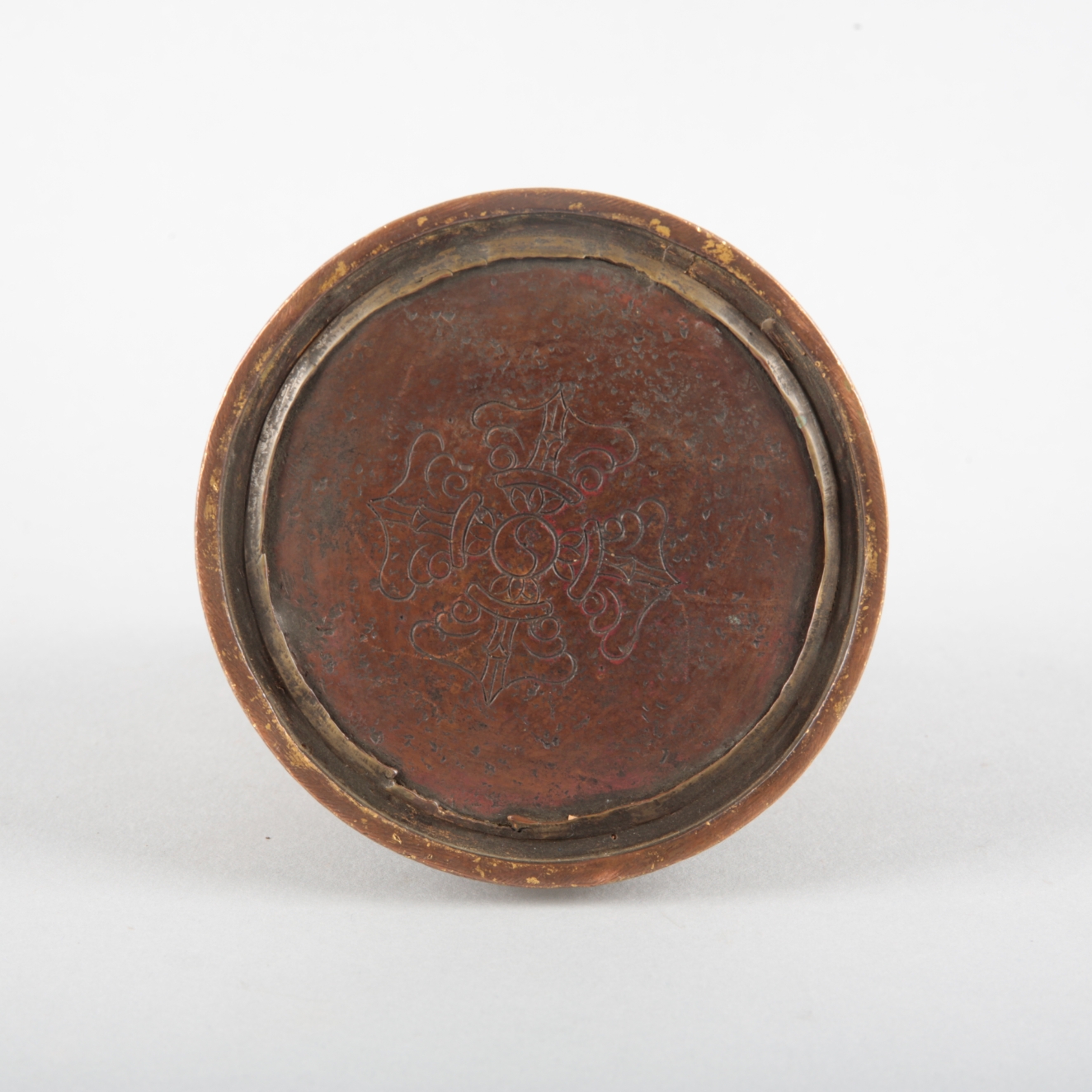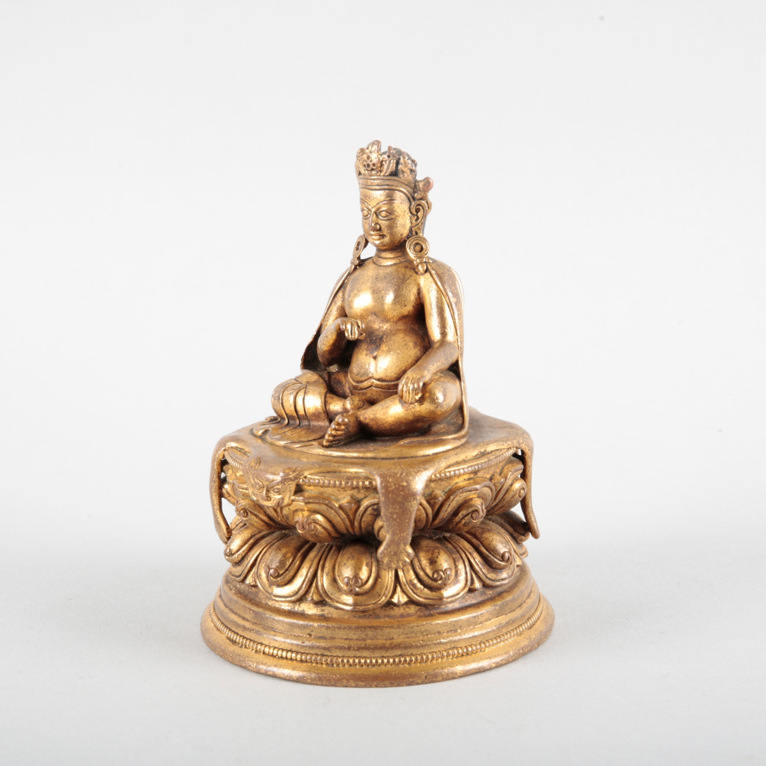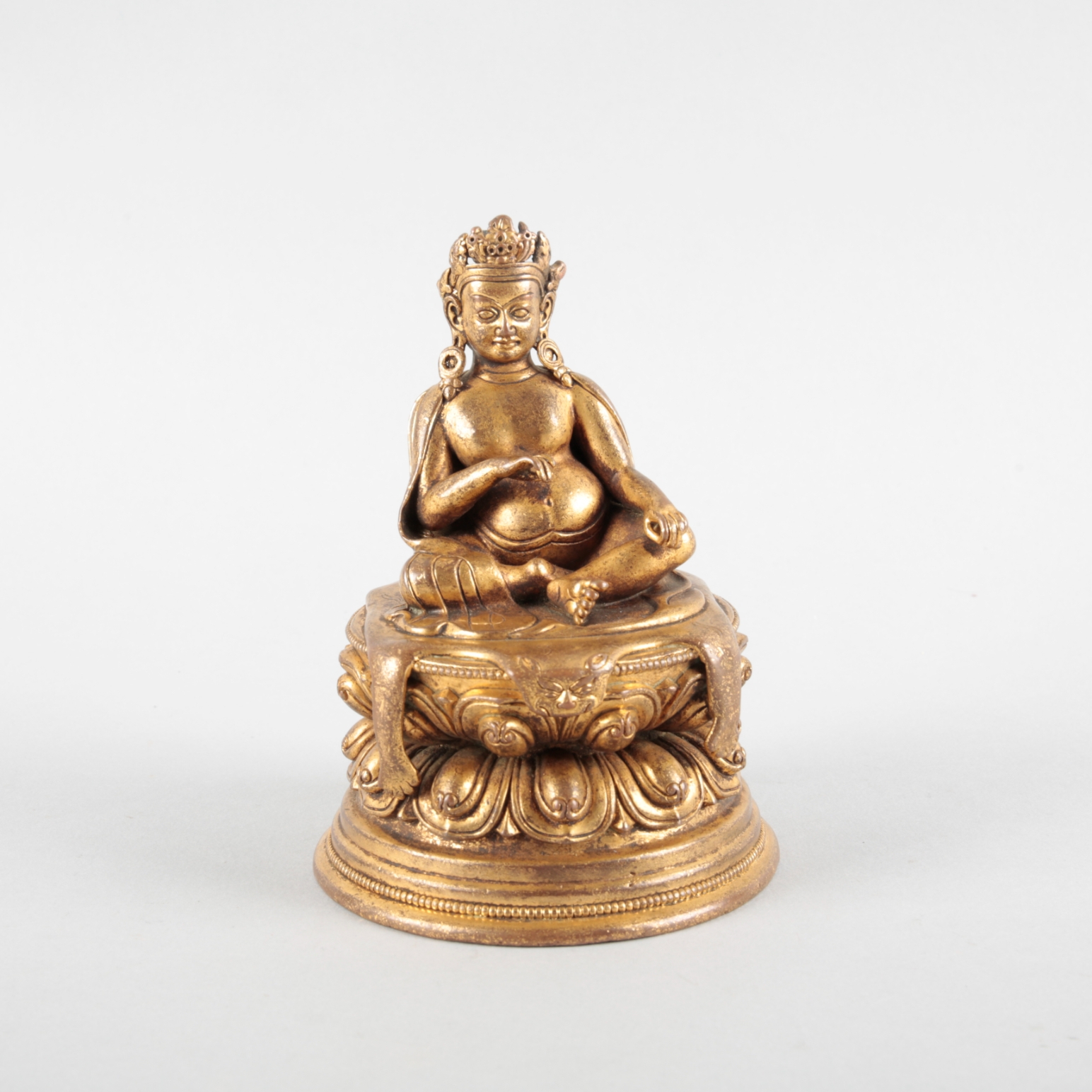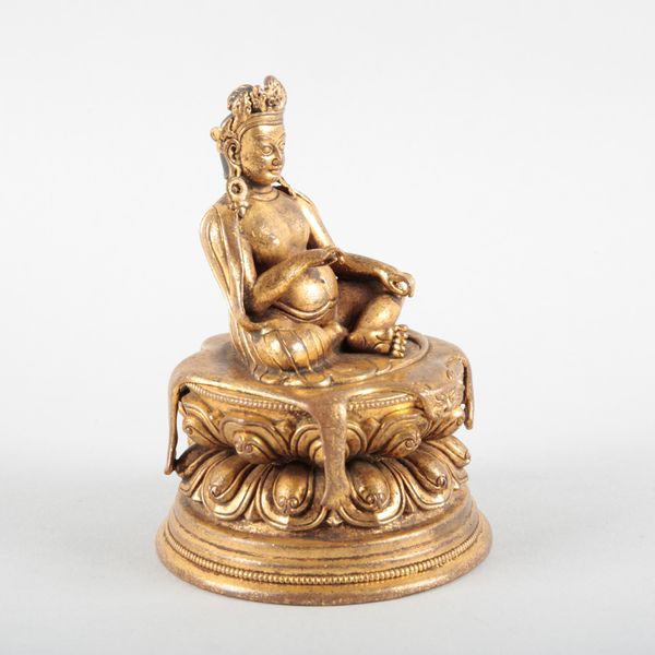 probably Ming dynasty, seated in a yogic pose on a double lotus base draped with a lion skin, wearing an elaborate headdress, heavy earrings and a cloak, a floral medallion engraved to the underside, 13cm high