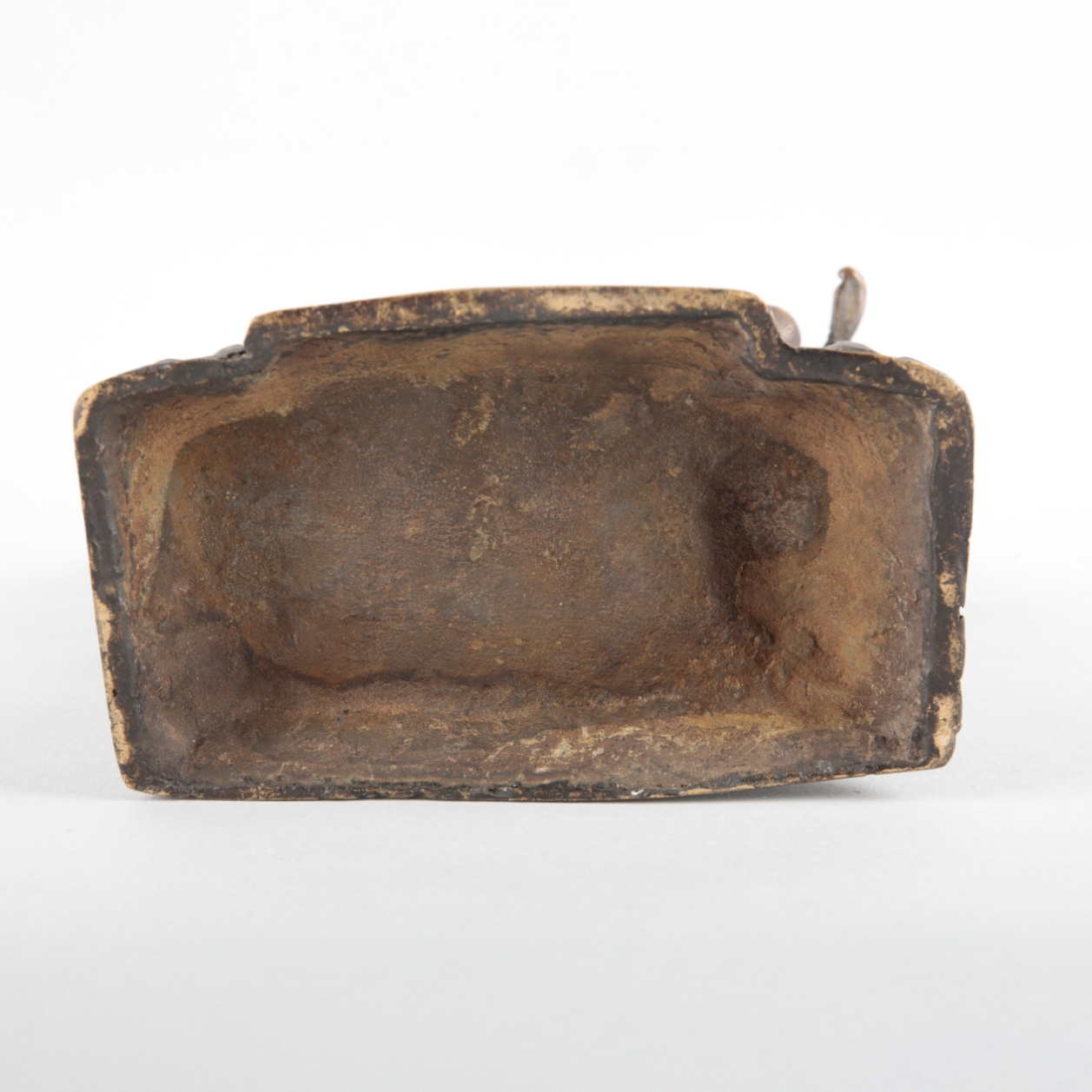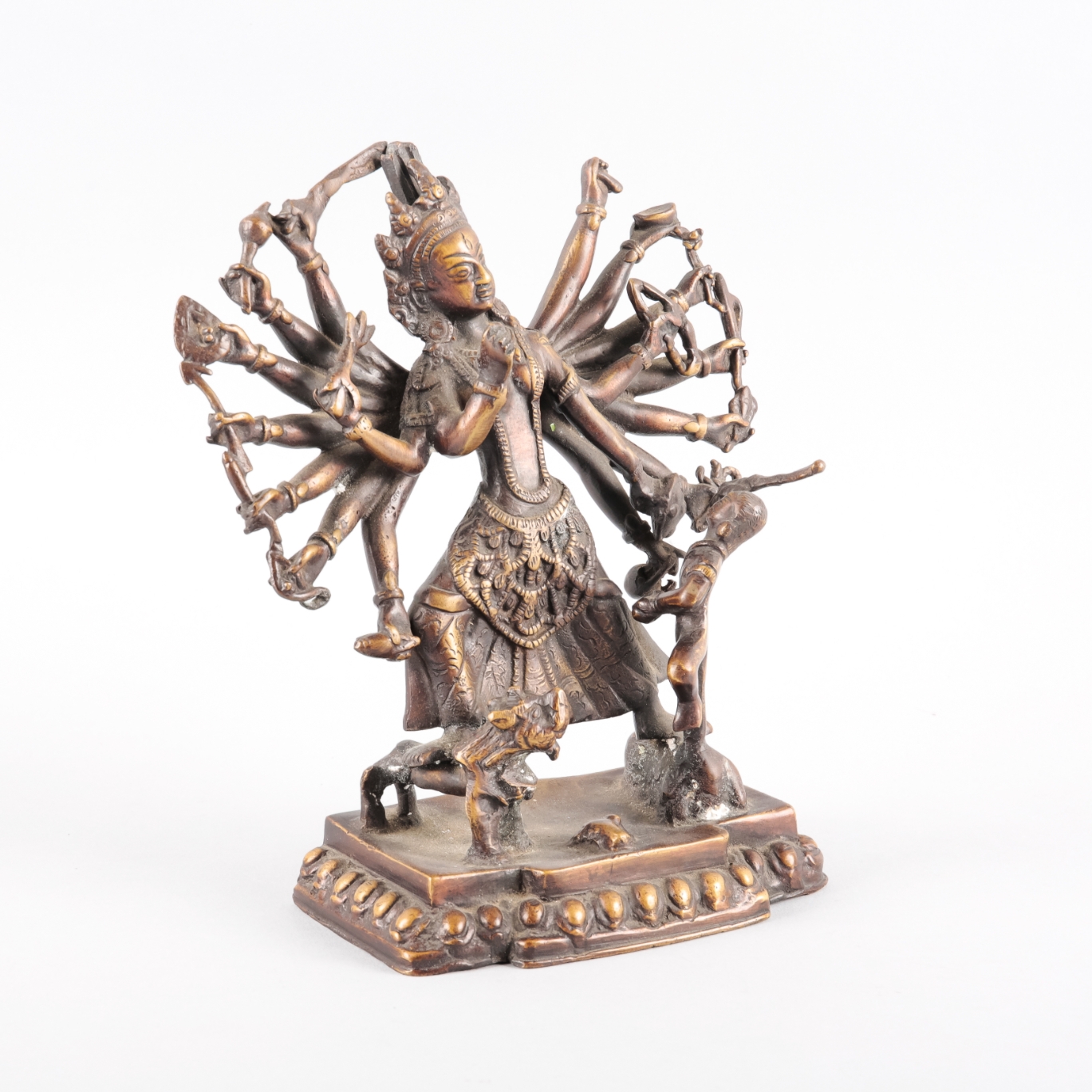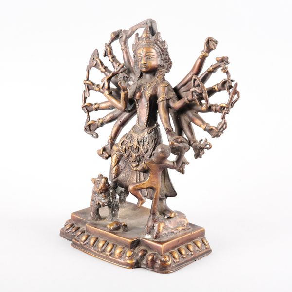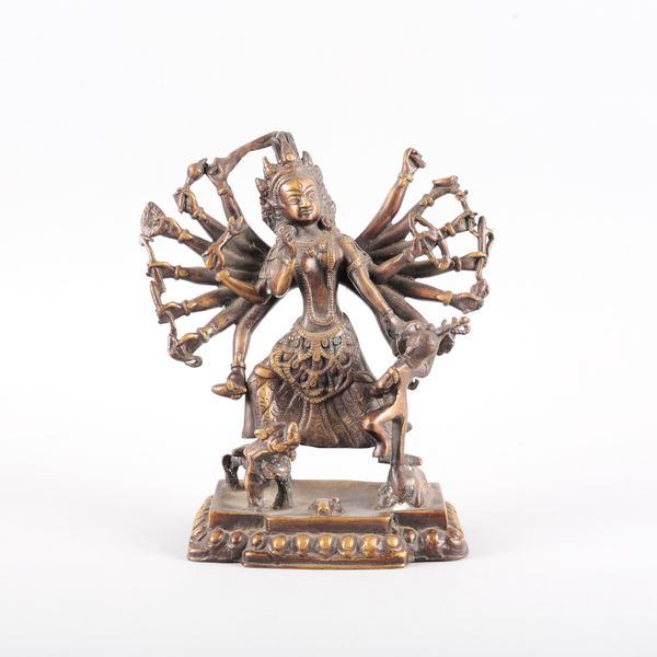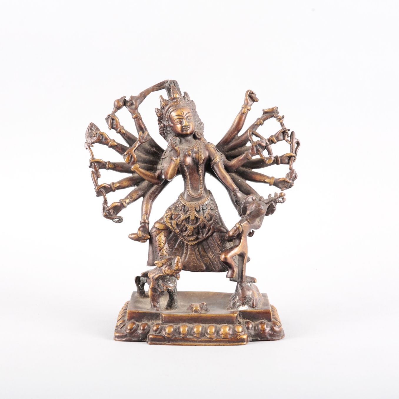 19th/20th century, depicting the goddess Durga slaying the demon Mahishasura, symbolizing the triumph of good over evil, on a breakfront moulded base, 24cm high x 22cm wide