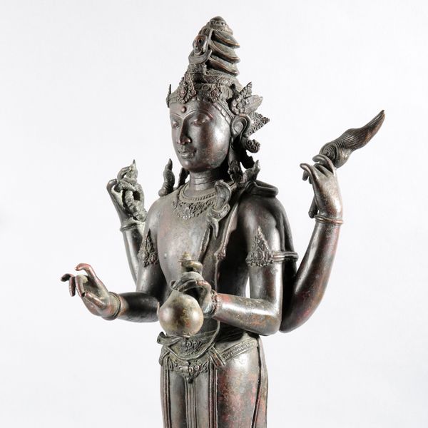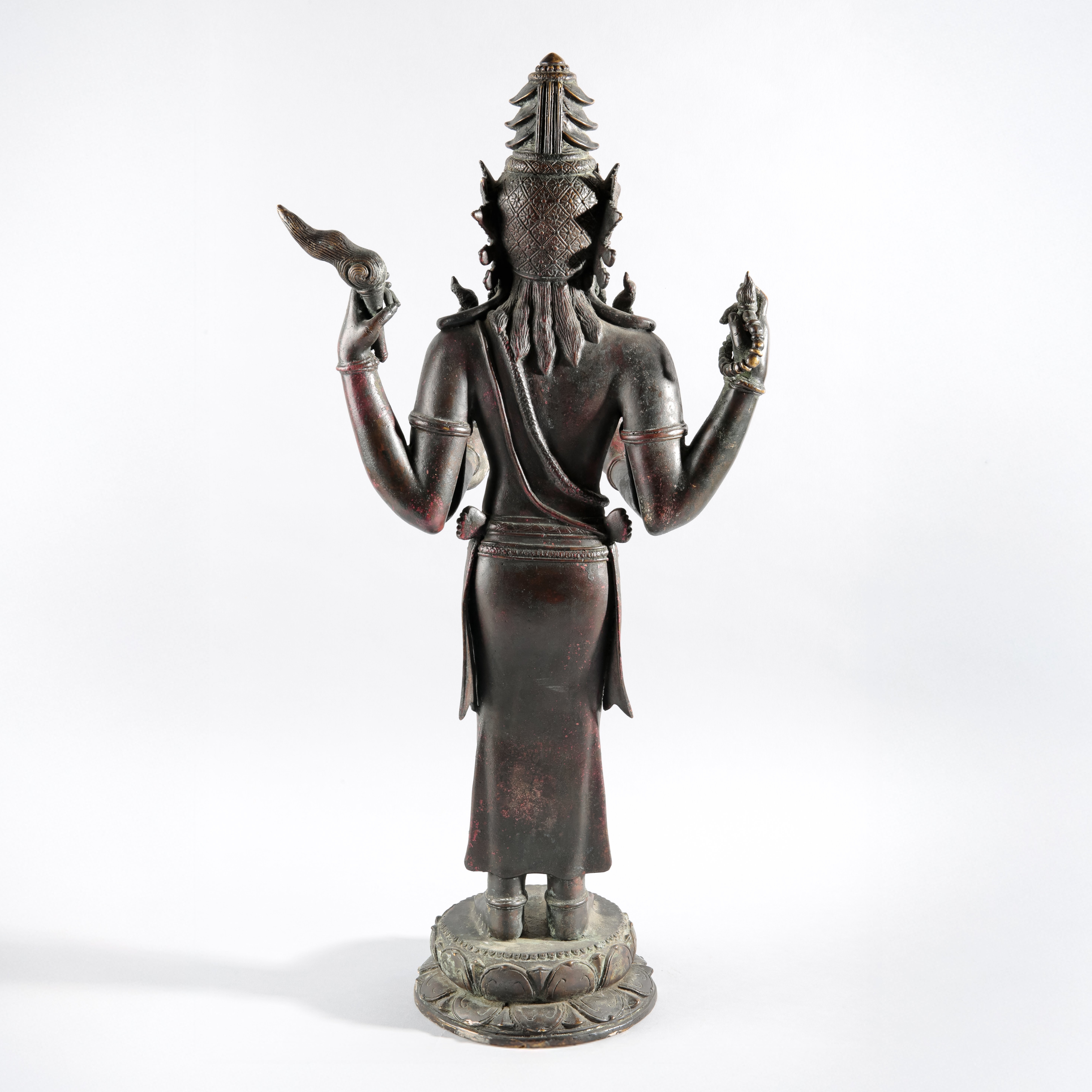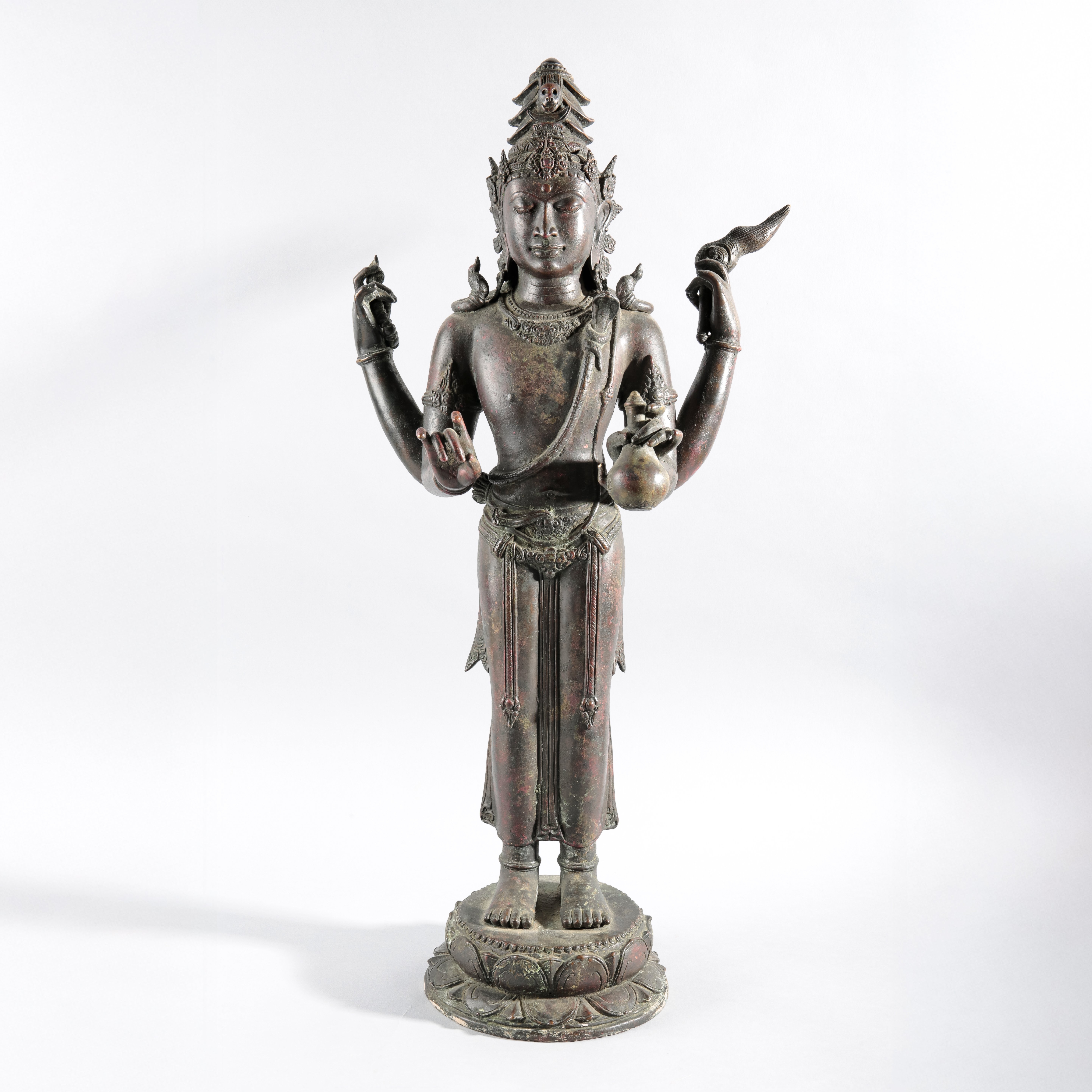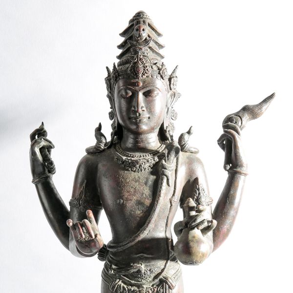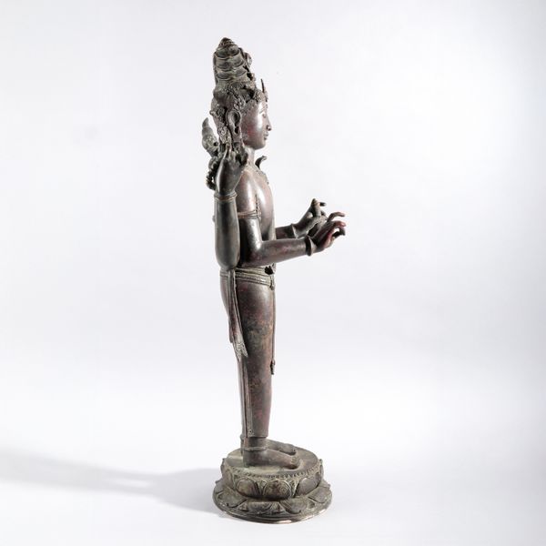 probably 9th-11th century Eastern period, finely cast modelled standing on a double lotus base, holding in his hands a Camara, a Kamandalu and an Aksamala, his fourth raised in Karana Mudra, elaborately dressed in a crown fitted with customary skull and crescent moon, a brahmin cord with a cobra head terminal over one shoulder, 80cm high