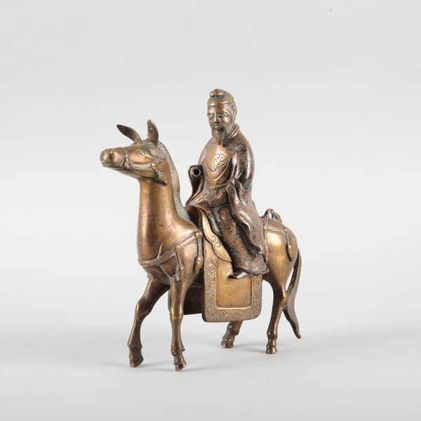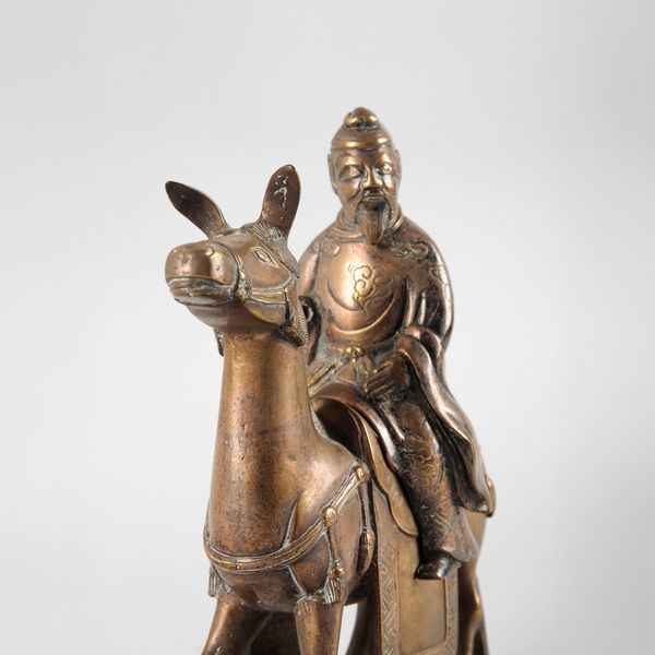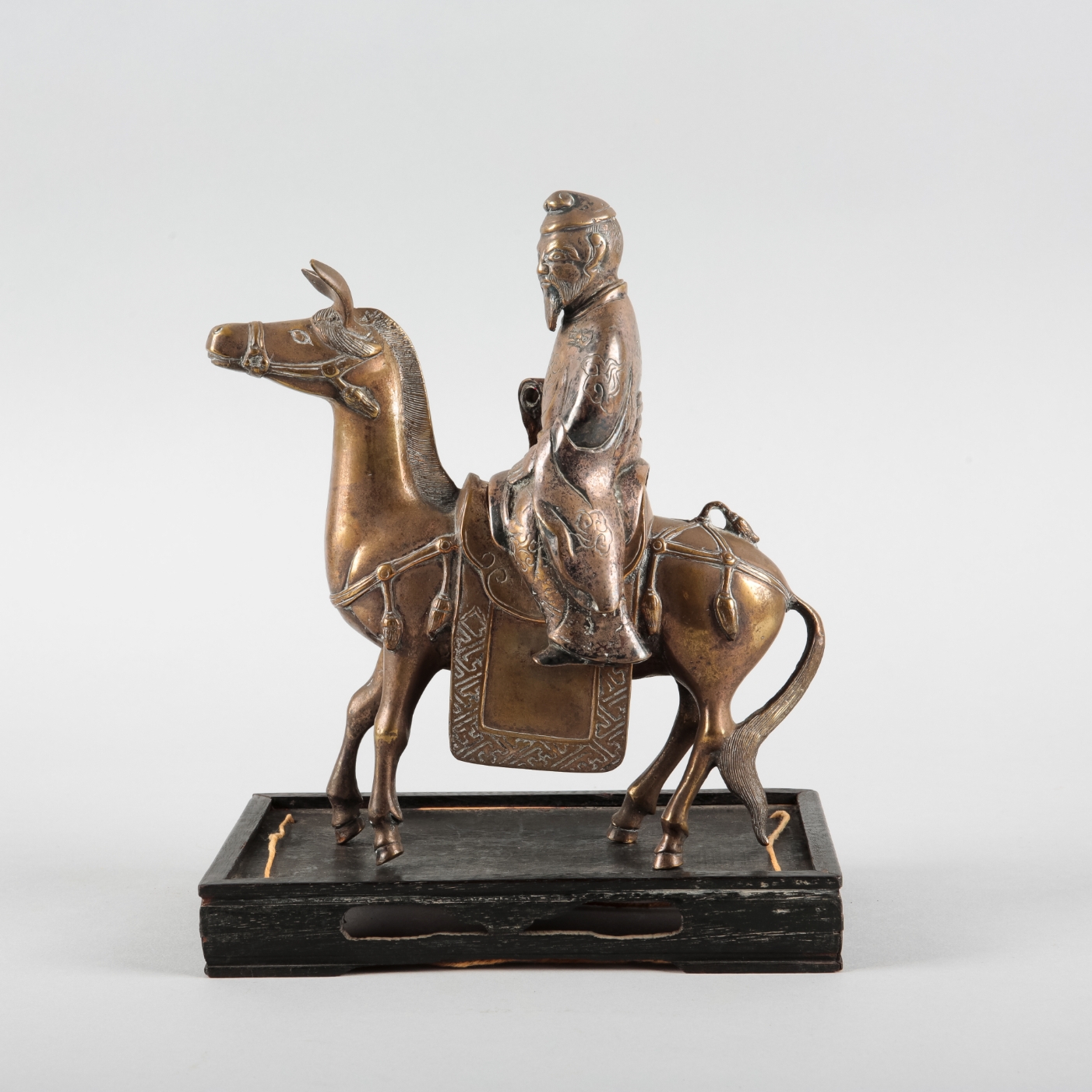 Qing dynasty, modelled as a figure on horseback, probably the warrior god Guan Yu, seated on his favoured mount 'Red Hare', 22cm high x 22cm wide, on a wooden plinth base