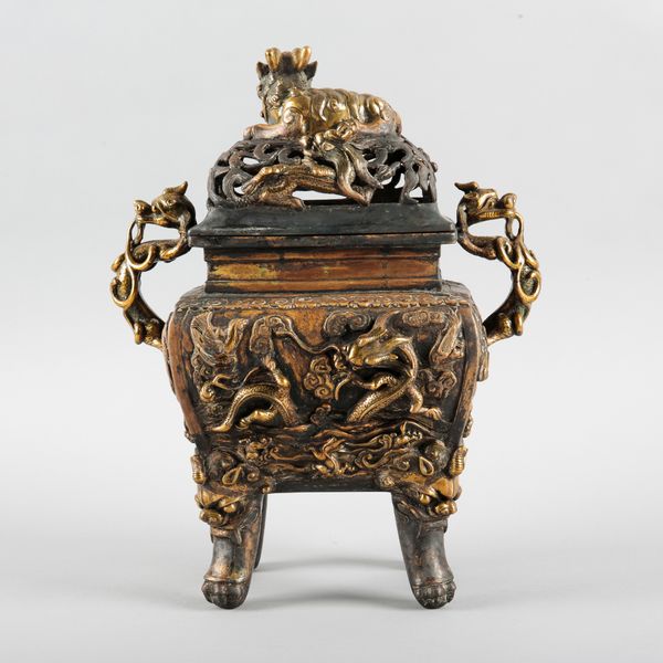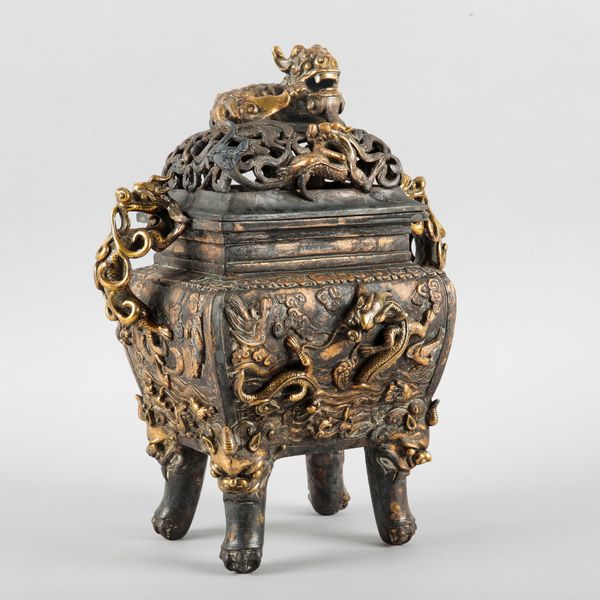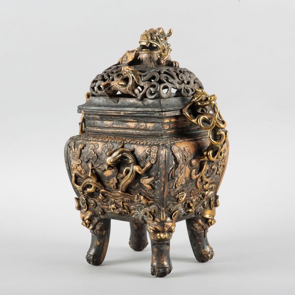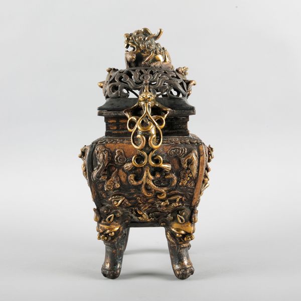 the base bearing a six character Xuande mark, Qing dynasty, the pierced and domed top decorated with a recumbent beast, the twin handles in the forms of dragons, each of the side panels decorated in relief with an abundance of mythical beasts in seas and sky, on four clawed legs issuing from beast head terminals, 38cm high x 29cm wide x 18cm deep, weight c.10kg