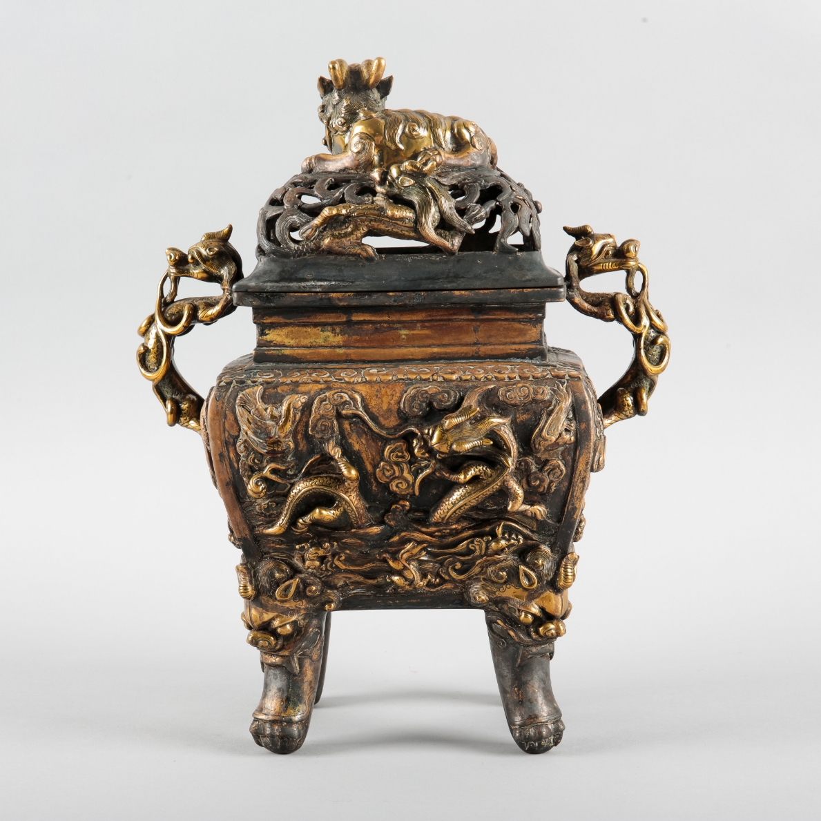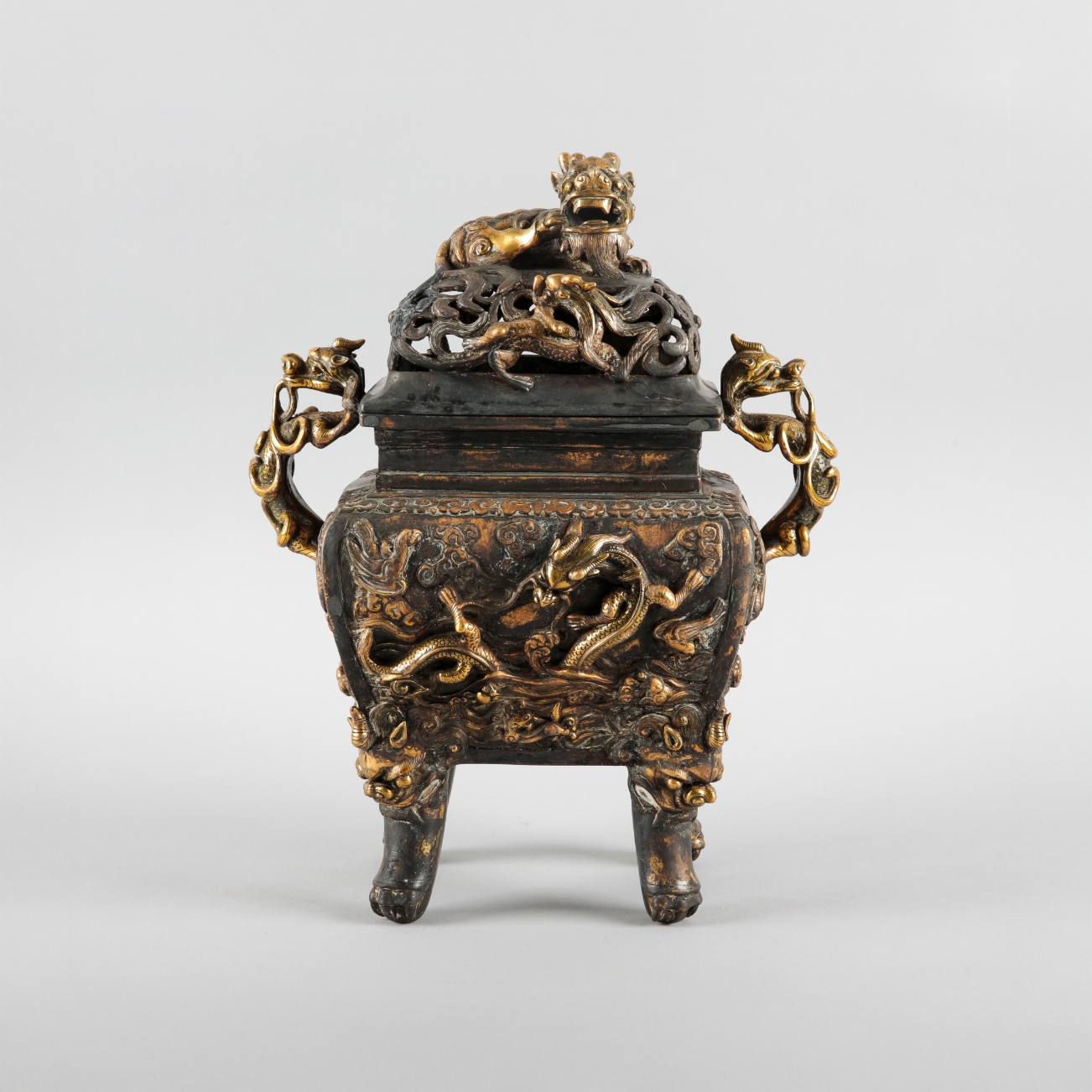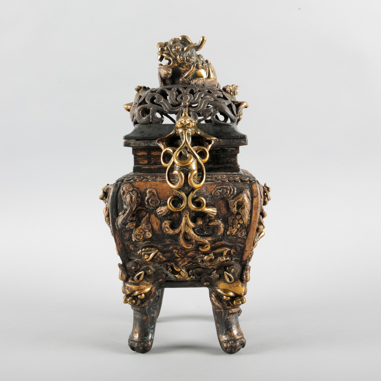 A LARGE CHINESE BRONZE AND PARCEL GILT CENSER