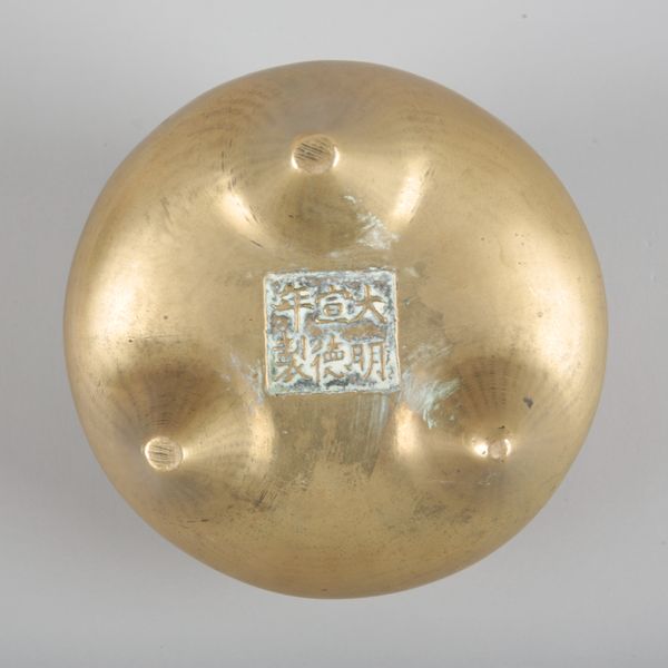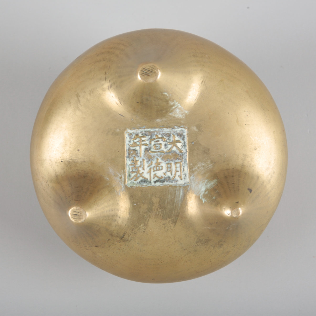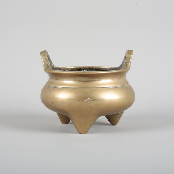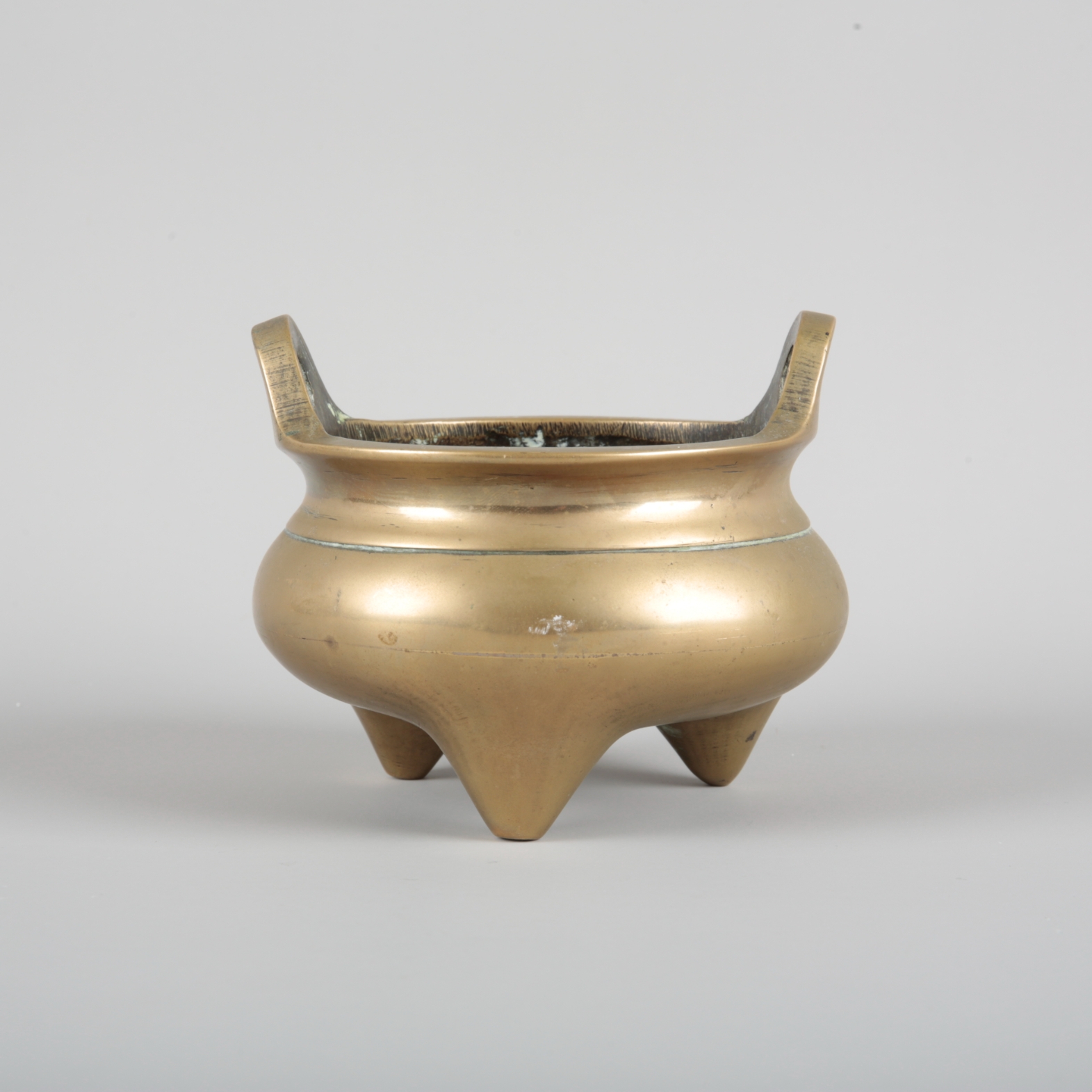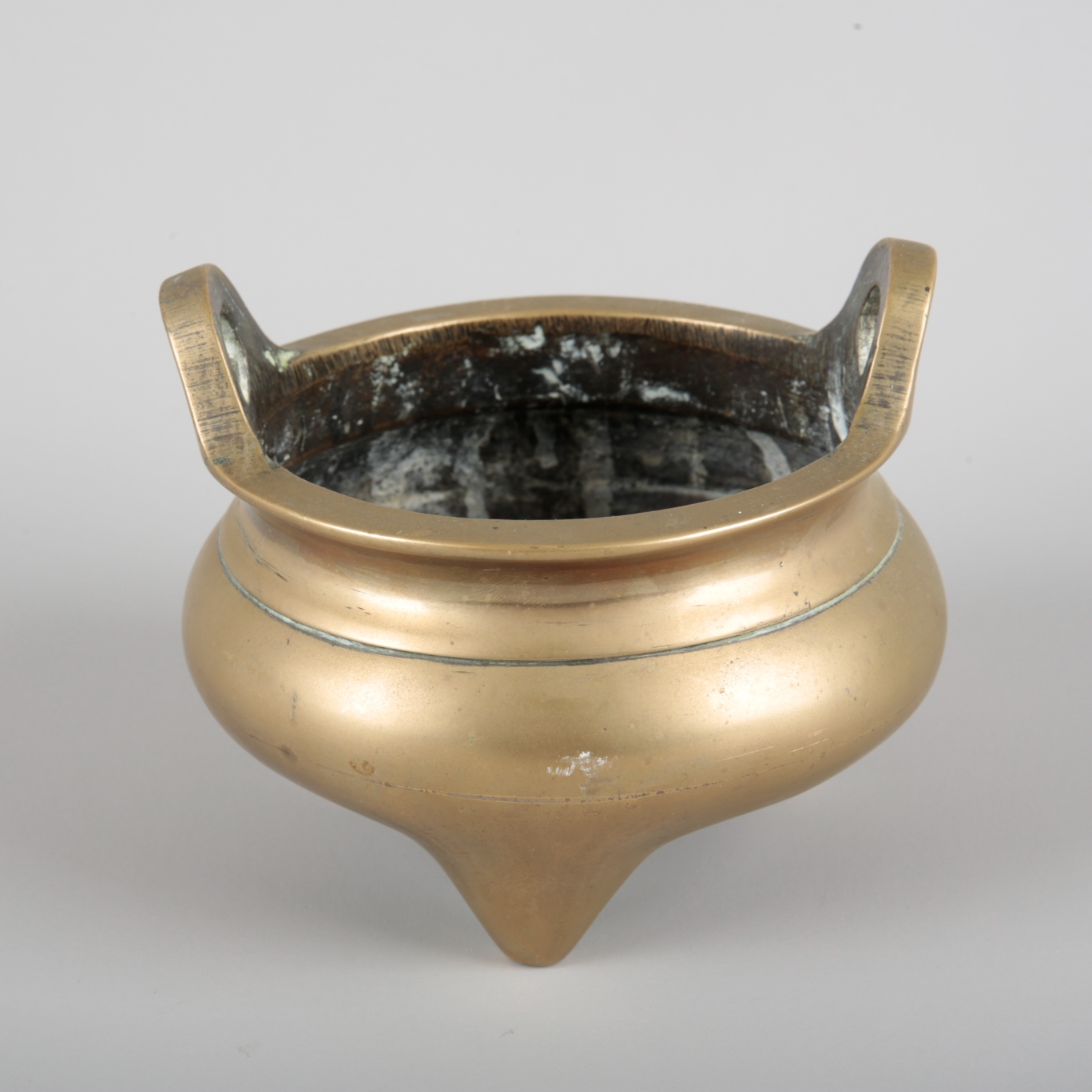 bearing a six character Xuande mark to the base but later, with two handles over a turned bowl, 11cm high x 13cm wide