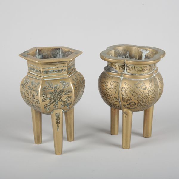 20th century, one of hexagonal section, engraved with floral panels, 10cm high; the other quatrefoil, decorated with phoenixes in flight, 9.5cm high (2)