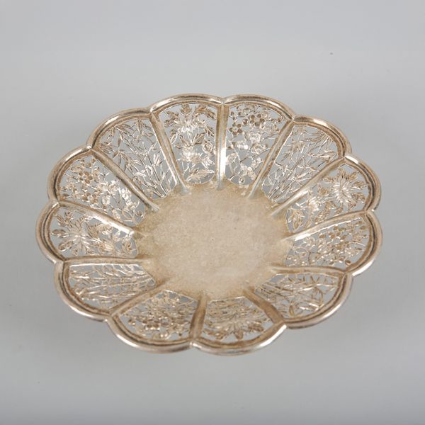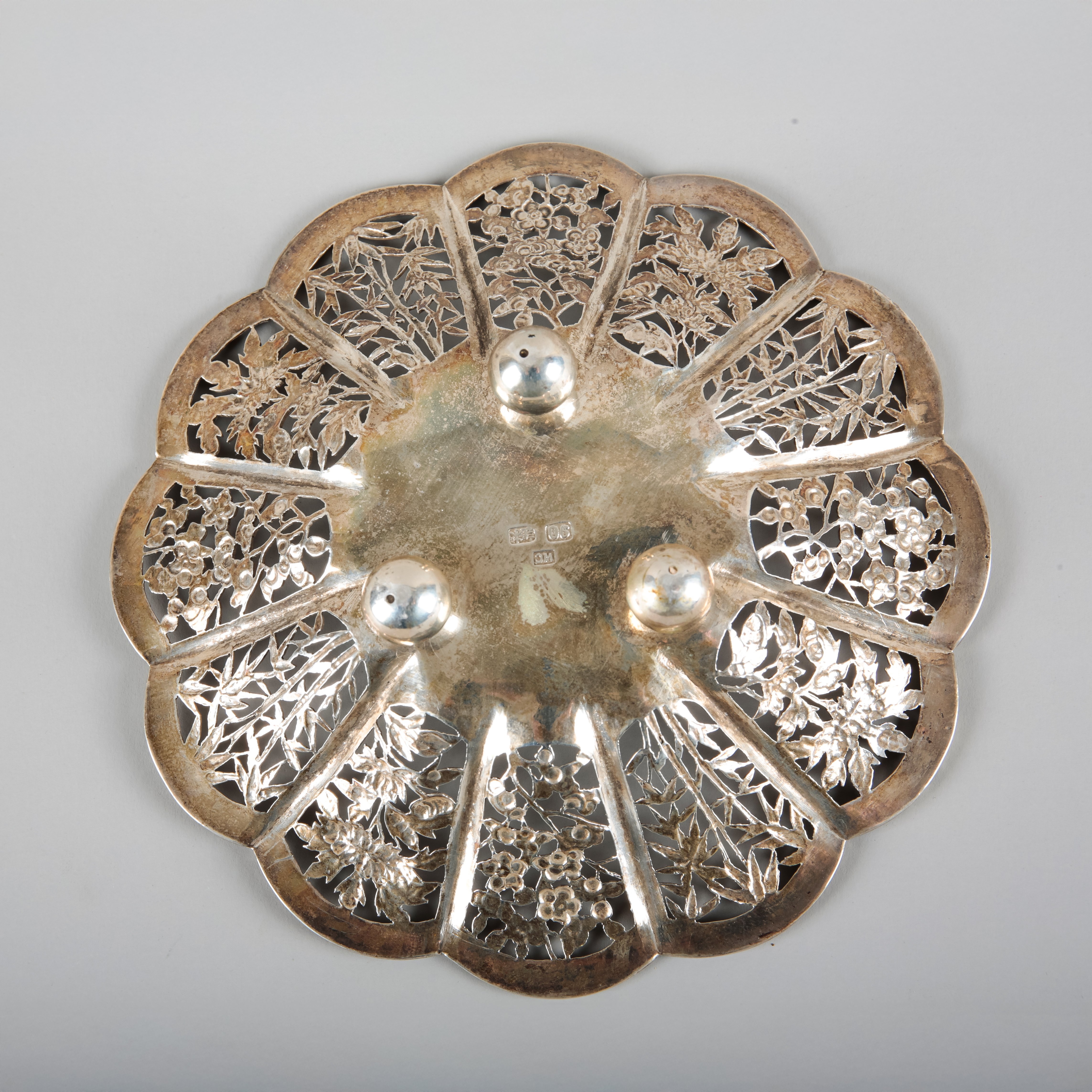 c.1900, the round dish with pierced sides decorated with bamboo and floral piercings, on three ball feet, marked 90, 14cm wide, 3.8 tr. ozs