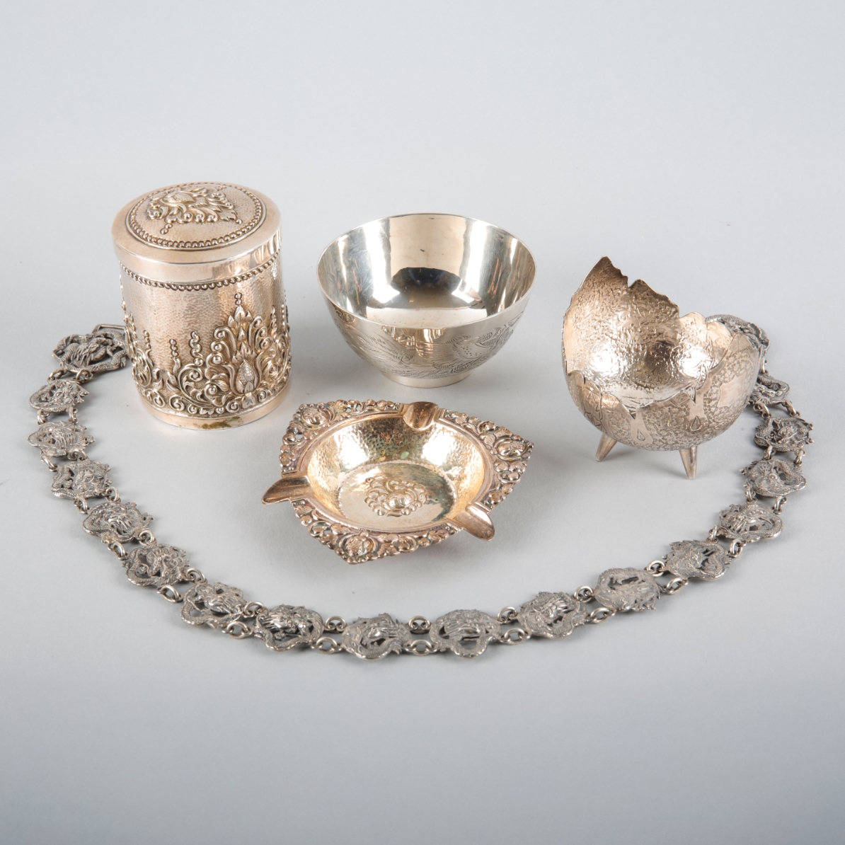 including a belt of dragon roundels stamped 'LW', probably Luen Wo, 66cm long; a cylindrical box and cover, stamped '800 SK', 9.5cm high; a similar ash tray, stamped '800 DO'; and two white metal bowls (5)