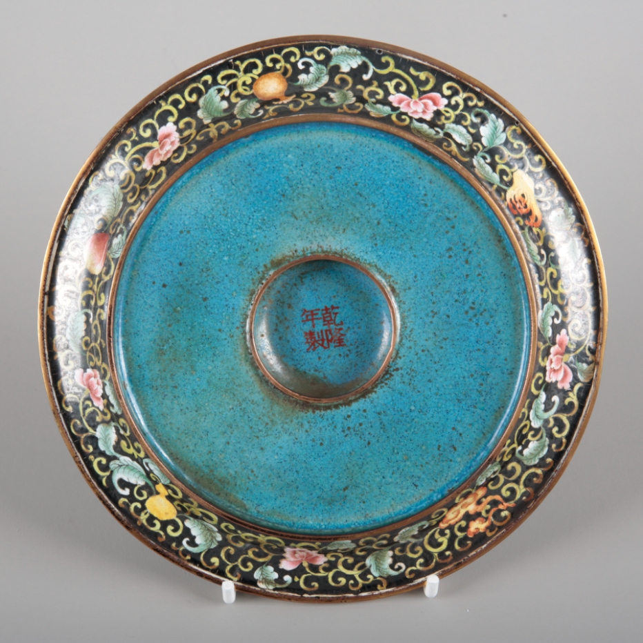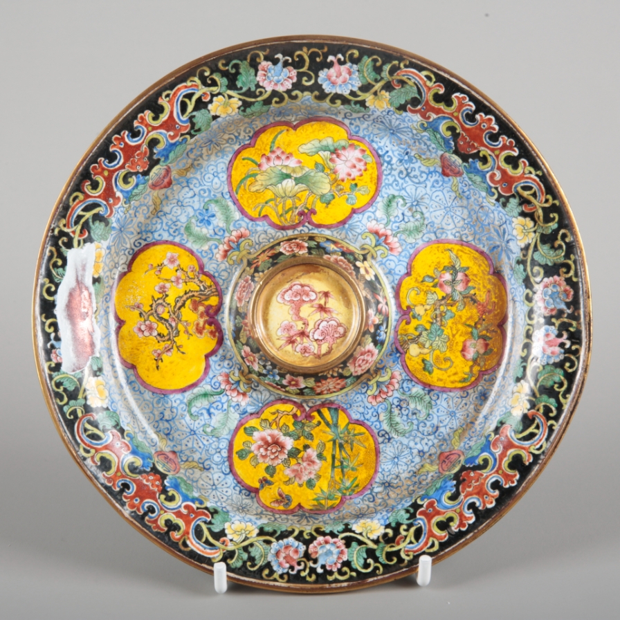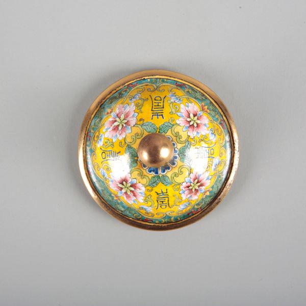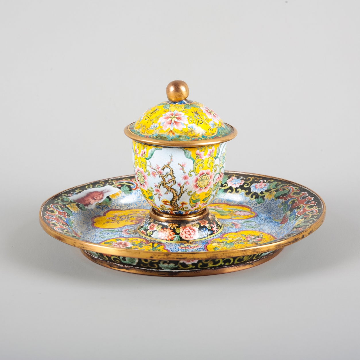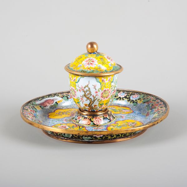 There are a few damages, including an area of damage to the enamel on the saucer. The finial is bent and mishapen. The rim and interior rim are dented. There is wear and tarnishing to the metal throughout. There is pitting and discolouration to the enamel, some crazing and manufacturing flaws.