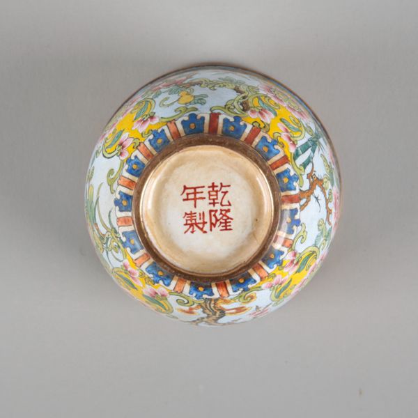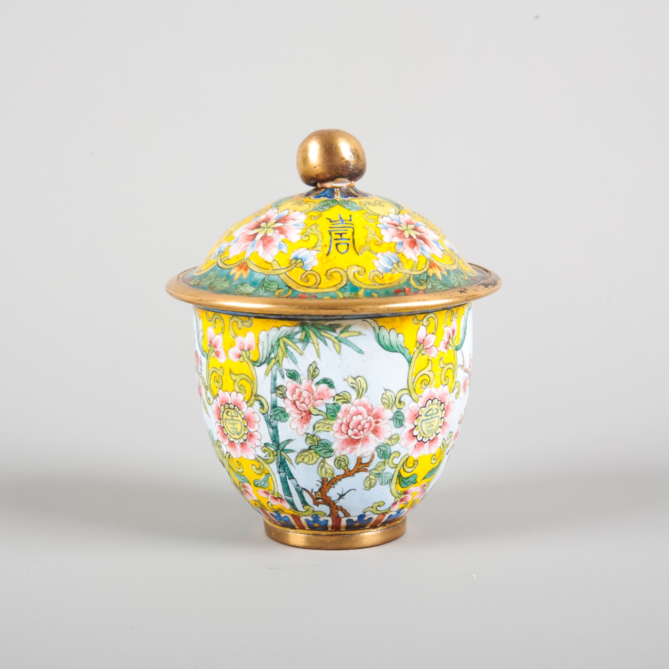 bearing a four character Qianlong mark to the base of the cup and the saucer, the domed cover with a gilt finial and gilded rims throughout, the cover and cup decorated with shou symbols and panels of blossoming trees, the saucer with a pale blue ground with four similar vignettes, 9.5cm high overall x 16cm diameter