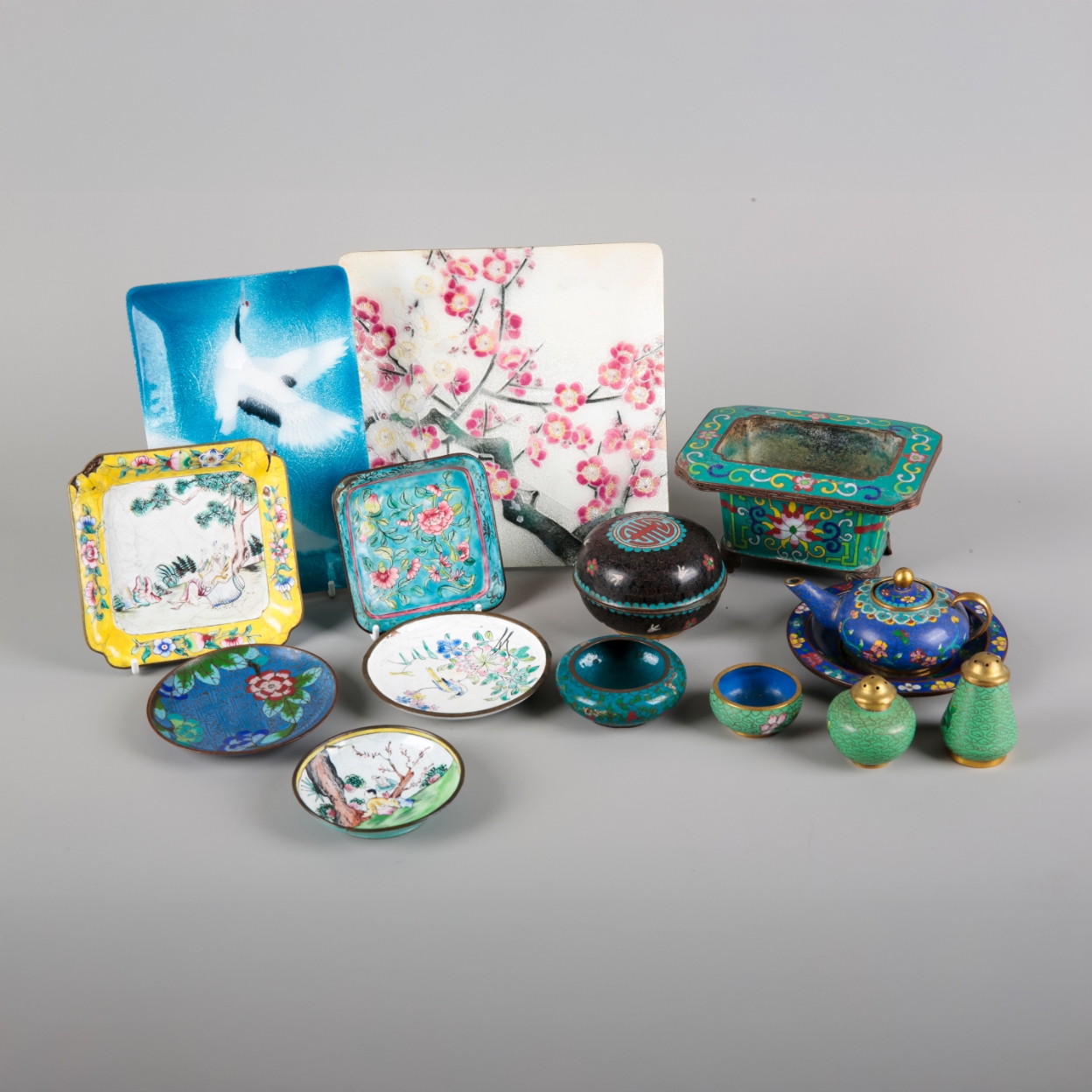 Parts of the lots are in various conditions, ranging from fair to others showing clear signs of damage. Plates are in fair condition, and decorative trays show crackling, with chipping to enamel evident throughout. Tarnishing and oxidation are present on the interior of the jardinière and plates. small plates exhibit signs of cracking. Additional photos are available on request.