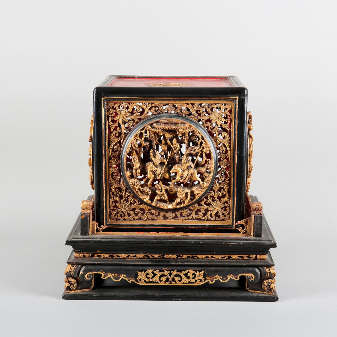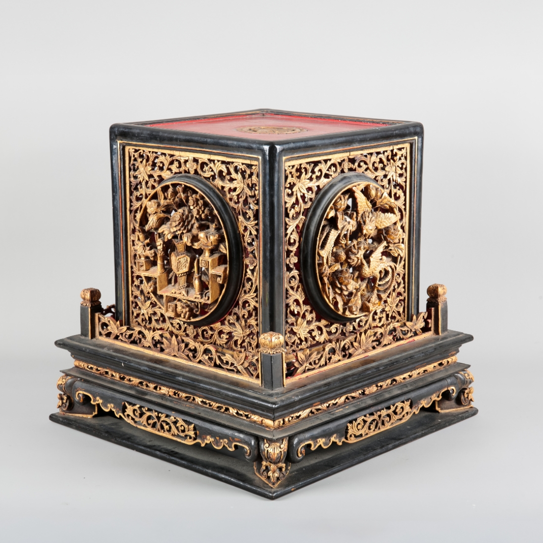 A CHINESE BLACK LACQUER, RED LACQUER AND CARVED GILTWOOD ALTAR BOX