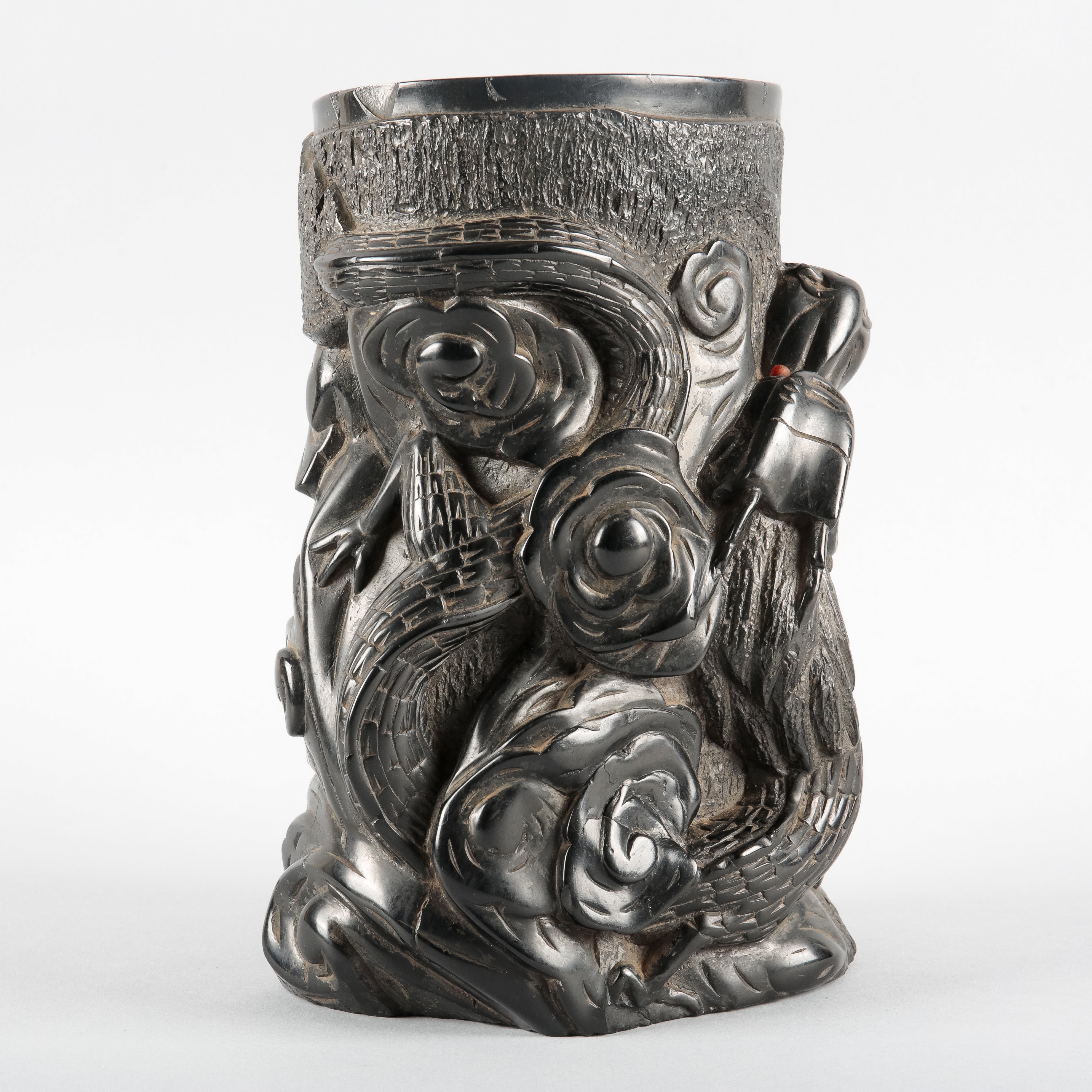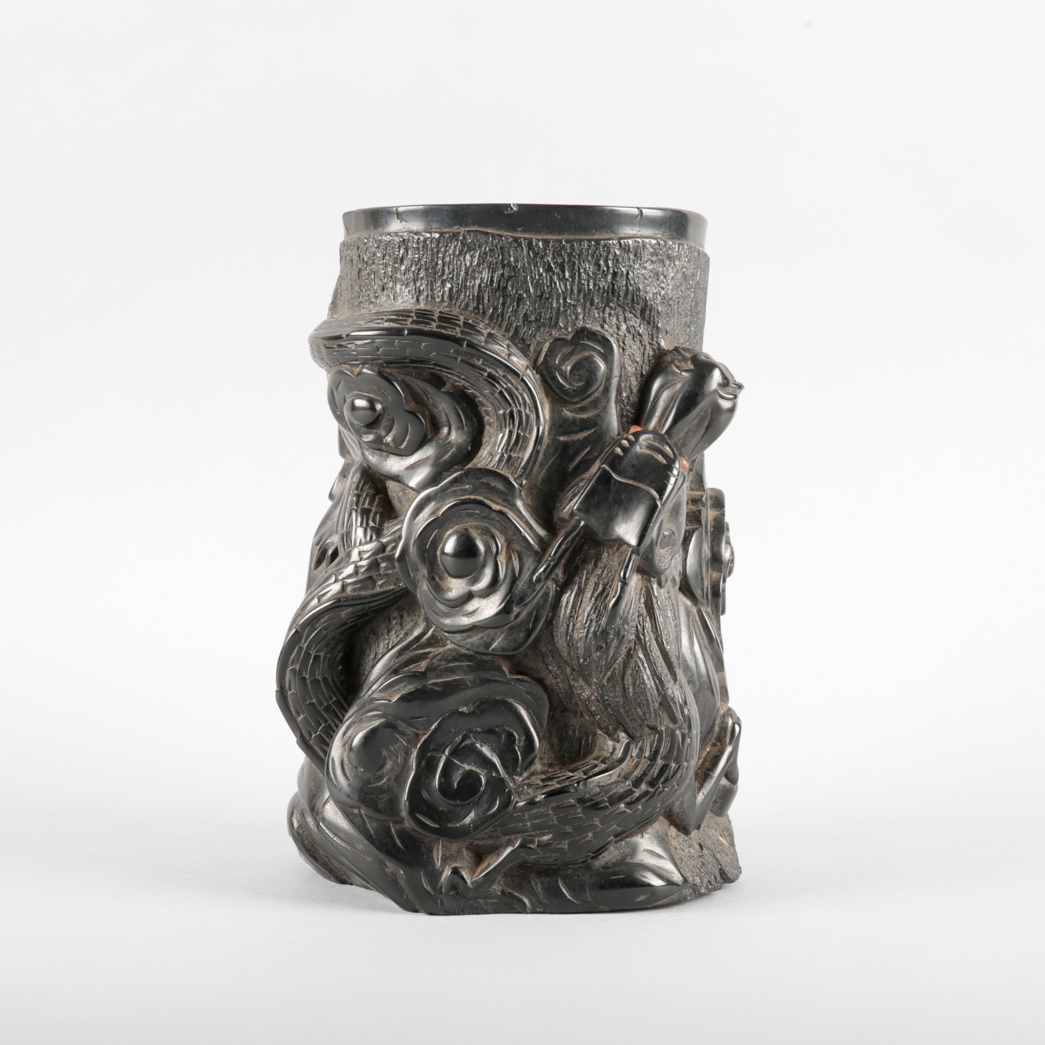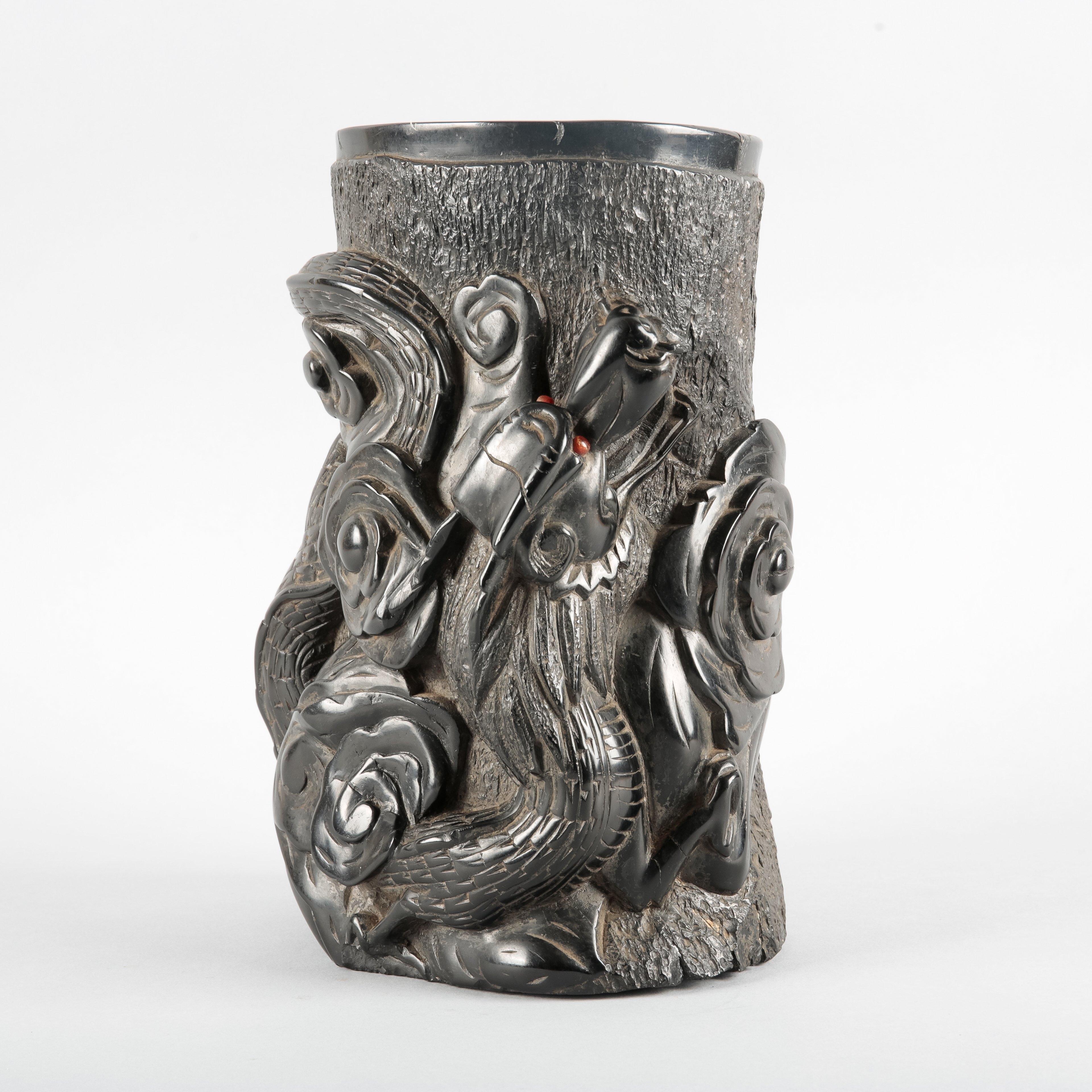 A LARGE BLACK LACQUER RESIN 'DRAGON' BRUSH POT